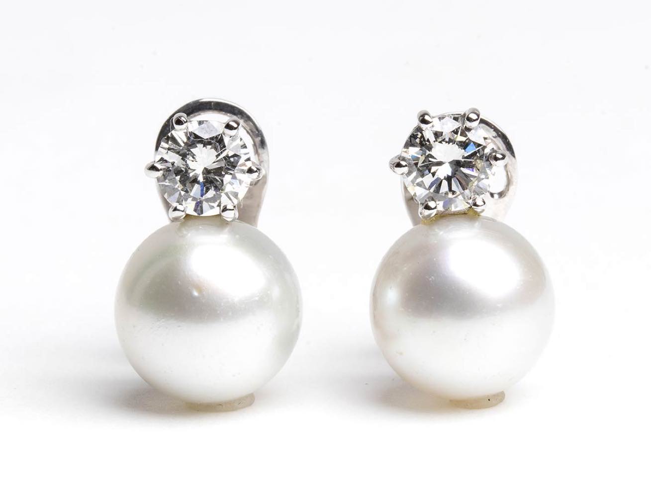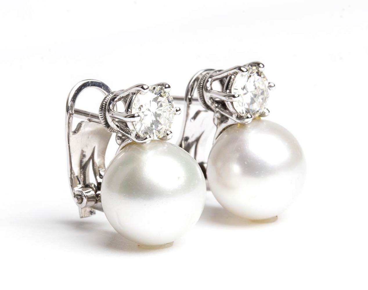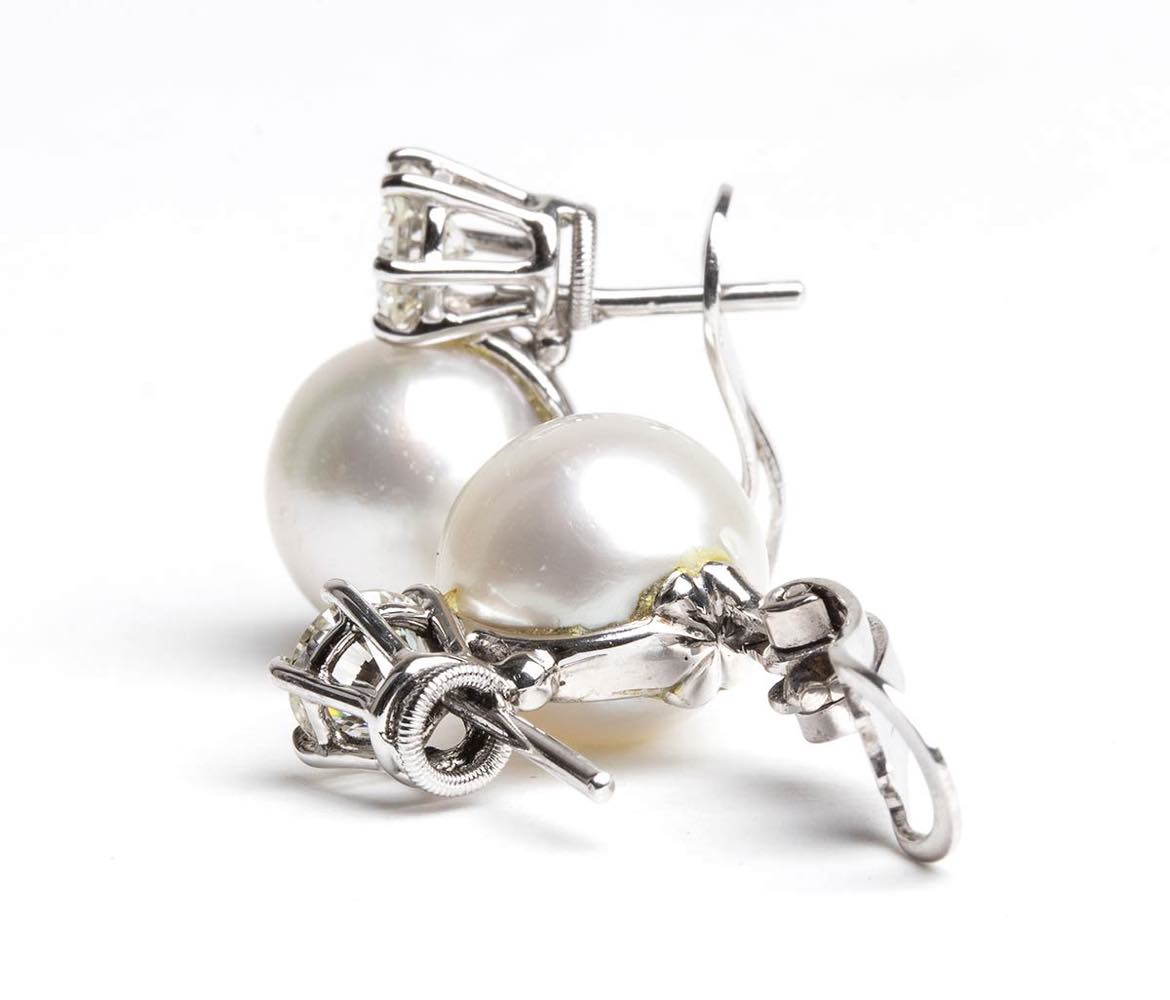 oro bianco 18k, ciascuno con perla Australiana sormontata da diamante. Diametro perle 10,5-11 mm. 2 Diamanti di forma rotanda taglio brillante 1,00 ct totali circa.