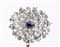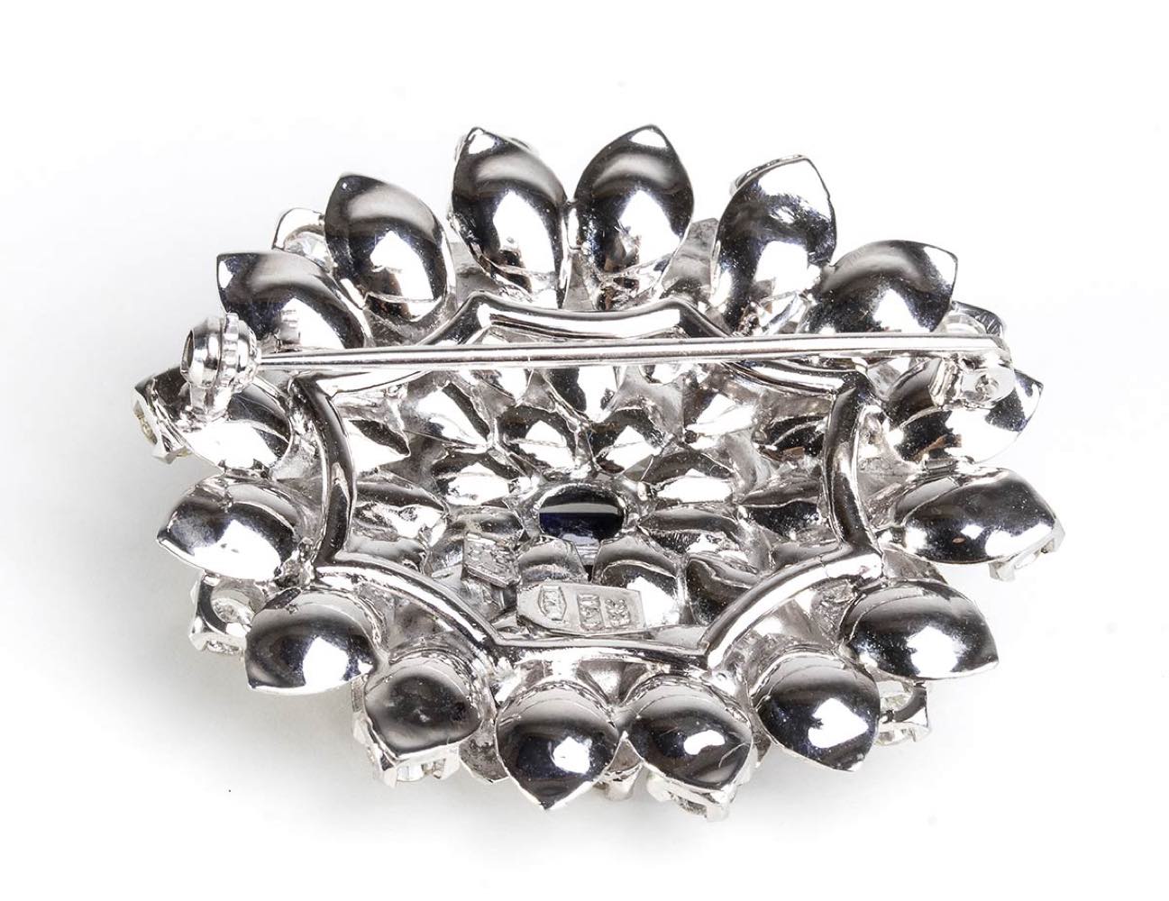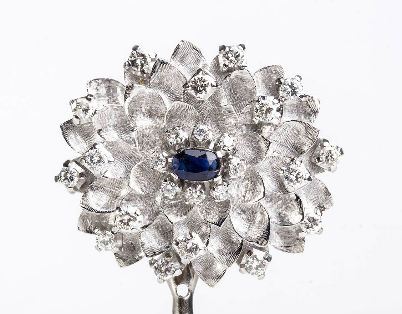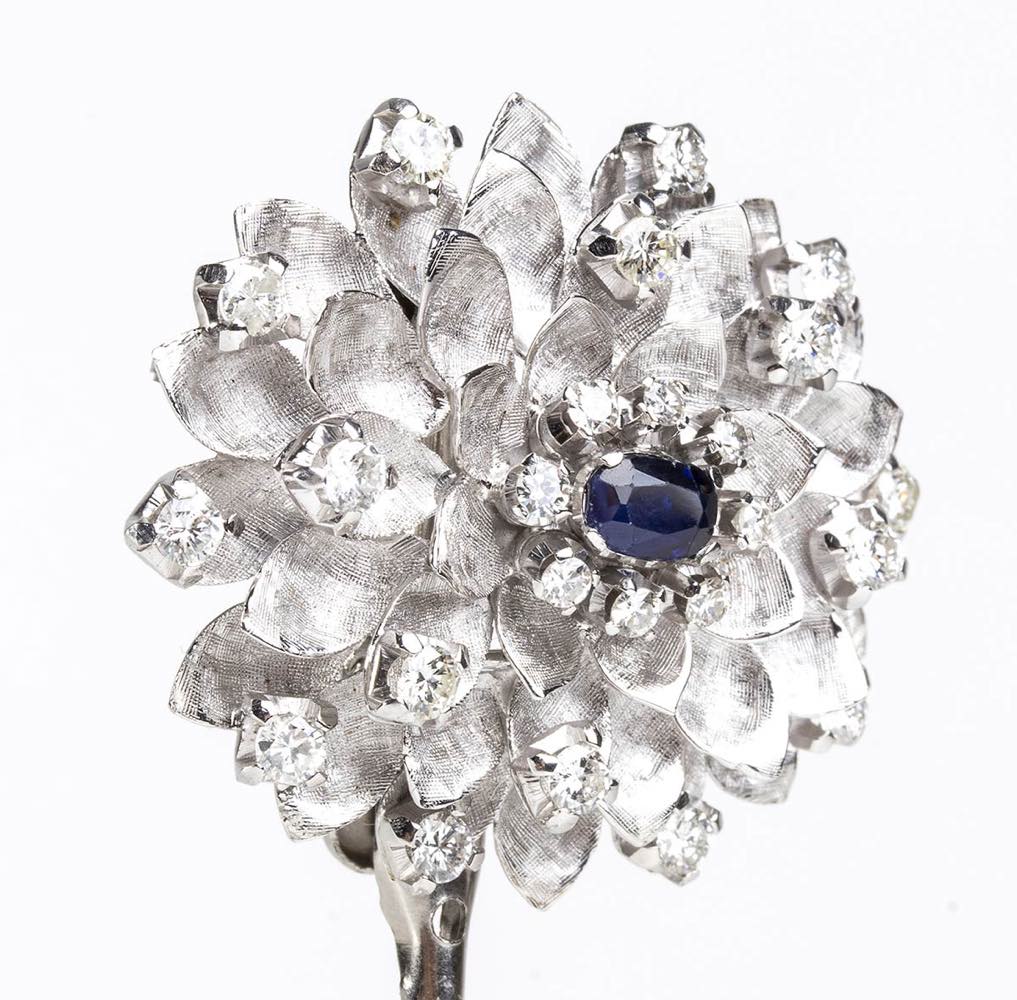 oro bianco 18k, motivo a fiore con finitura satinata, incastonato con zaffiro ovale 0,80 ct circa e diamanti rotondi taglio brillante 2,80 ct circa, F-G, VVS-VS. Punzonato "18k - MADE IN ITALY - 1021 AL".