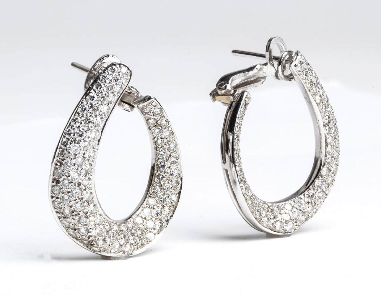 oro bianco 18k, incastonati con pavè di diamanti rotondi taglio brillante 2,10 ct circa, F-G, VVS-VS.
