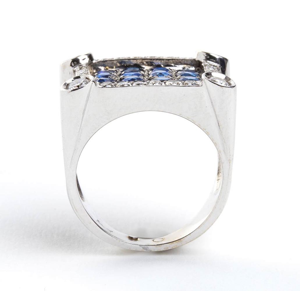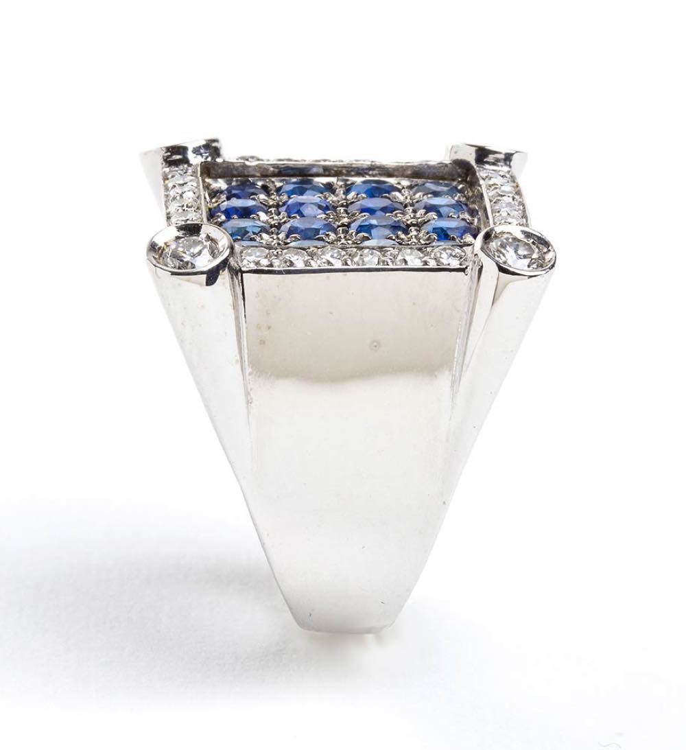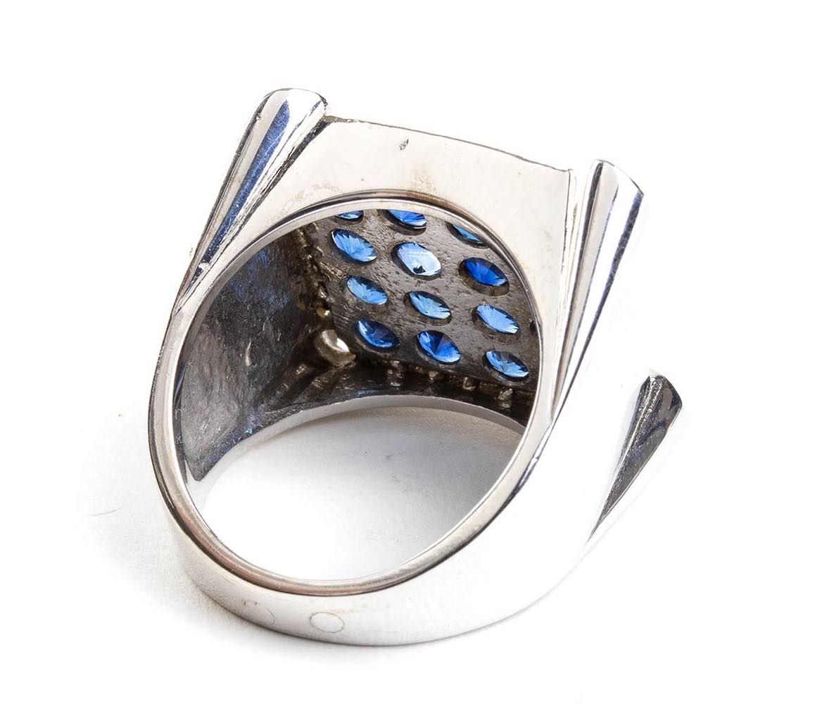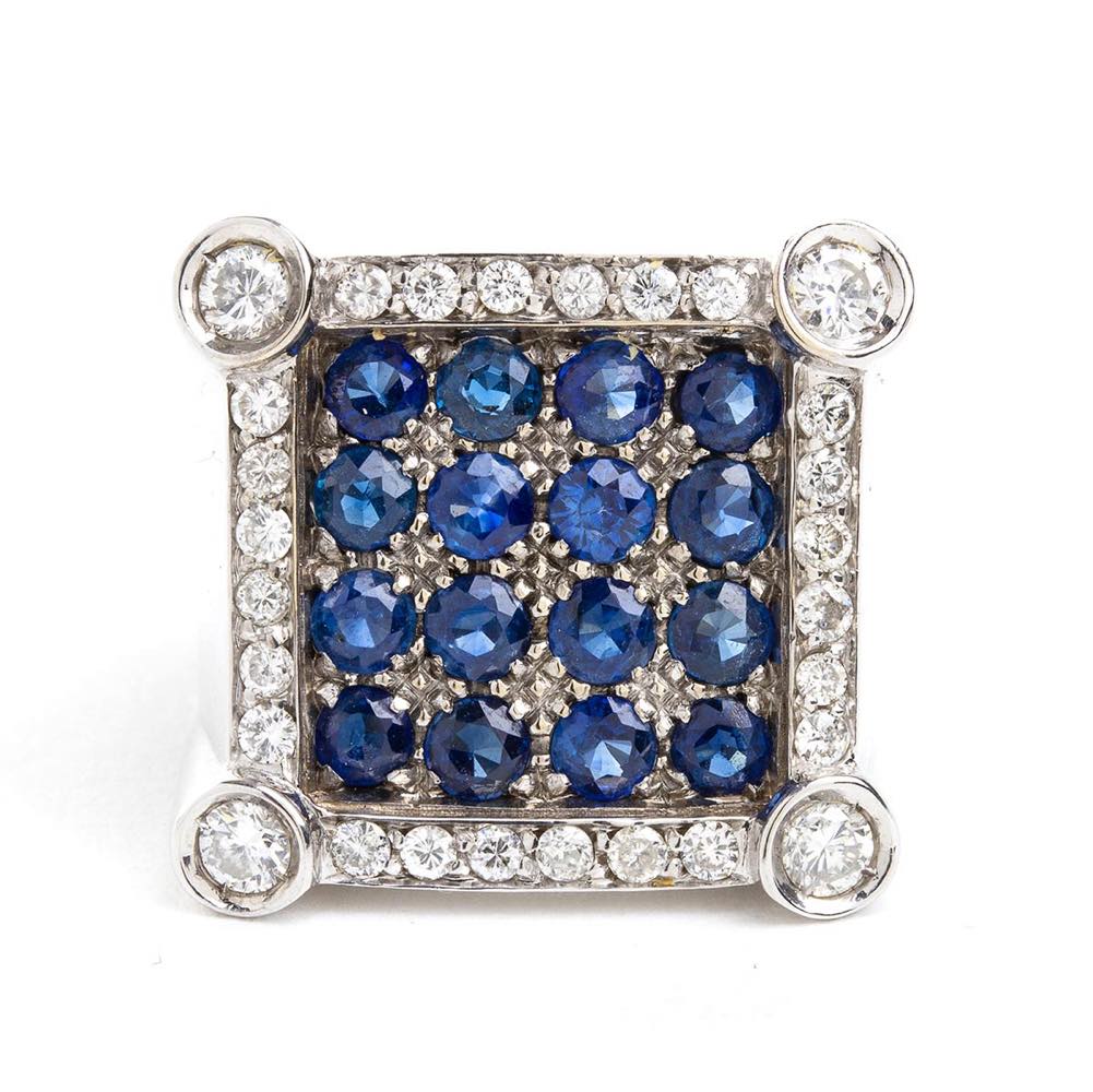 oro bianco 18k, motivo geometrico incastonato con pavè di zaffiri 1,60 ct circa, incornicioati da diamanto rotondi taglio brillante 0.80 ct circa, G-H, VS. Punzonato "750".