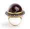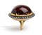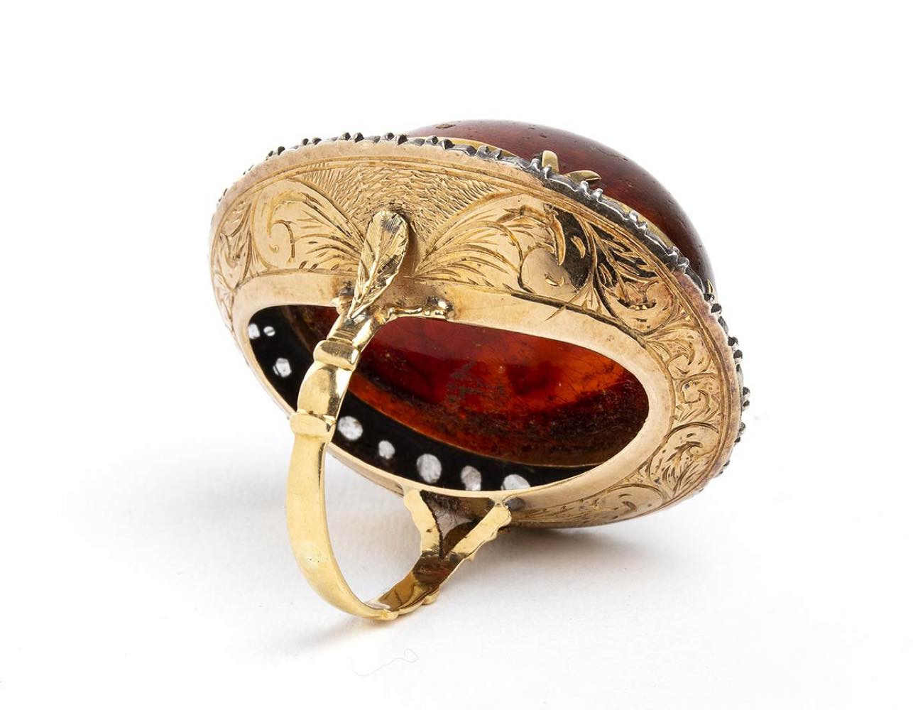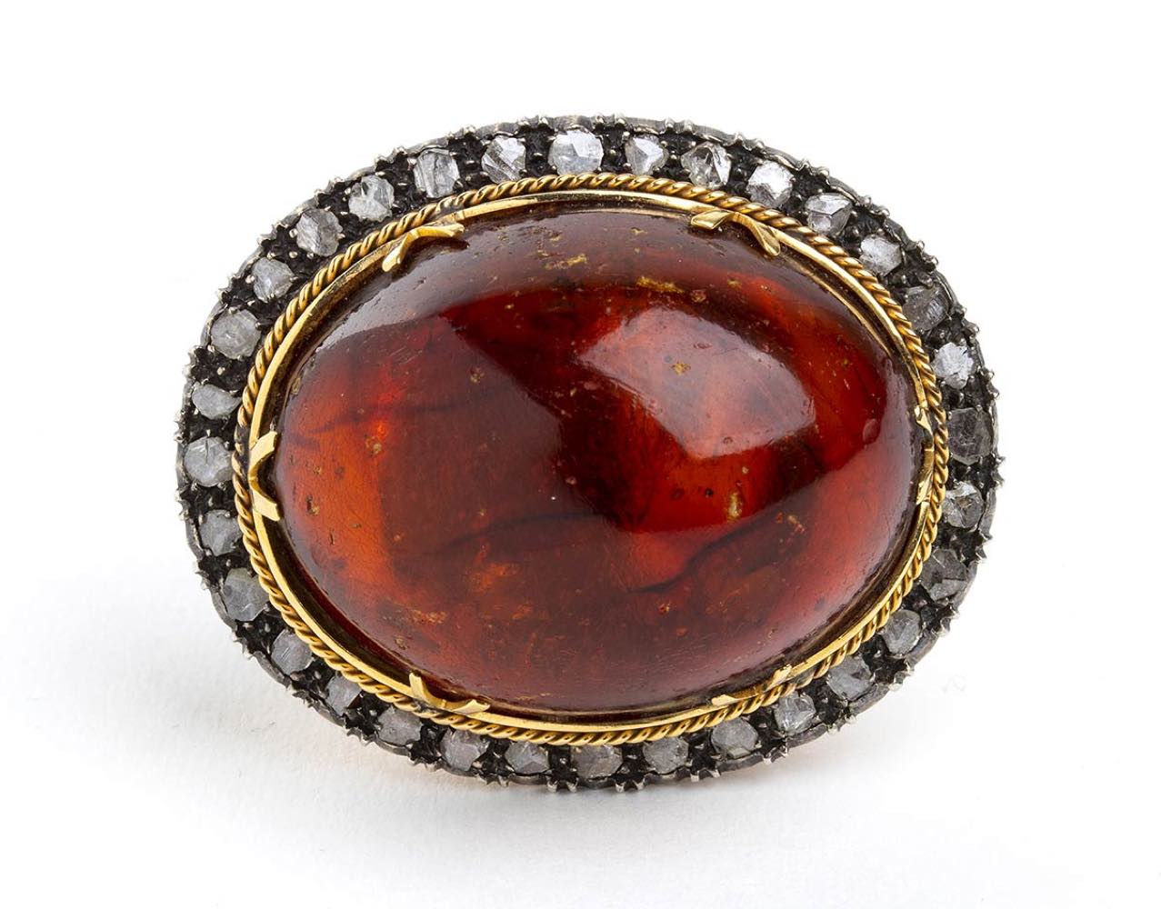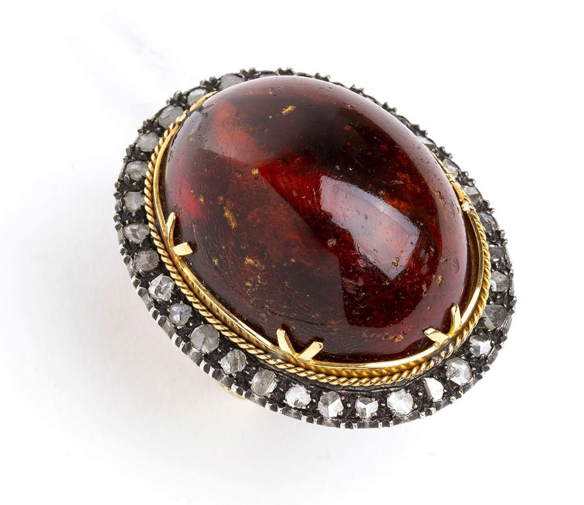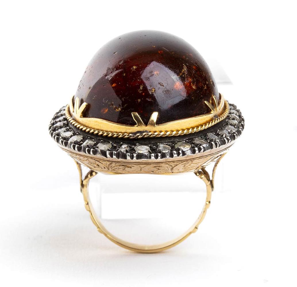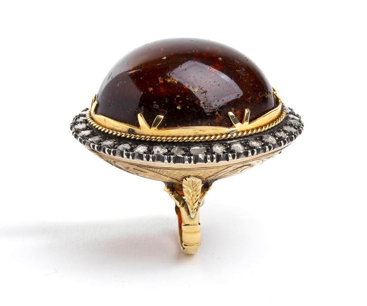 oro giallo 18k ed argento 800/1000, incastonato con grande cabochon di ambra dominicana incorniciata da diamanti taglio a rosa. Punzonato "750".