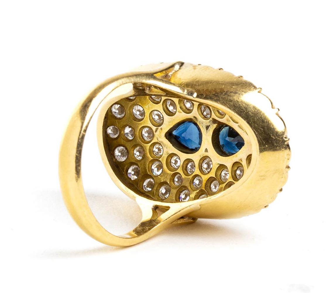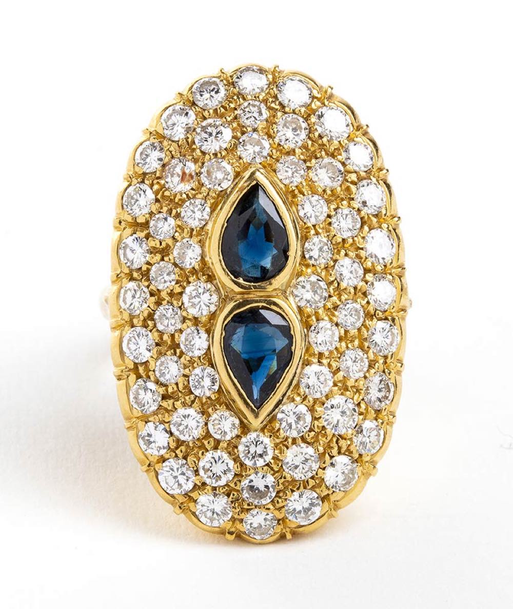 Anello in oro con coppia di zaffiri e pavè di diamanti