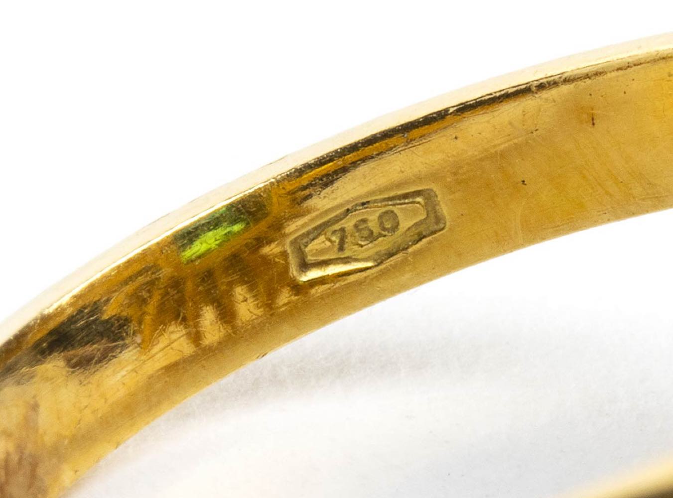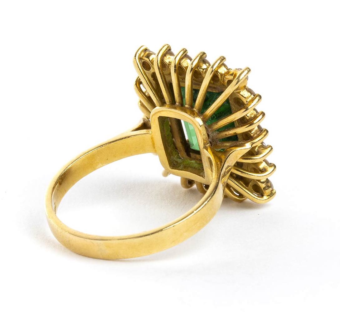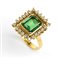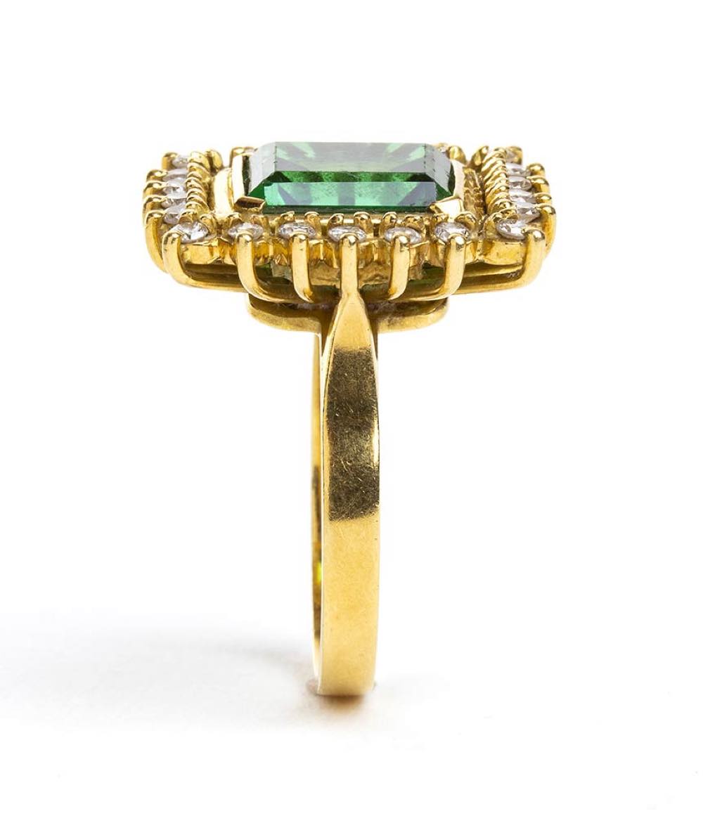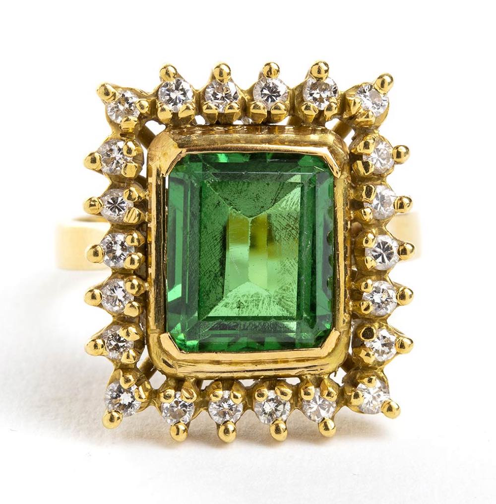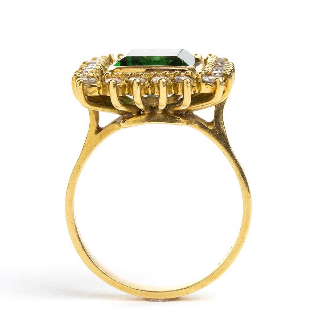 oro giallo 18k, di forma geometrica, incastonato con pasta vitrea verde incorniciata da 22 diamanti rotondi taglio brillante 0,70 ct circa, H-I, VVS. Punzonato "750".