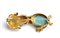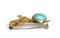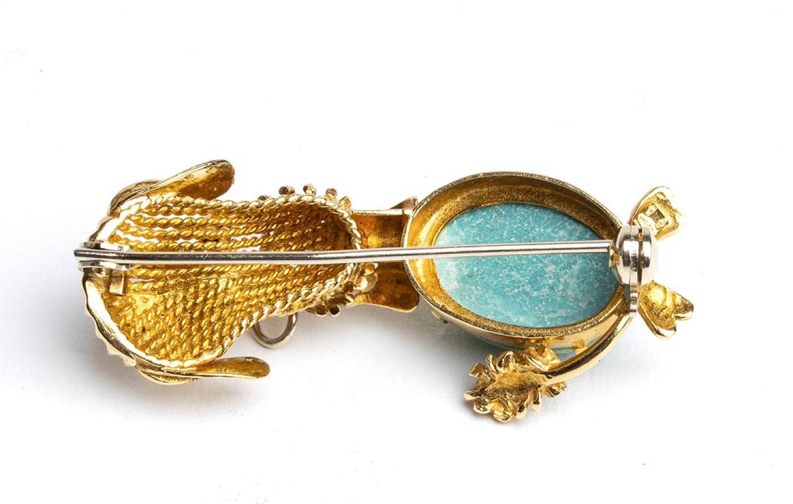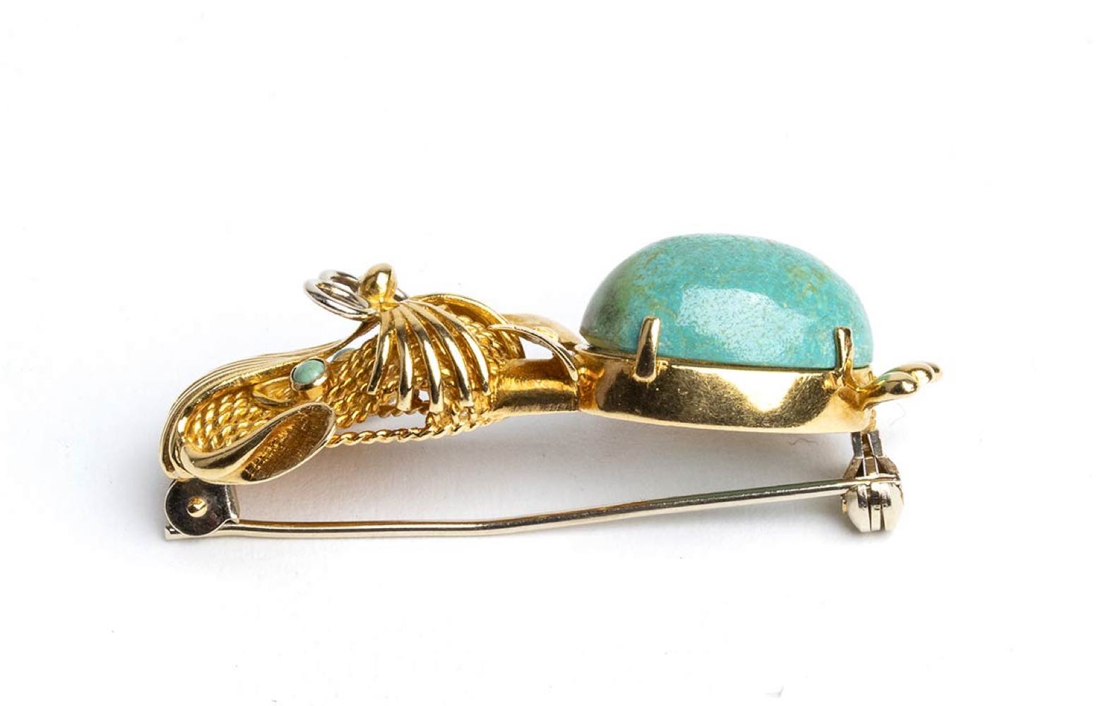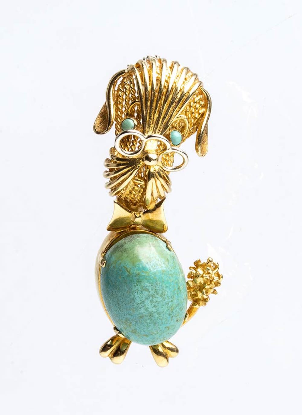 oro 18k. Raffigurante un cane stilizzato, corpo in cabochon di turchese. Punzonato "750 - 1 AR - UNO AR".