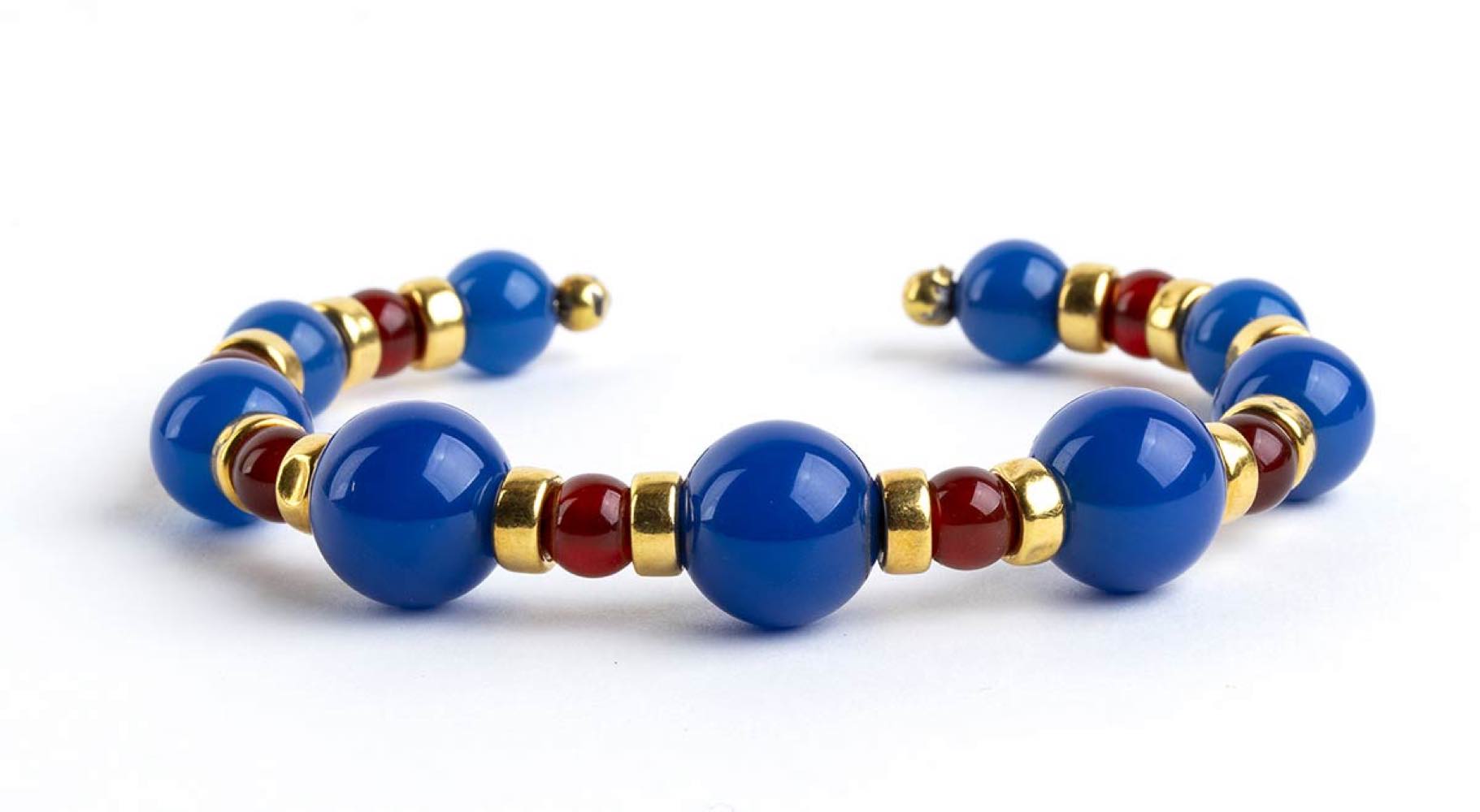 oro giallo 18k, con linea di sfere di calcedonio e corniola.