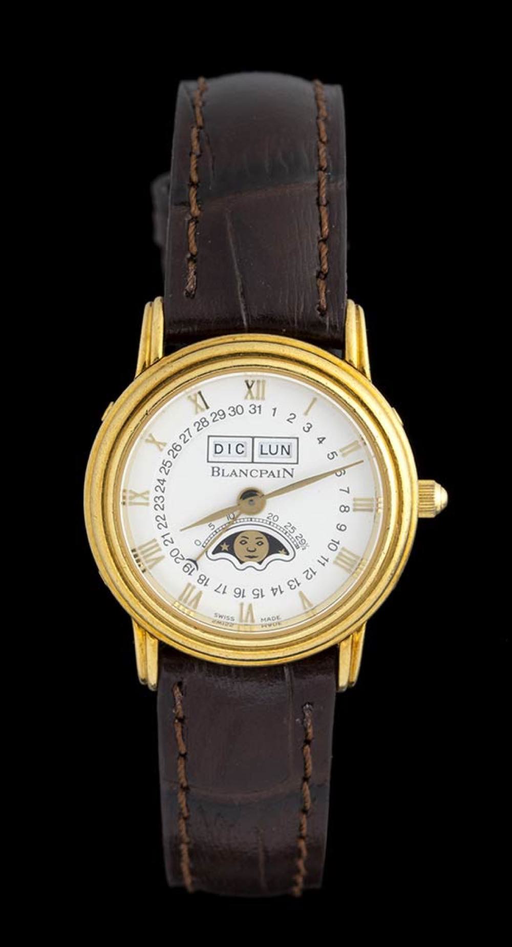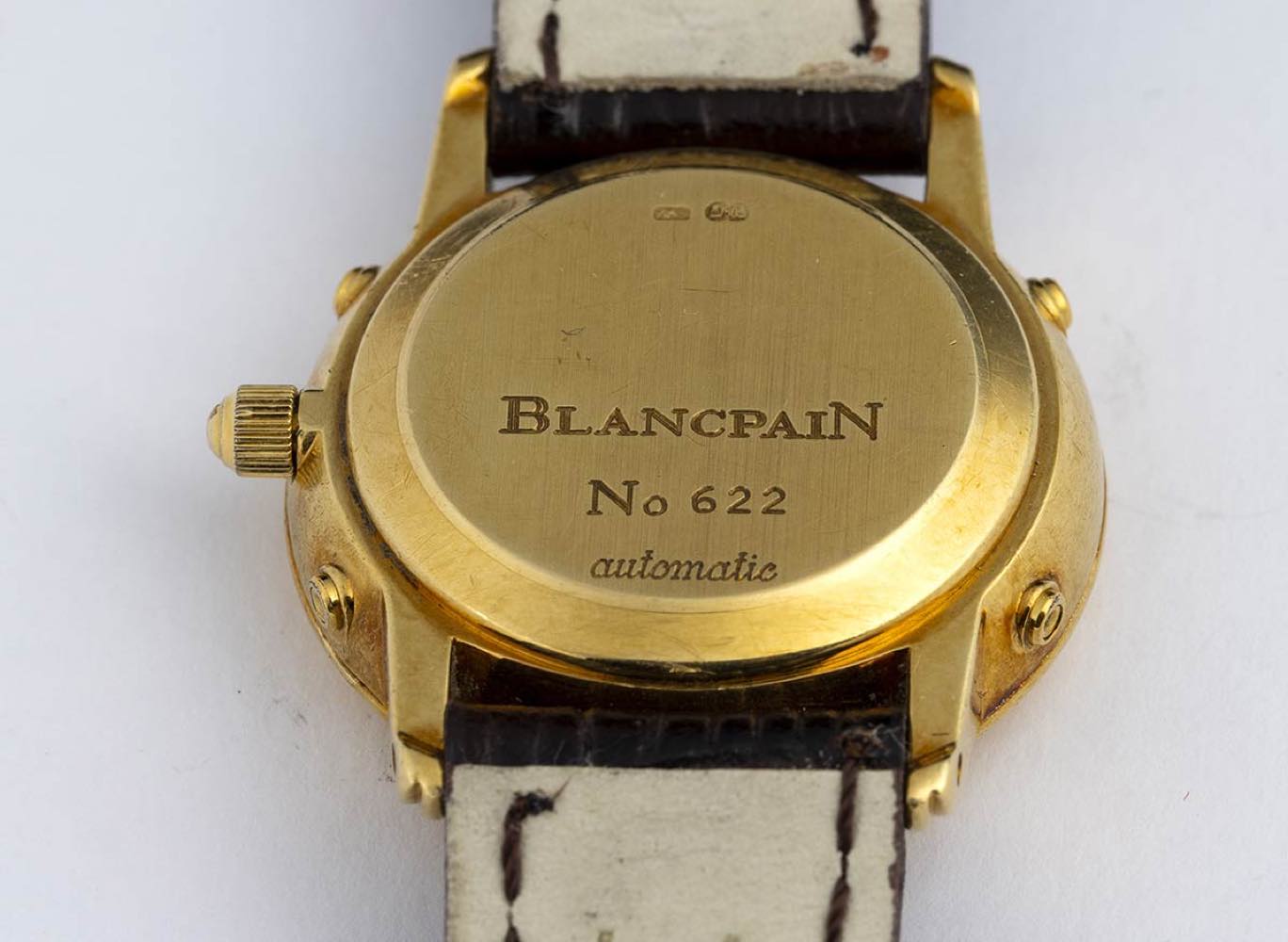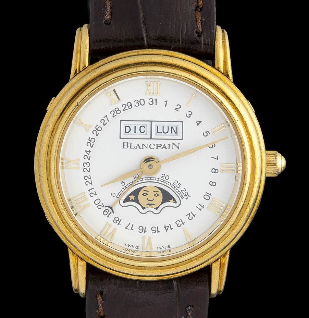 cassa in oro giallo 18k, quadrante bianco con numeri arabi e romani e sfere dorate firmato Blancpain con indicazioni giorno mese e fasi luna e data periferica, vetro zaffiro. Movimento meccanico a carica automatica. Il fondello presenta: Blancpain - No 622 - Atutomatic; bracciale in pelle con fibbia ad ardiglione originale in oro.