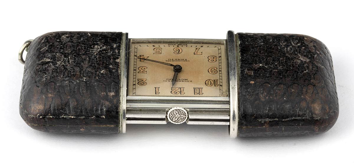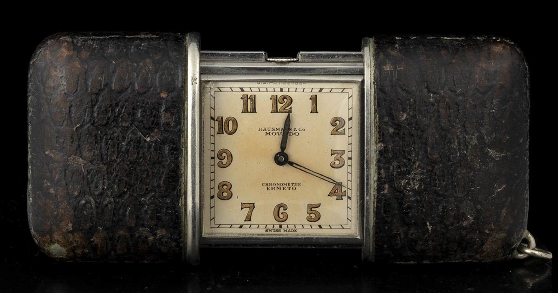 Orologio da borsa MOVADO ERMETO in metallo firmato "Hausmann & Co. Ermeto" La carica manuale avviane attraverso la chiusura e apertura delle due parti scorrevoli caratterizzate da una particolare lavorazione a mille righe. Quadrante, cassa e movimento firmati. Larghezza 48 mm - 73 mm aperto. Funzionante. Si tratta di un modello di orologio innovativo che, pur avendo ancora le caratteristiche di un orologio da tasca, può essere utilizzato com orologio da viaggio. Anzi verso gli anni '50 se ne faranno modelli di più grandi dimensioni per essere appoggiati su una scivania o su di un comodino accanto al letto. Annunciati nel 1926 si diffondono in tutto il mondo. Per lui viene coniato un nuovo termine "purse watch" (orologio da borsa) cioè un orologio che a differenza del "pocket watch" (l'orologio da tasca maschile) può essere anche un orologio da donna e da portare in borsetta.