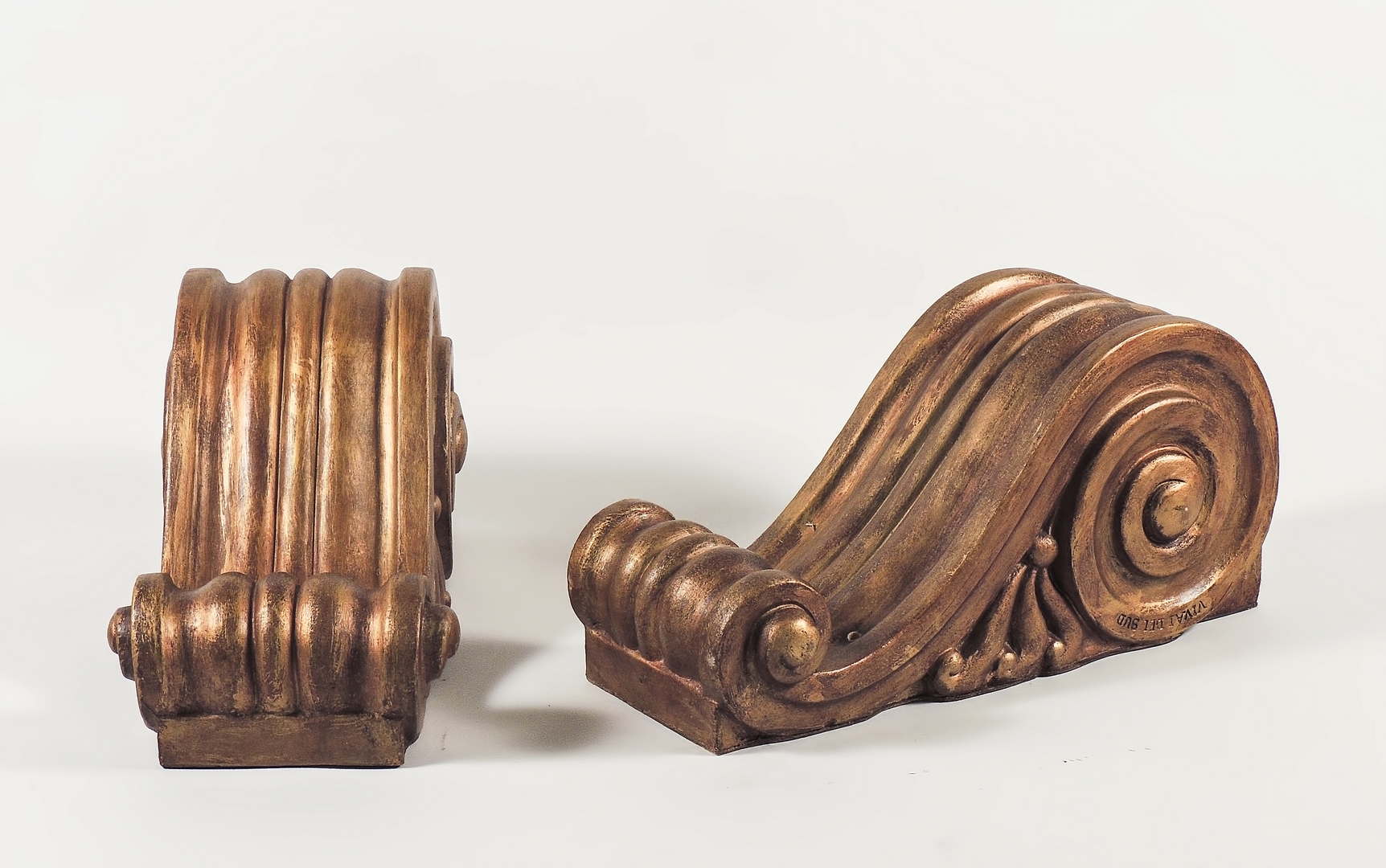 Lot 535 | COPPIA DI MENSOLONI IN TERRACOTTA DORATA realizzati come due grandi volute...