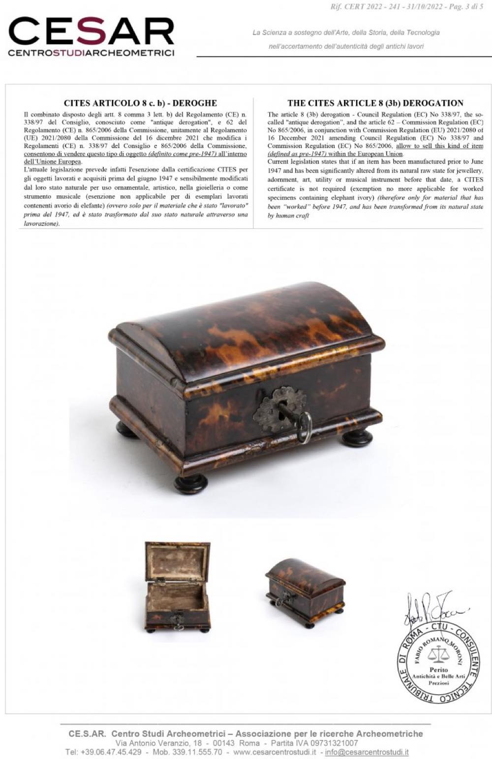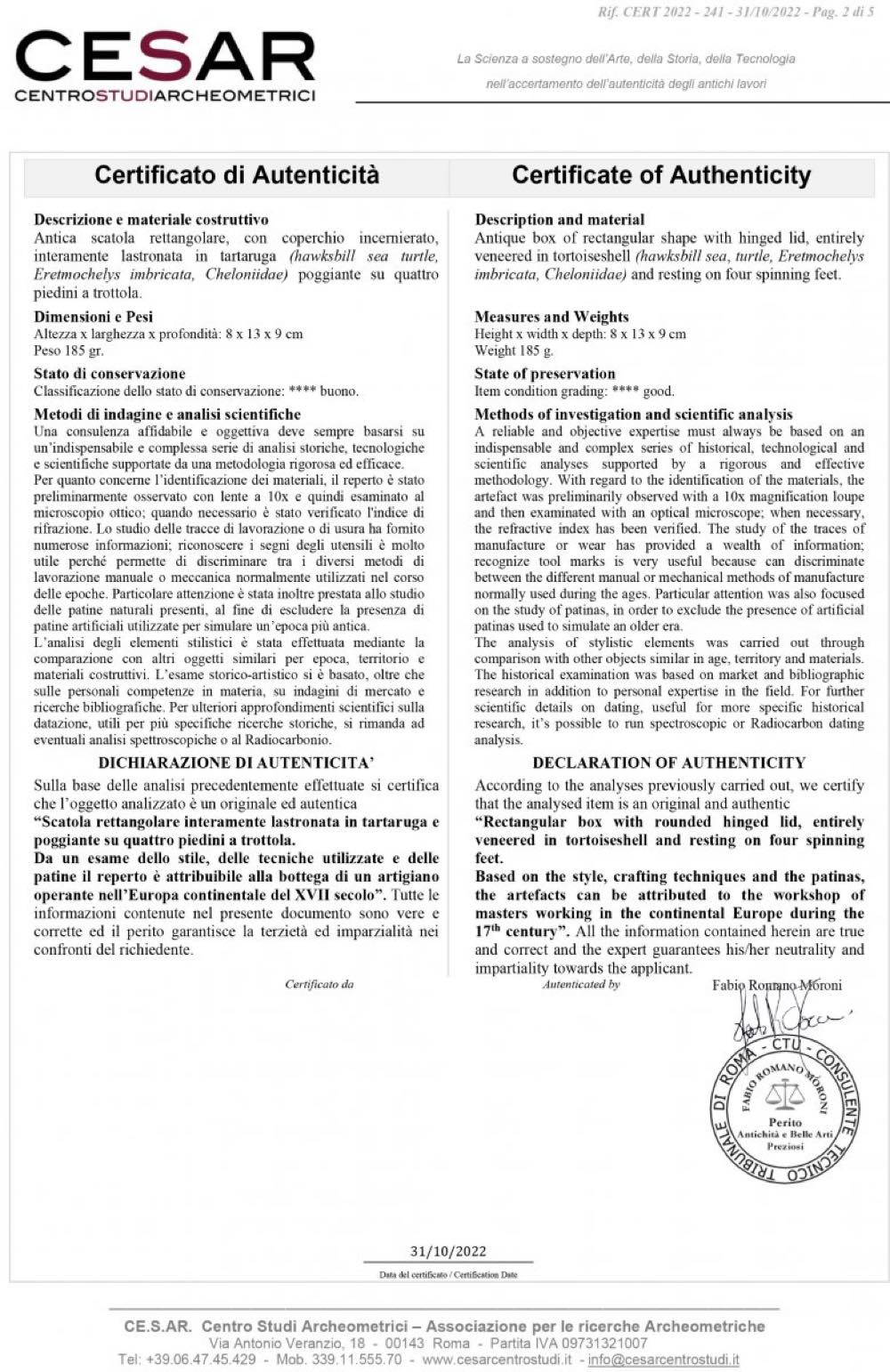 di forma rettangolare con coperchio stondato, interamente lastronata in tartaruga (hawksbill sea turtle, Eretmochelys imbricata, Cheloniidae) poggiante su quattro piedini a trottola.