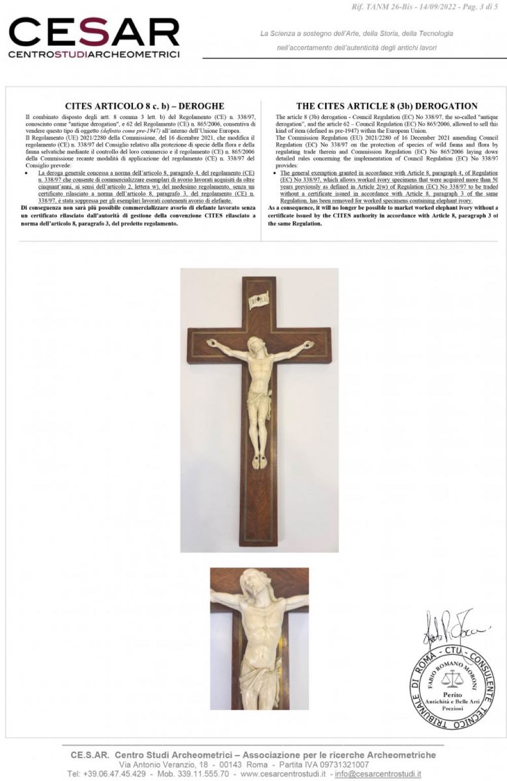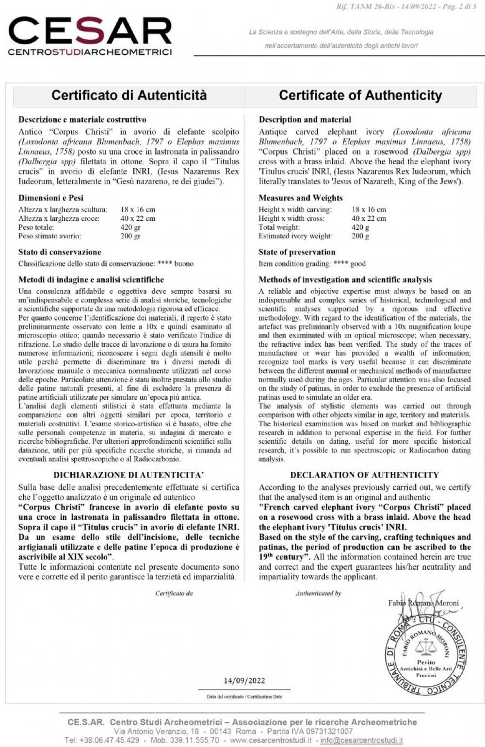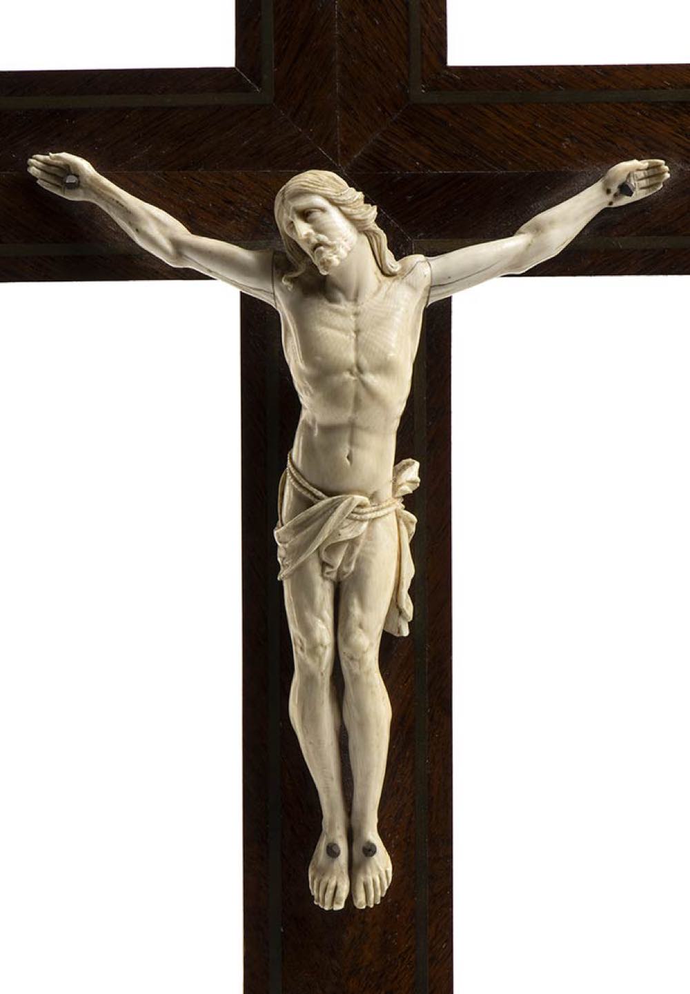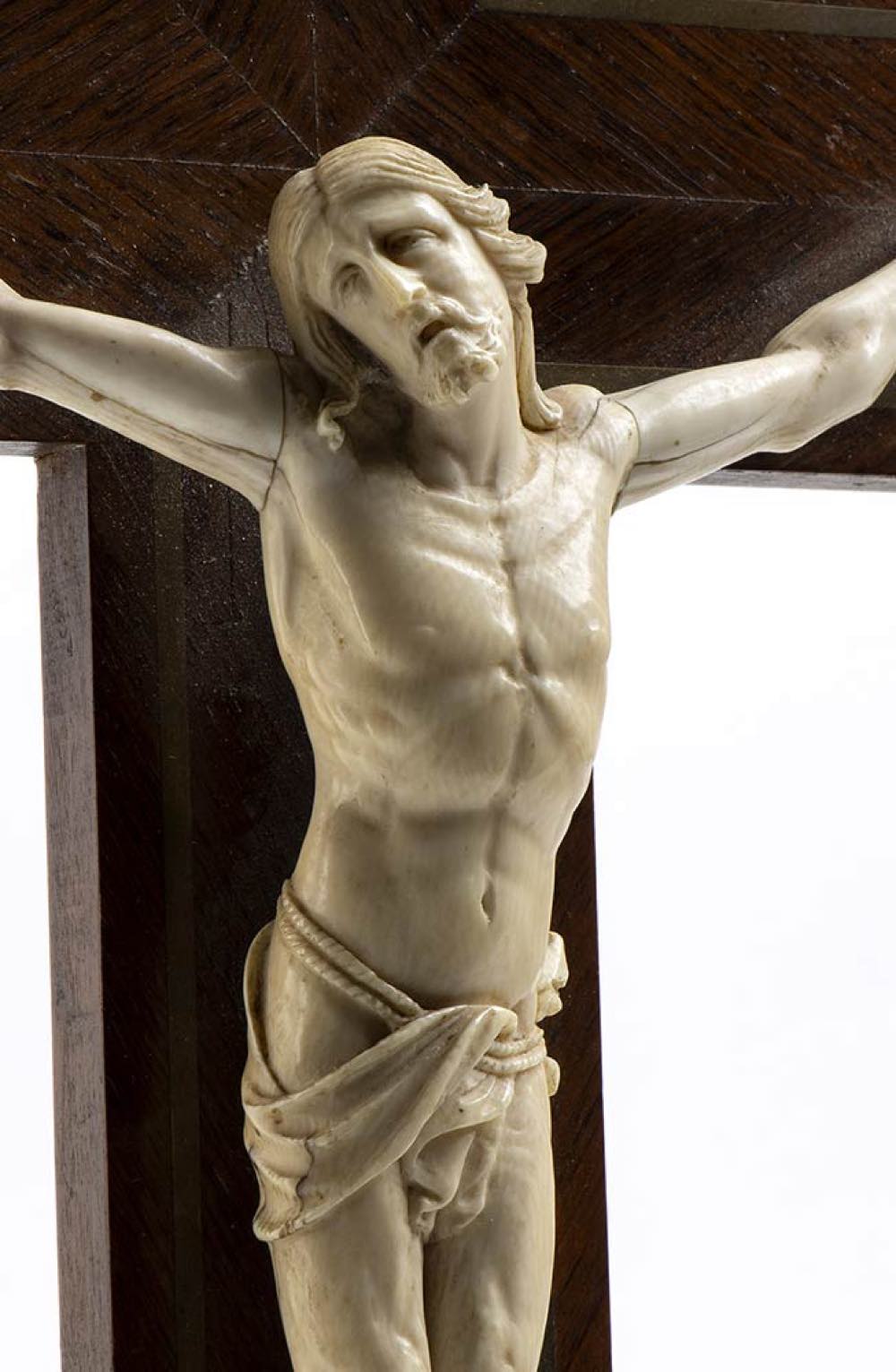 “Corpus Christi” in avorio di elefante scolpito (Loxodonta africana Blumenbach, 1797 o Elephas maximus Linnaeus, 1758) posto su una croce in lastronata in palissandro (Dalbergia spp) filettata in ottone. Sopra il capo il “Titulus crucis” in avorio di elefante INRI, (Iesus Nazarenus Rex Iudeorum, letteralmente in “Gesù nazareno, re dei giudei”).