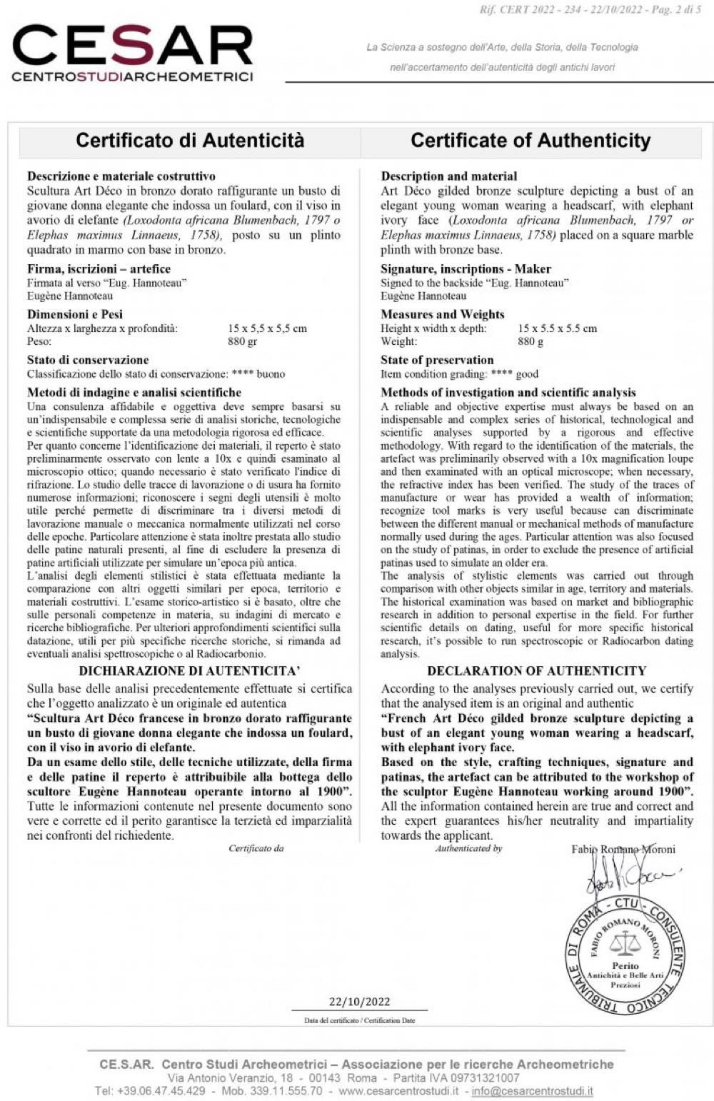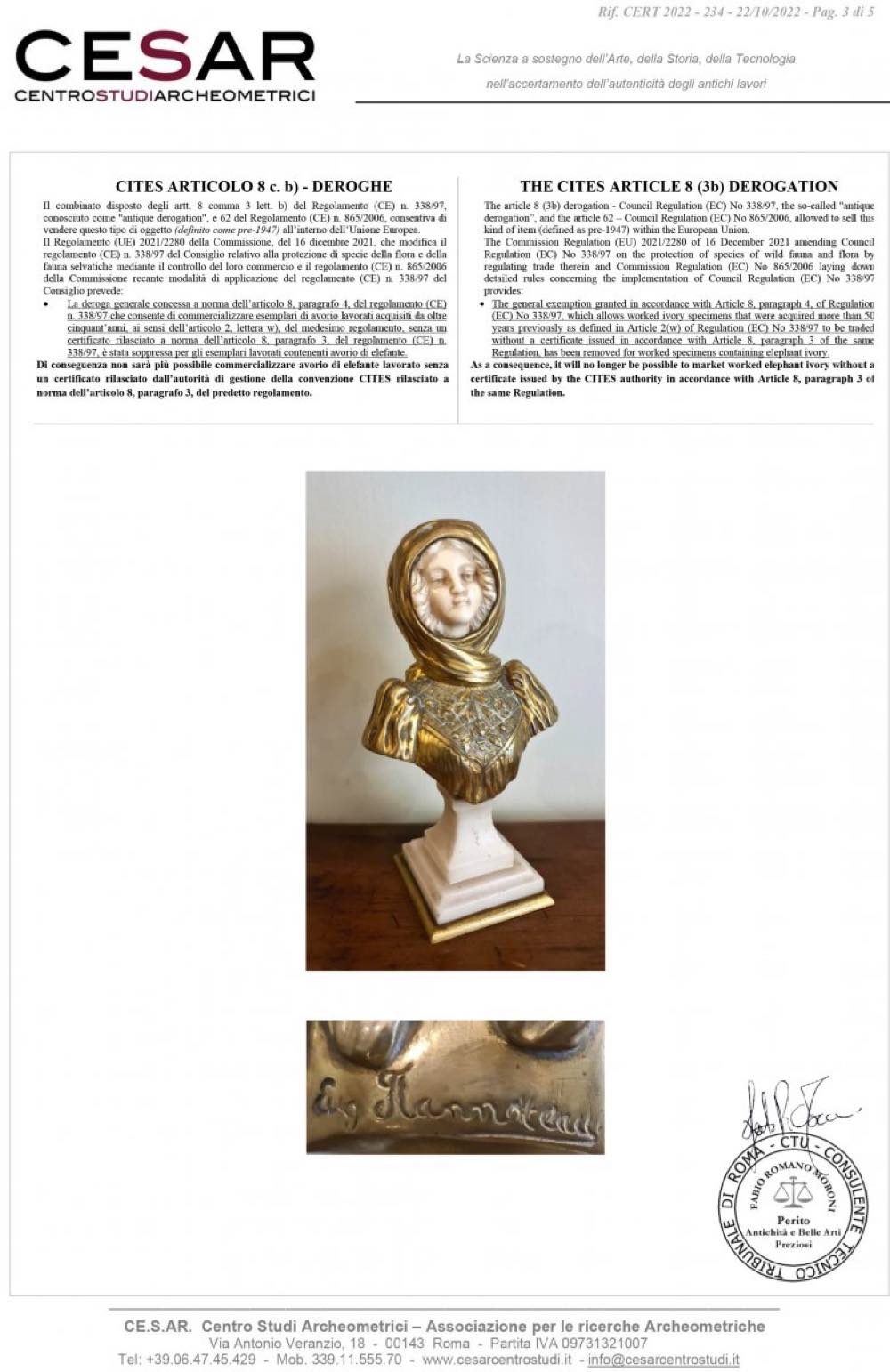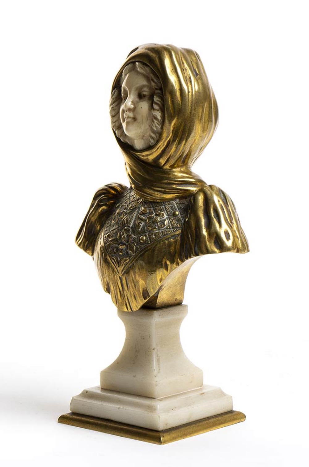 in bronzo dorato raffigurante un busto di giovane donna elegante che indossa un foulard, con il viso in avorio di elefante (Loxodonta africana Blumenbach, 1797 o Elephas maximus Linnaeus, 1758), posto su un plinto quadrato in marmo con base in bronzo.