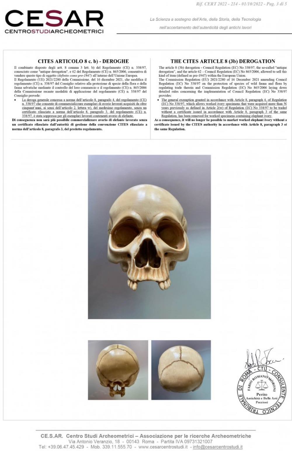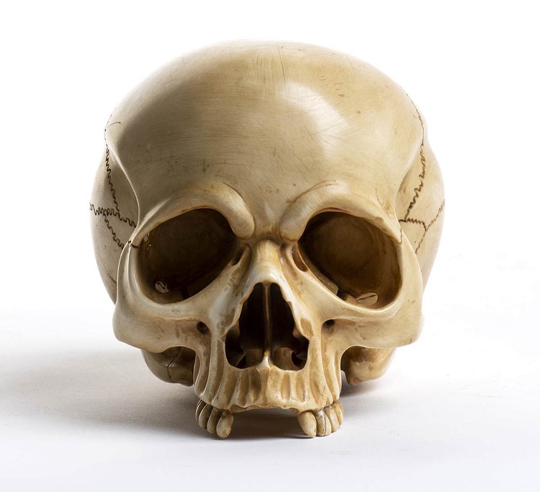 Memento Mori' in avorio di elefante (Loxodonta africana Blumenbach, 1797 o Elephas maximus Linnaeus, 1758) finemente intagliata a tutto tondo a raffigurare un teschio.