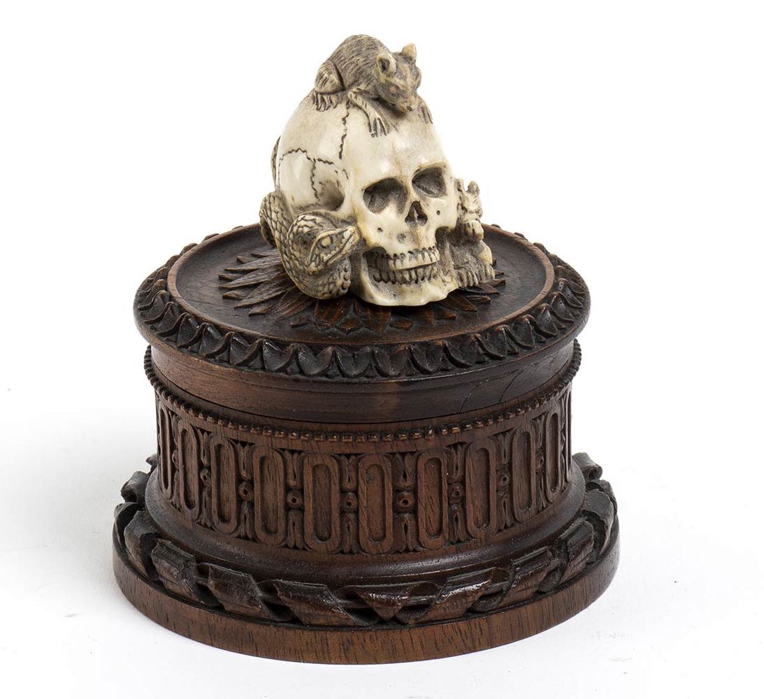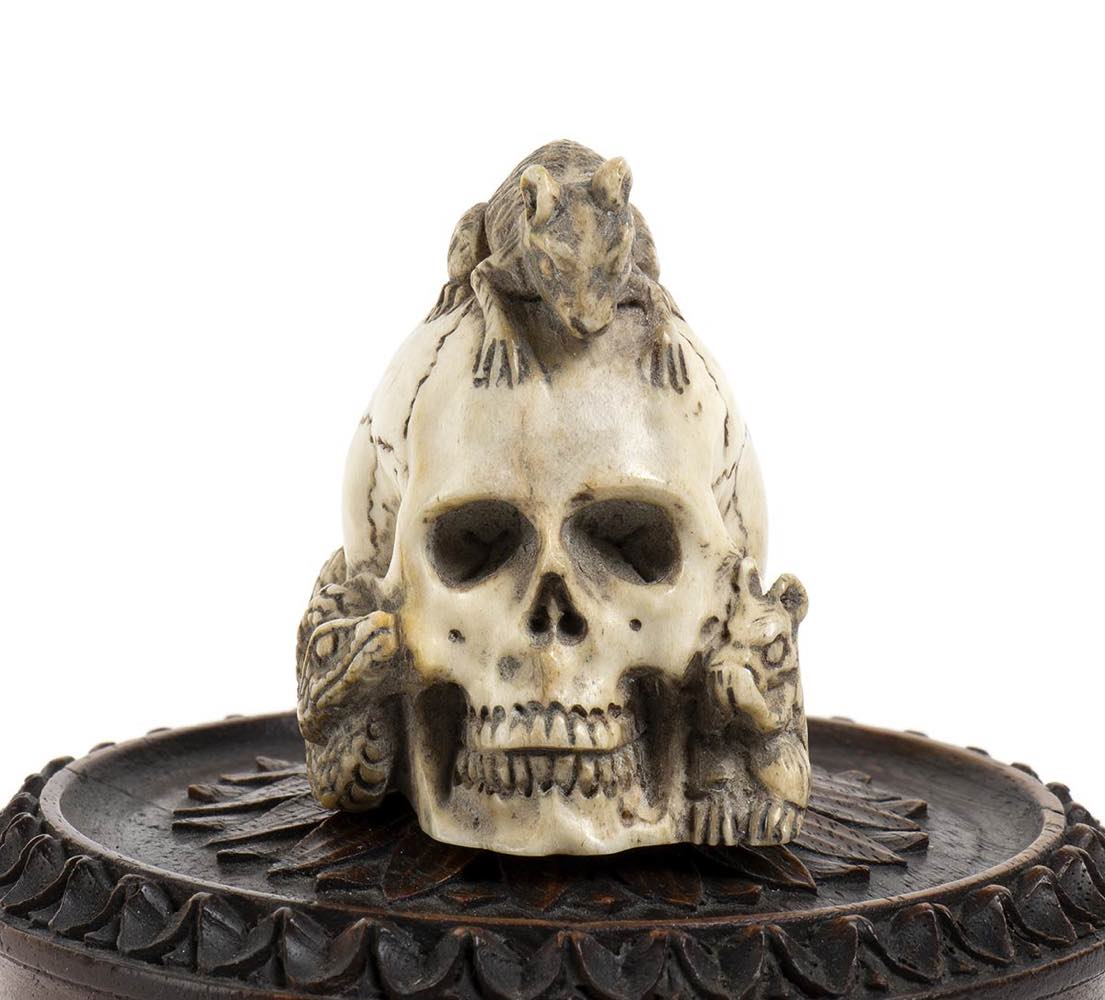 "Memento Mori", scatola con teschio tedesco in osso - XIX secolo