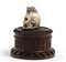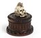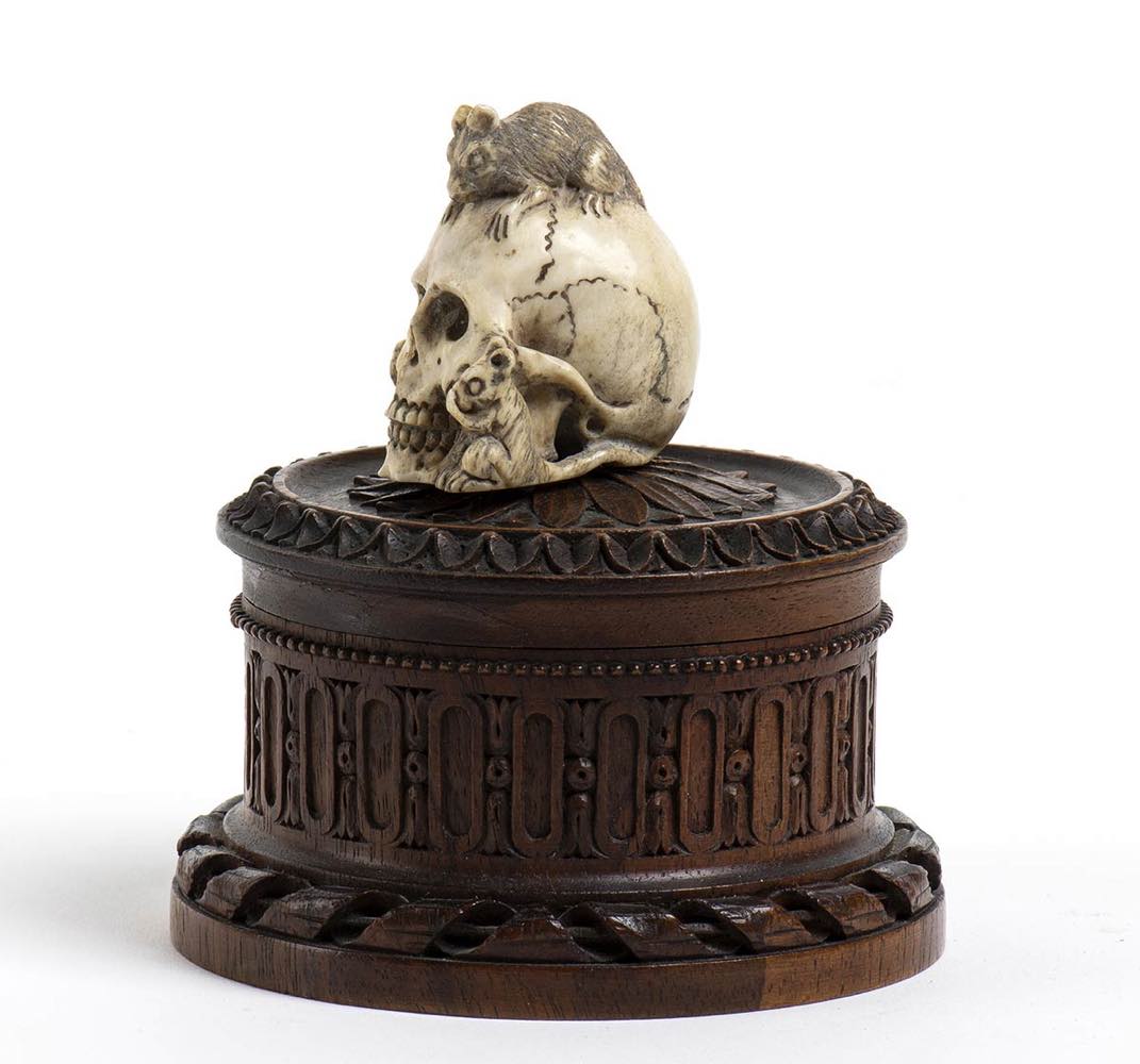 Memento Mori - Vanitas, scatola circolare in legno di mogano, coperchio con teschio in osso sormontato da un topo e affiancato da uno scoiattolo e da un serpente.