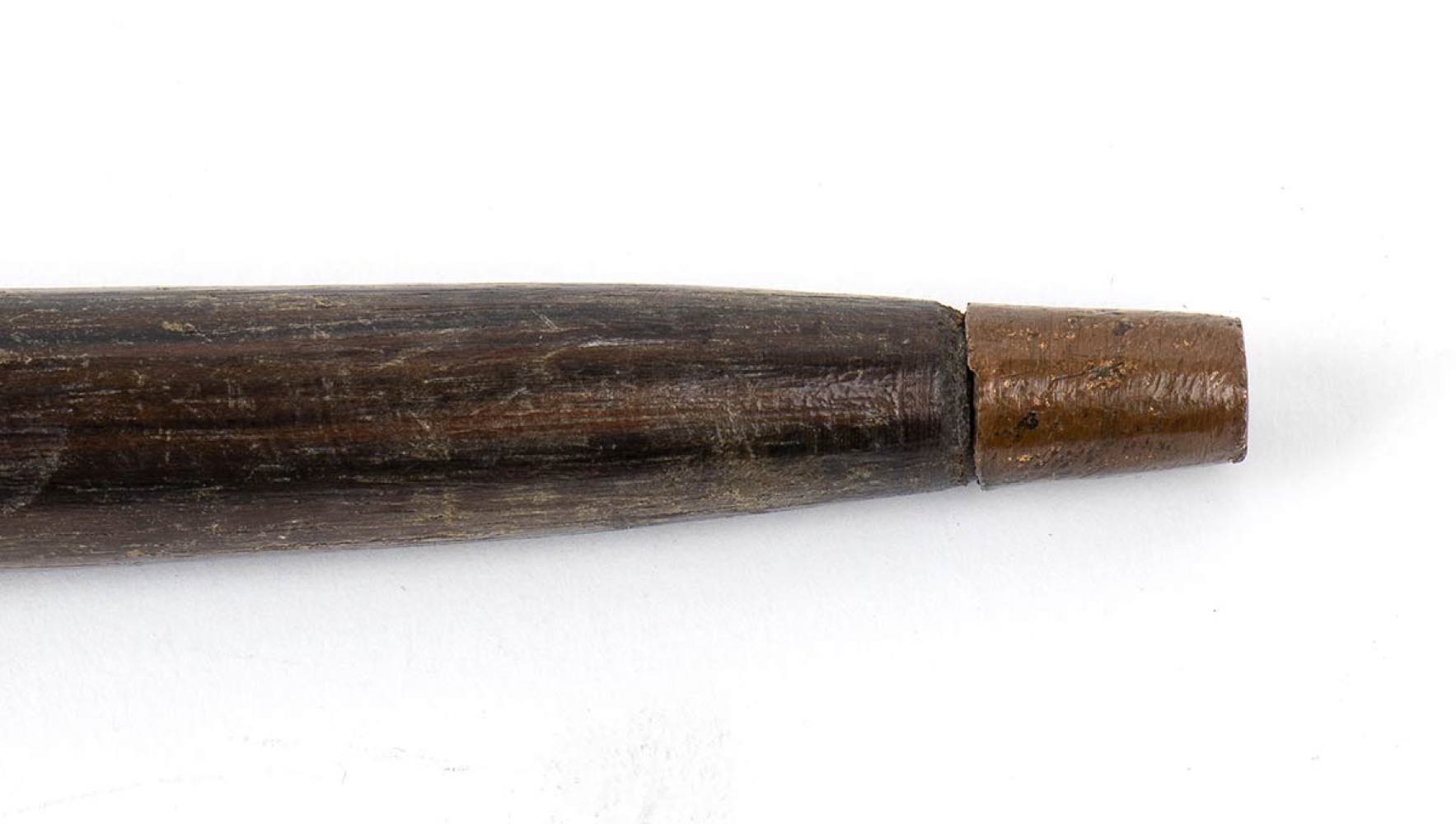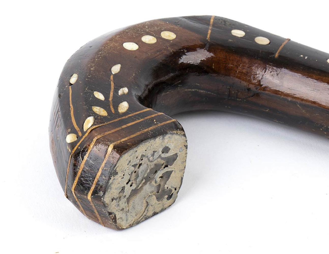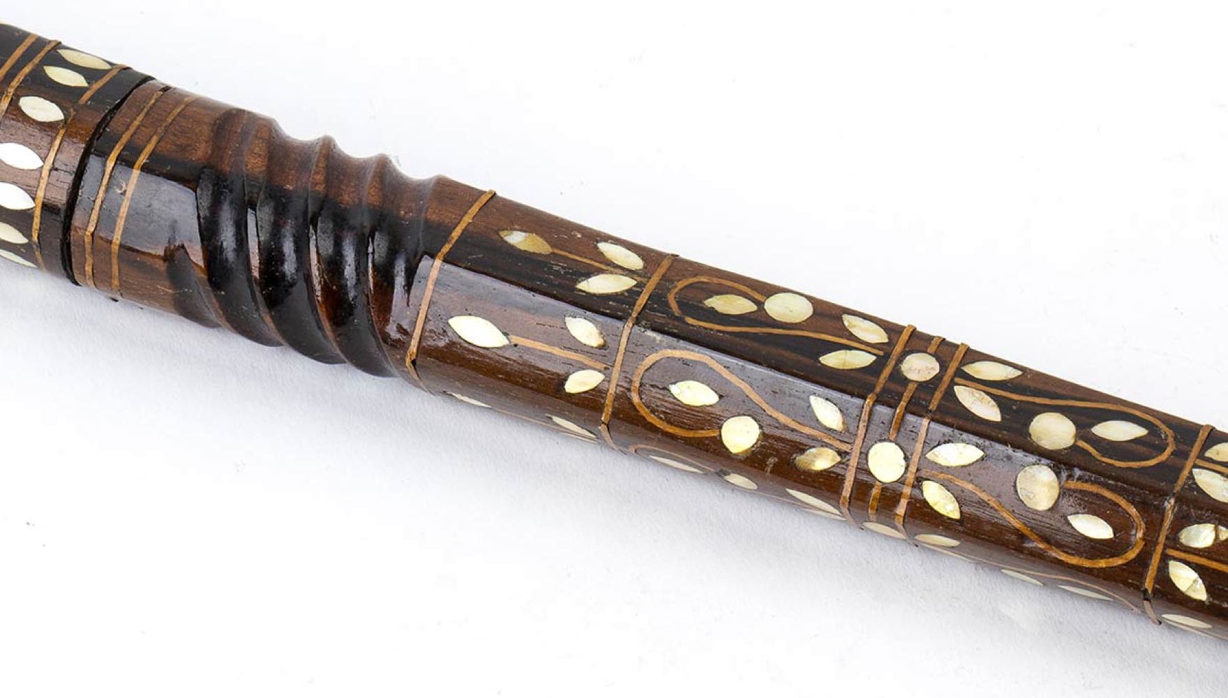 in palissandro (Dalbergia spp), fusto ottagonale alteranto ad elementi tortili, interamente con rami di ulivo in madreperla. Puntale in rame.