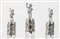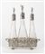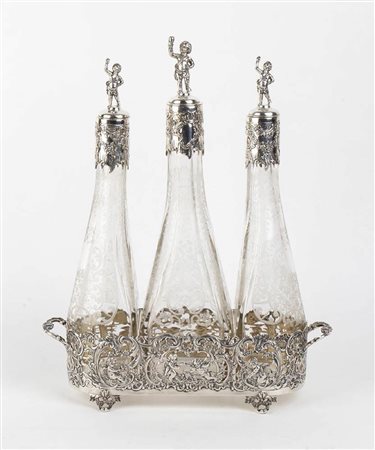 decanter tripartito, composto da tre bottiglie uguali in vetro inciso, su basamento in argento traforato e decorato con motivi rocaille poggiante su quattro piedini fogliati. Argento 800/1000, punzonato "800" e "Basios".