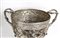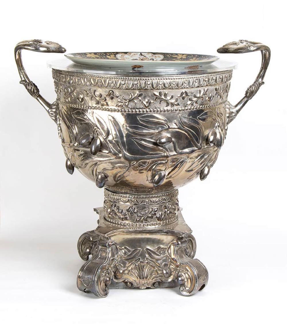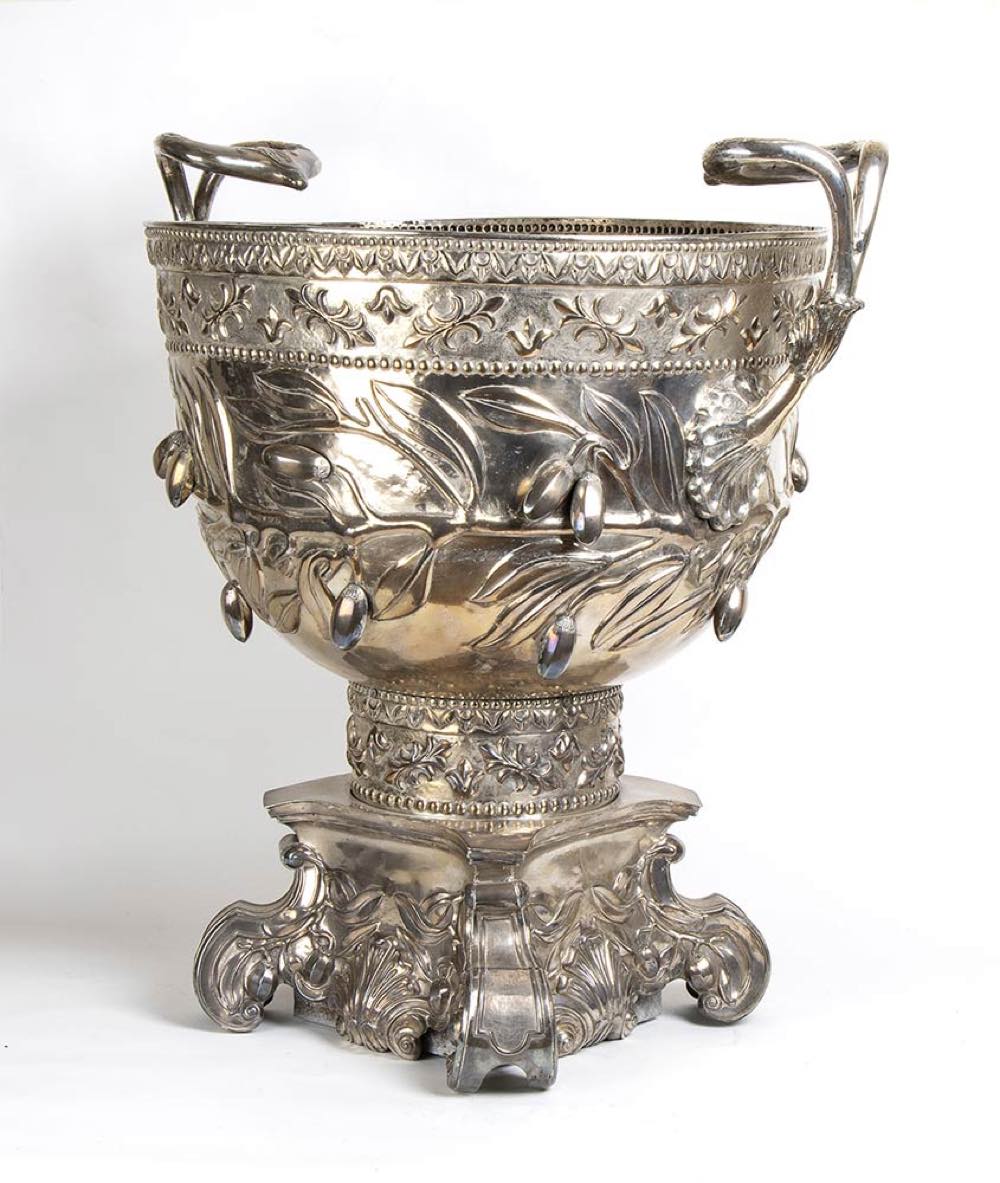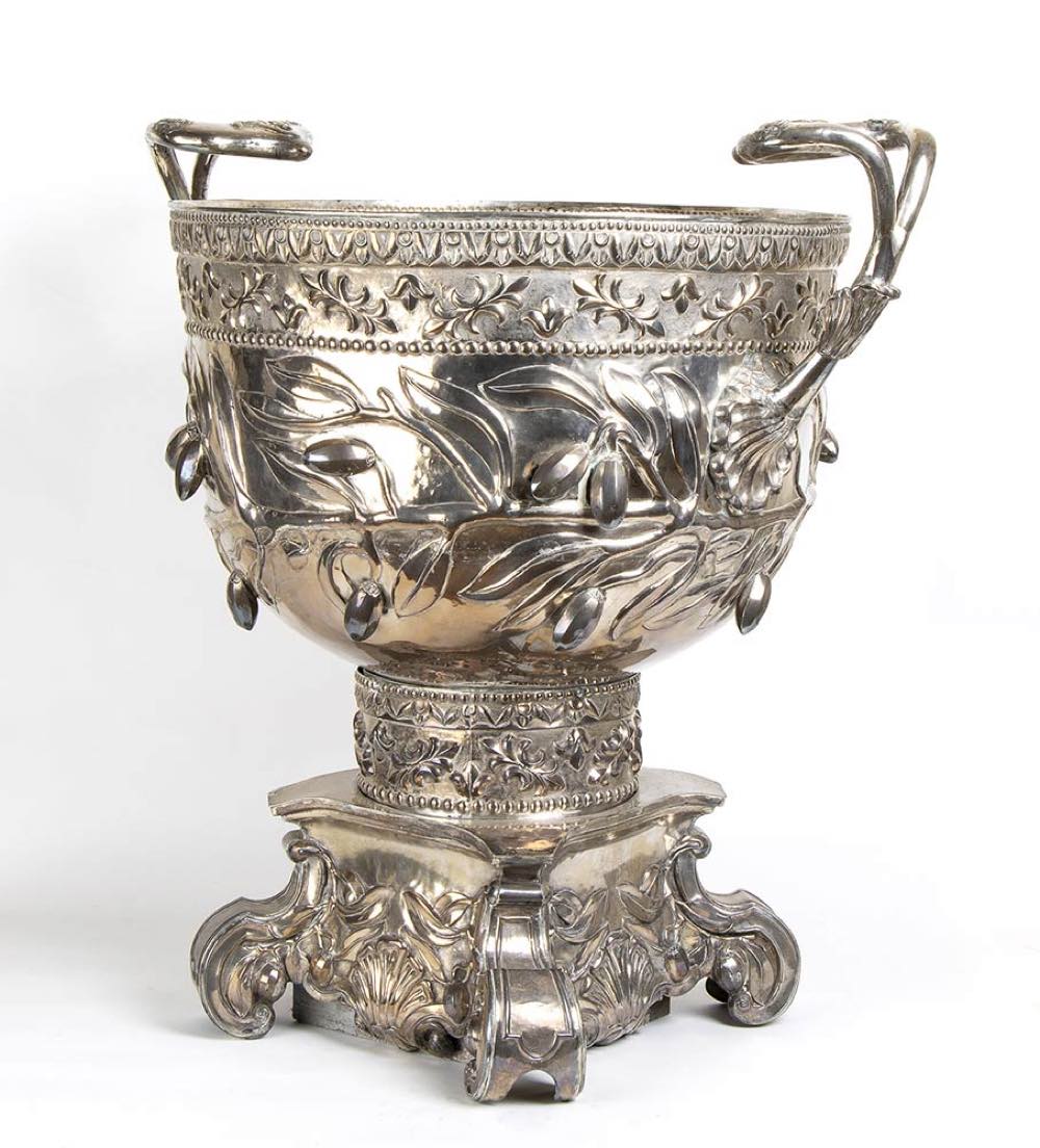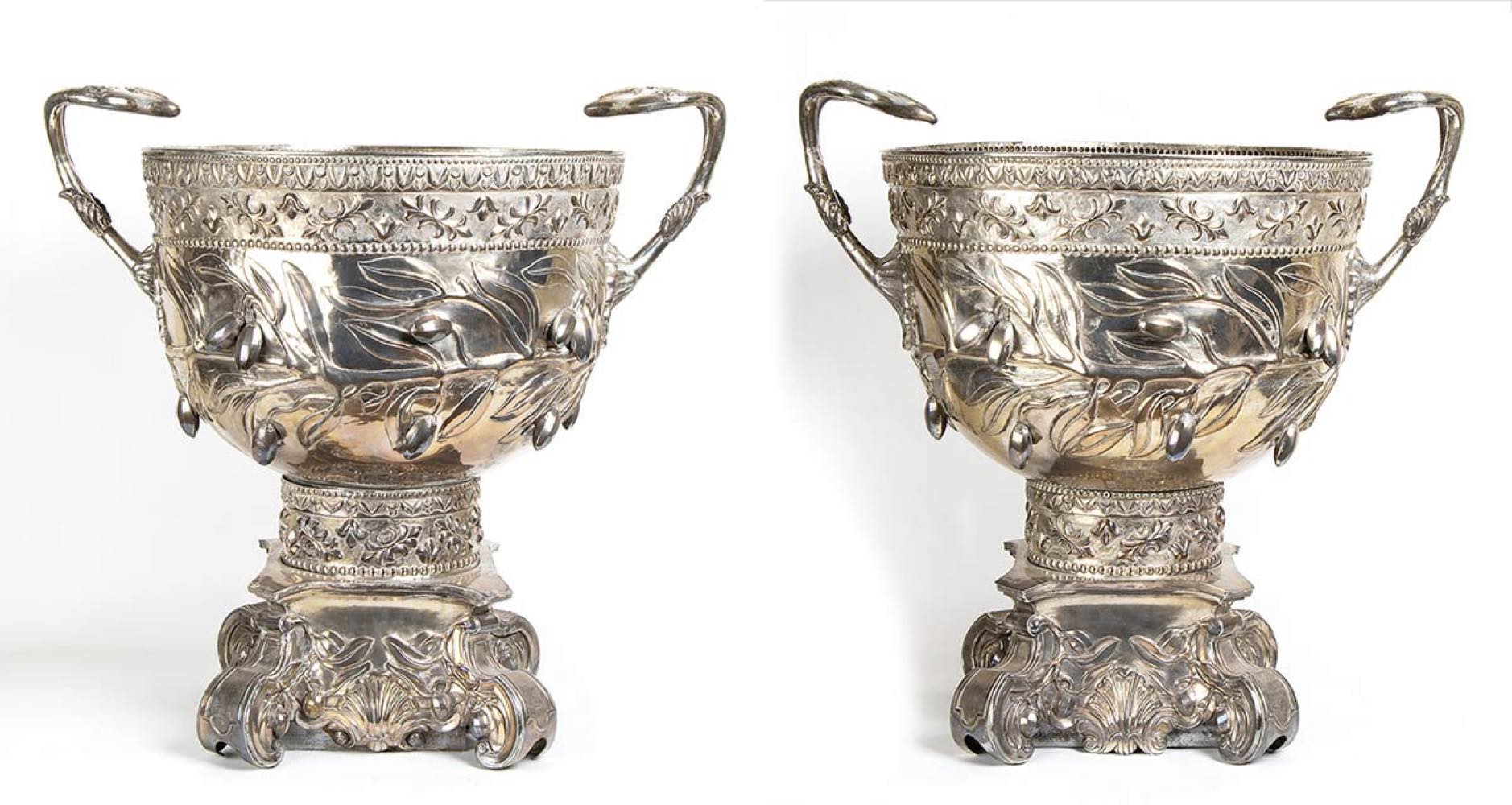 di linea classicheggiante, interamente sbalzati e cesellati con rami d'ulivo e poggianti su un basamento con quattro piedi a doppia voluta intervallati da conchiglie. Argento 925/1000.