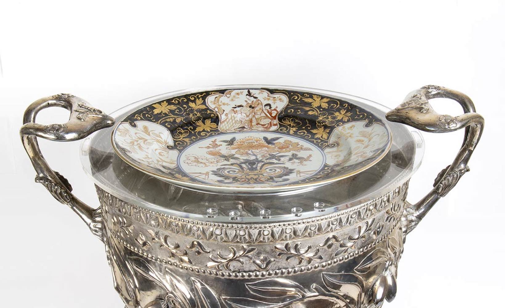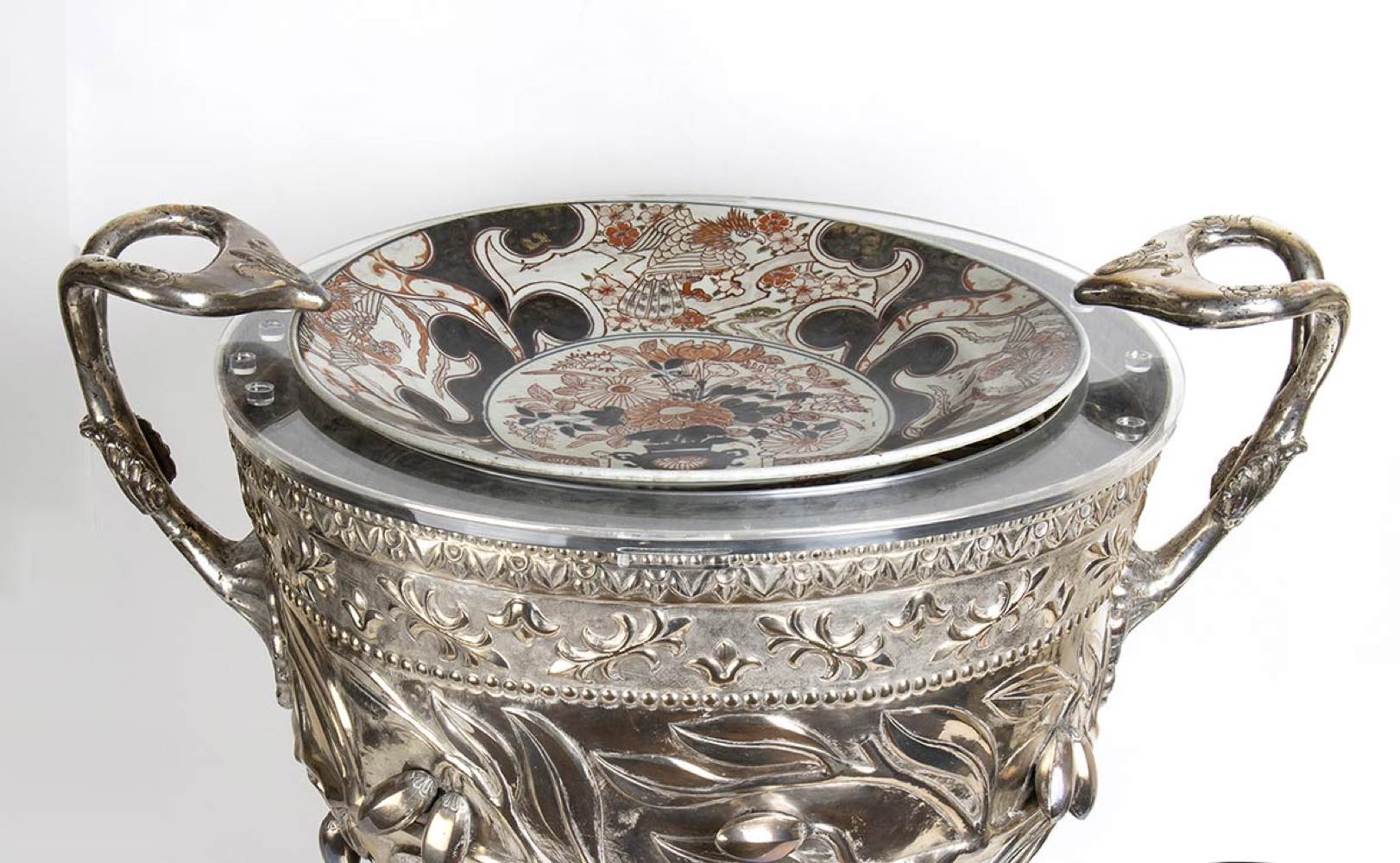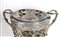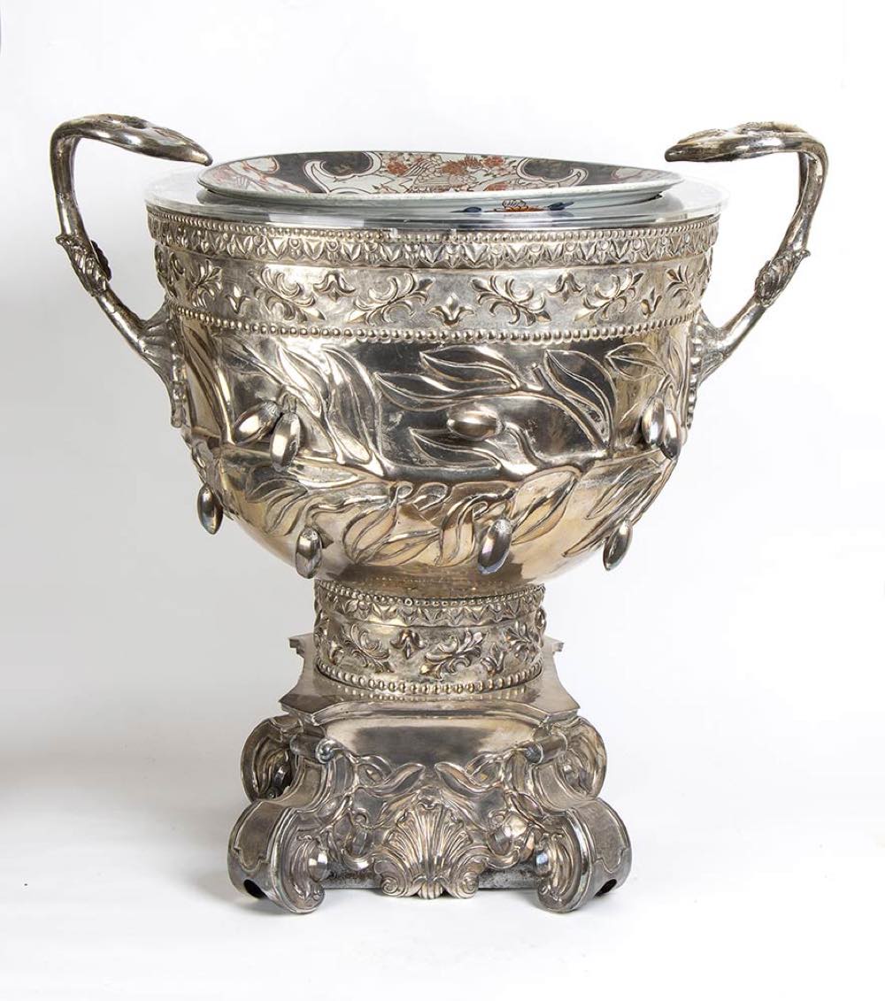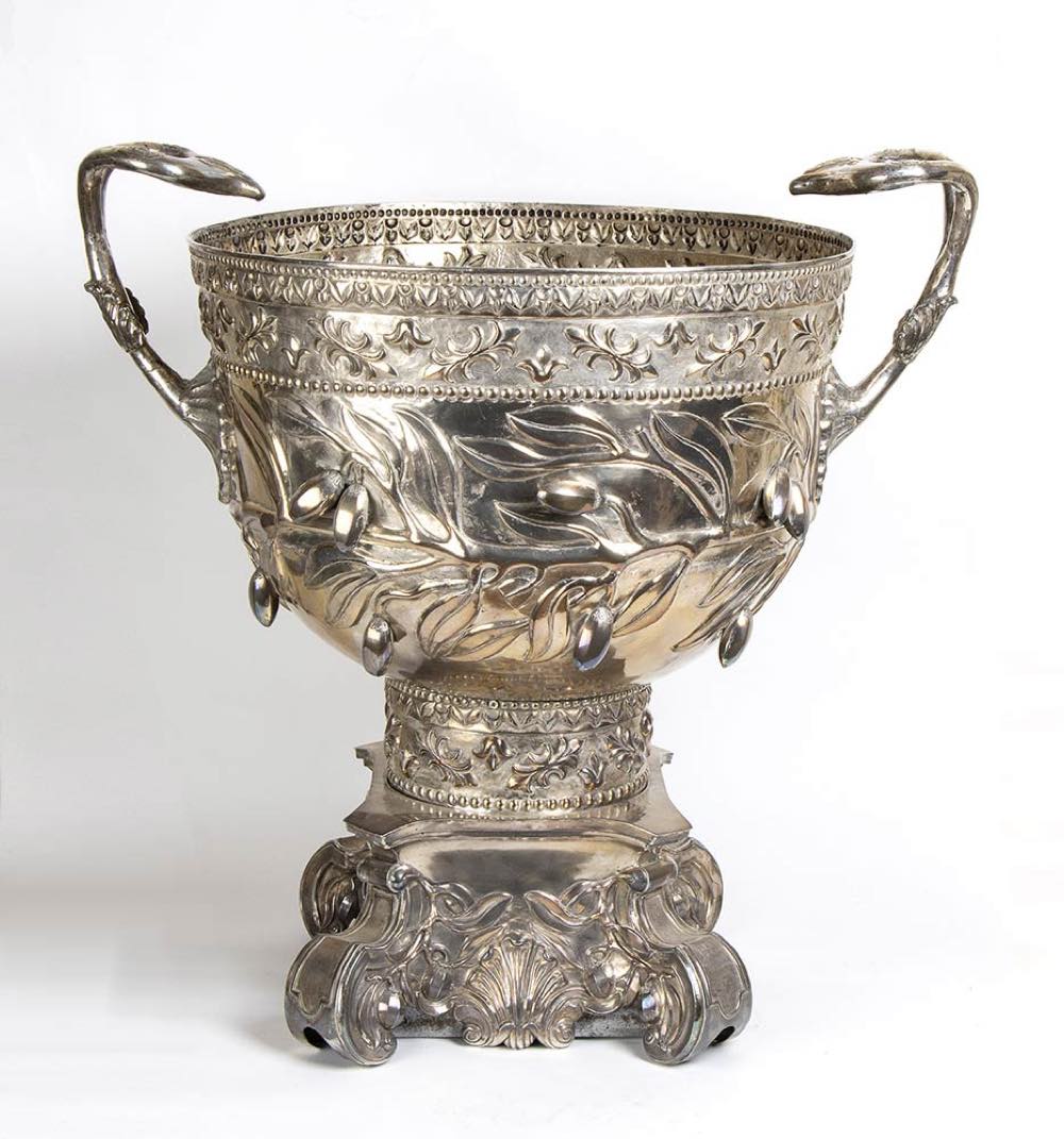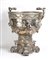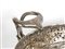 di linea classicheggiante, interamente sbalzati e cesellati con rami d'ulivo e poggianti su un basamento con quattro piedi a doppia voluta intervallati da conchiglie. Argento 925/1000.
