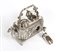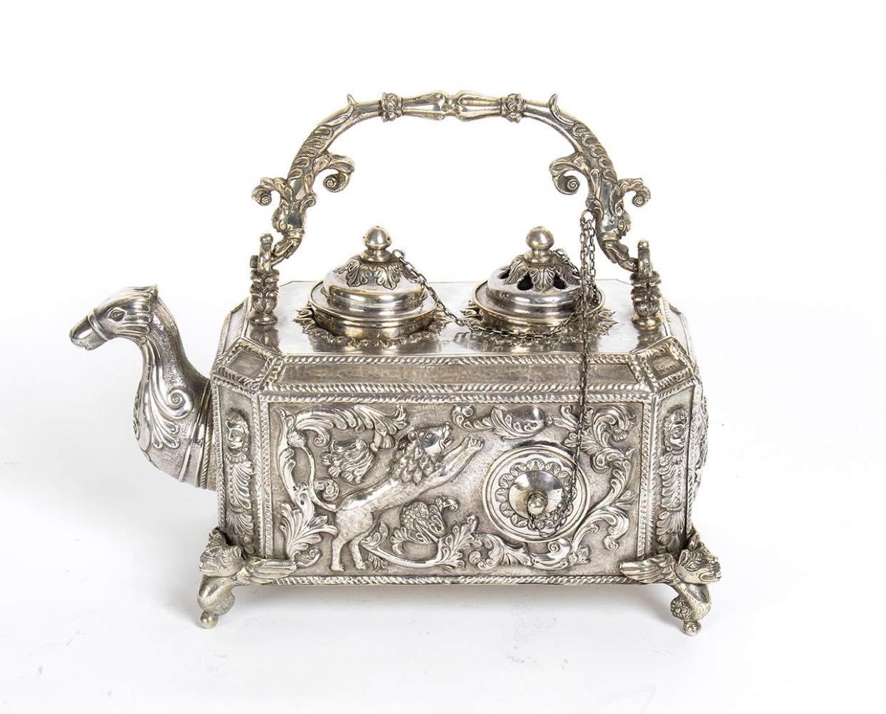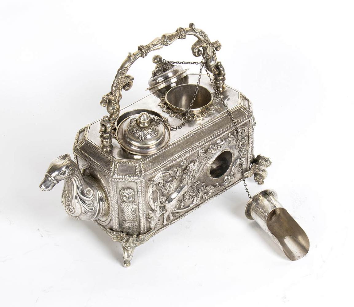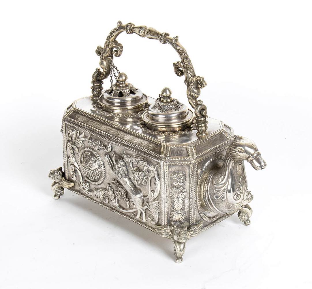 di forma rettangolare poggiante su quattro piedini con animali fantastici. Il corpo sbalzato e cesellato con voute vegetali e leoni; il lato superiore presenta due coperchi cilindrici: uno con funzione di tappo per il contenitore sottostante, l'altro, traforato, con funzione di incensiere in collegamento con lo sportello circolare presente sul fronte. Maniglia superiore pieghevole.