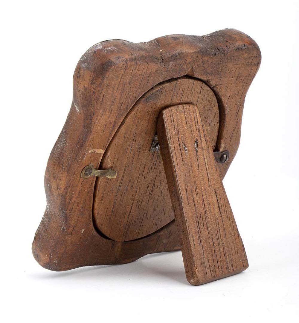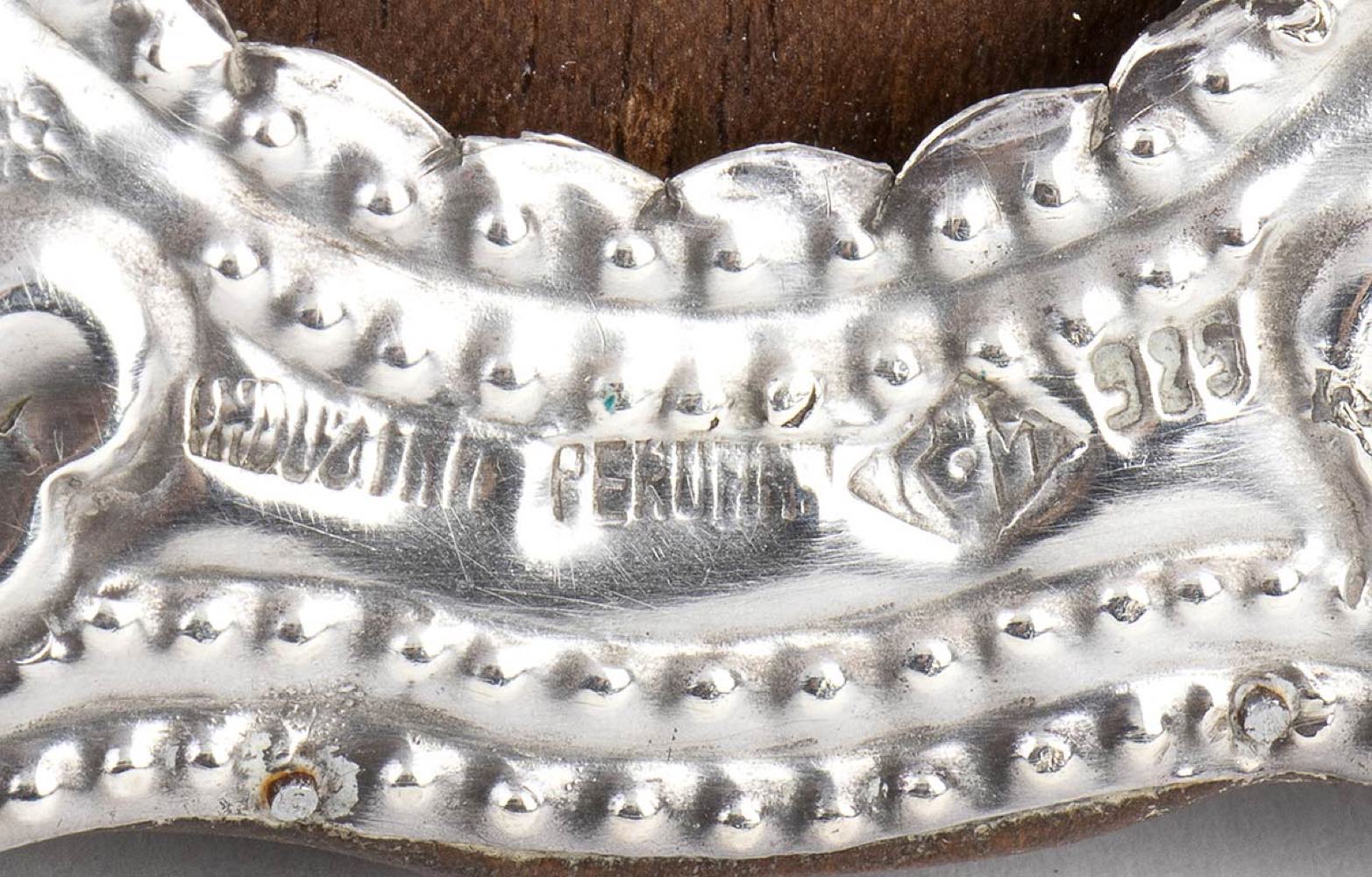 sbalzata e cesellata con decori floreali. Argento 925/1000 su supporto ligneo, punzonata "Industria Peruana - RM - 925".