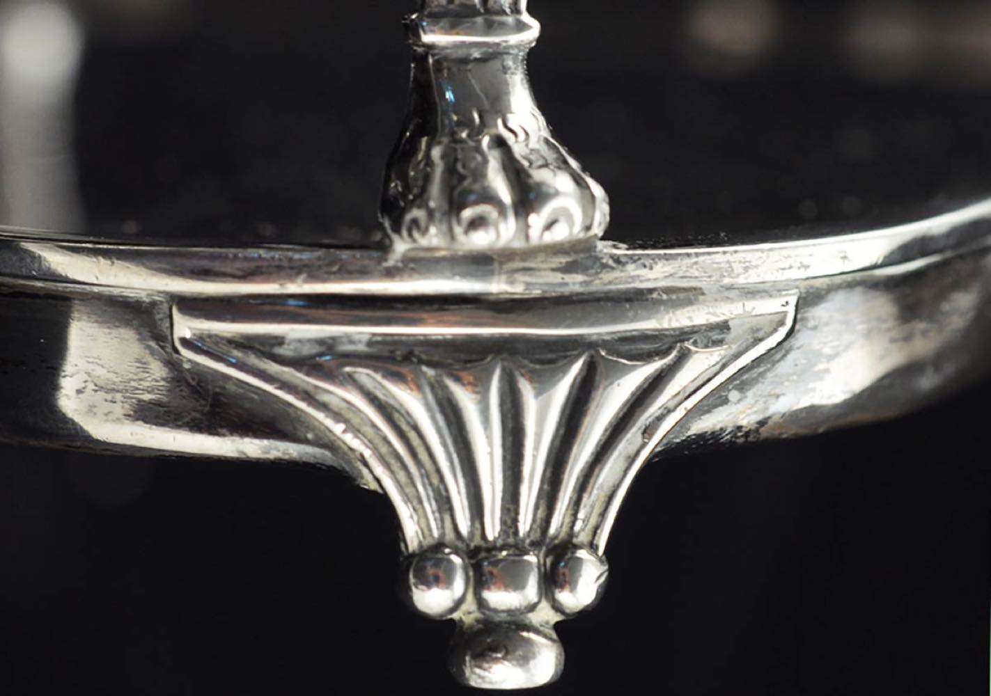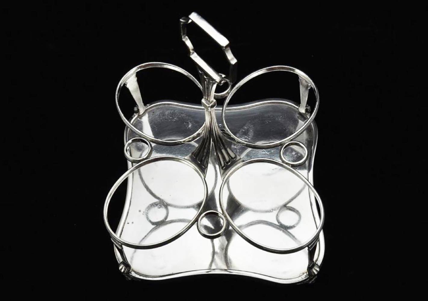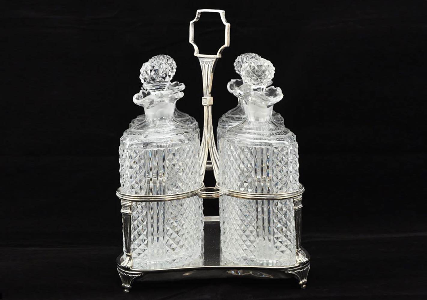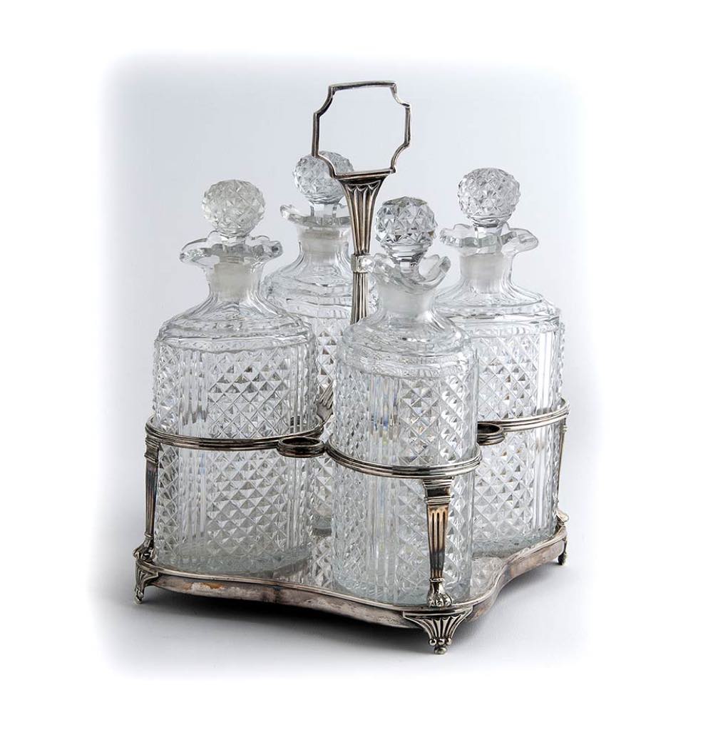 con quattro bottiglie in vetro molato all'Inglese e presa centrale. Argento 925/1000, serie completa di marchi Londra 1806-1807, argentiere Napthali Hart.