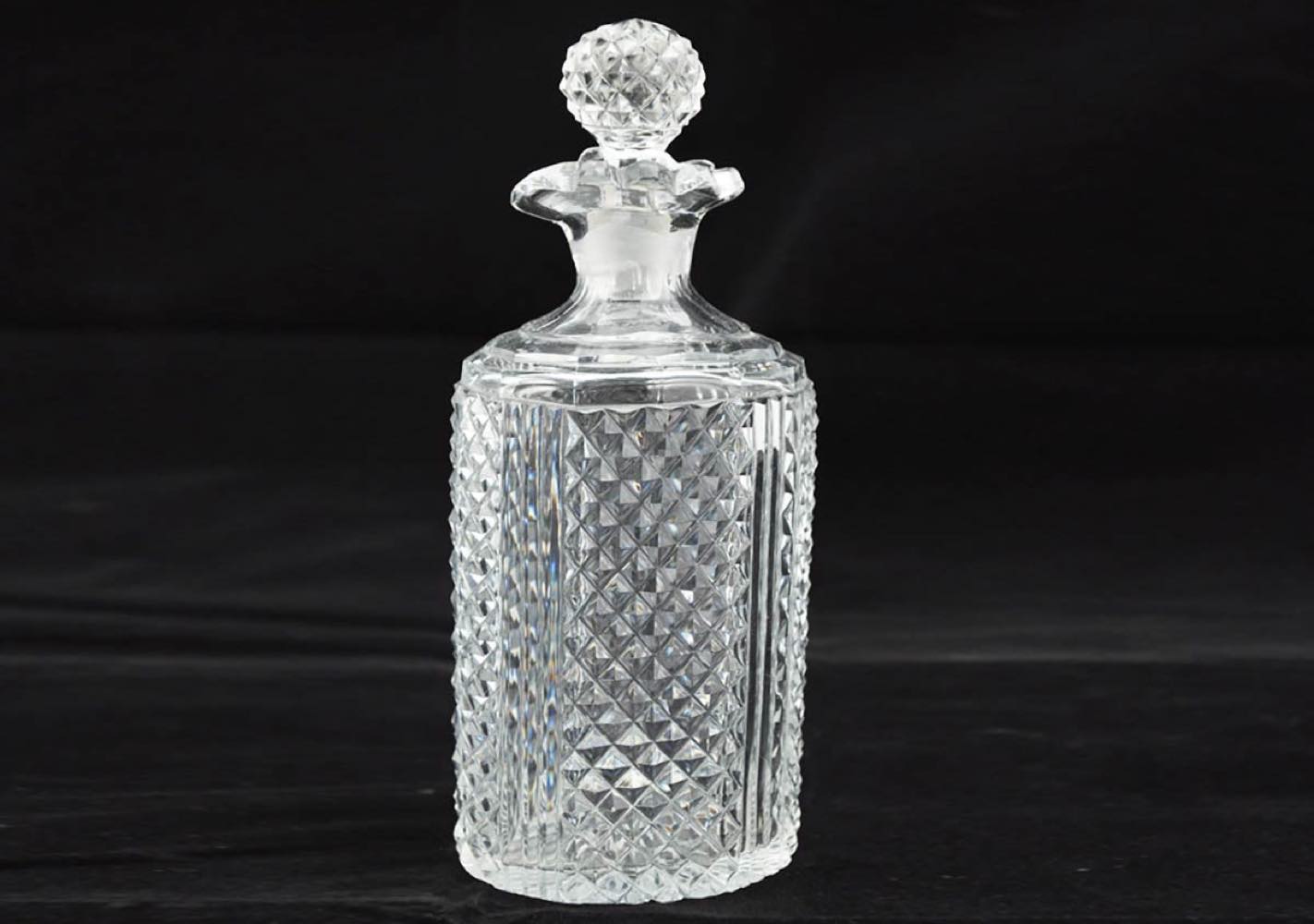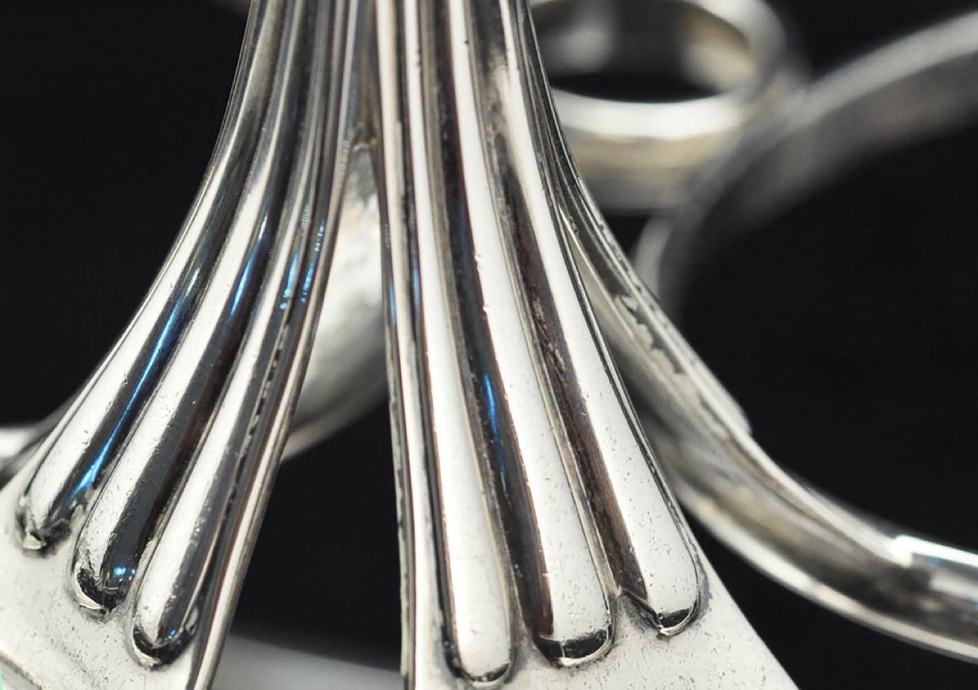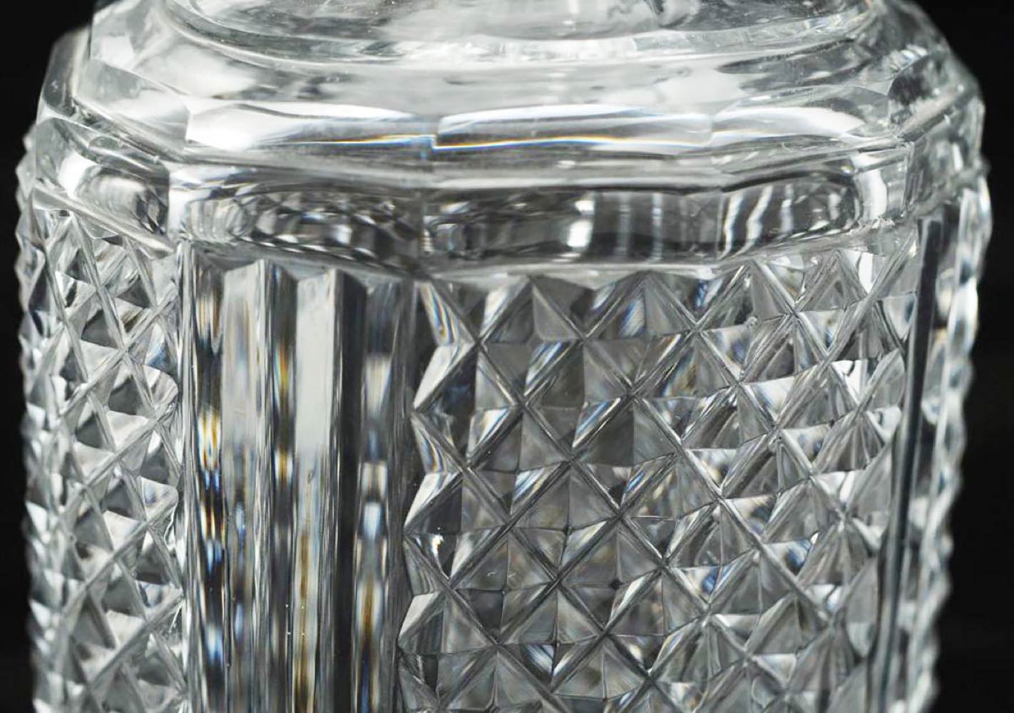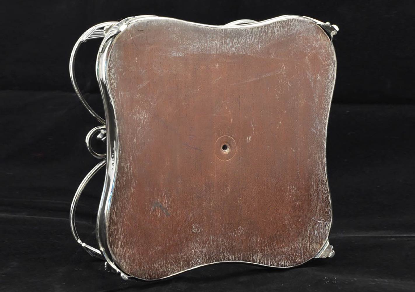 con quattro bottiglie in vetro molato all'Inglese e presa centrale. Argento 925/1000, serie completa di marchi Londra 1806-1807, argentiere Napthali Hart.