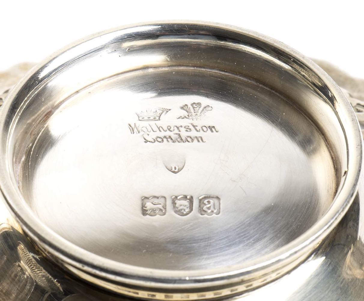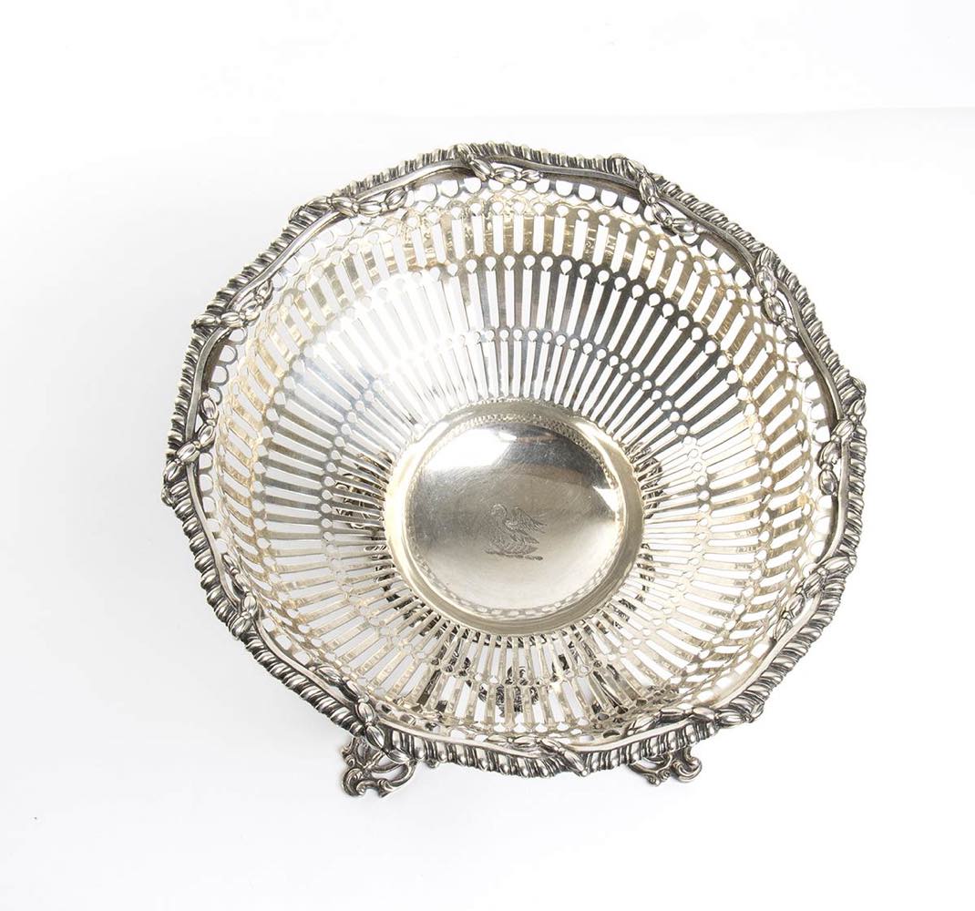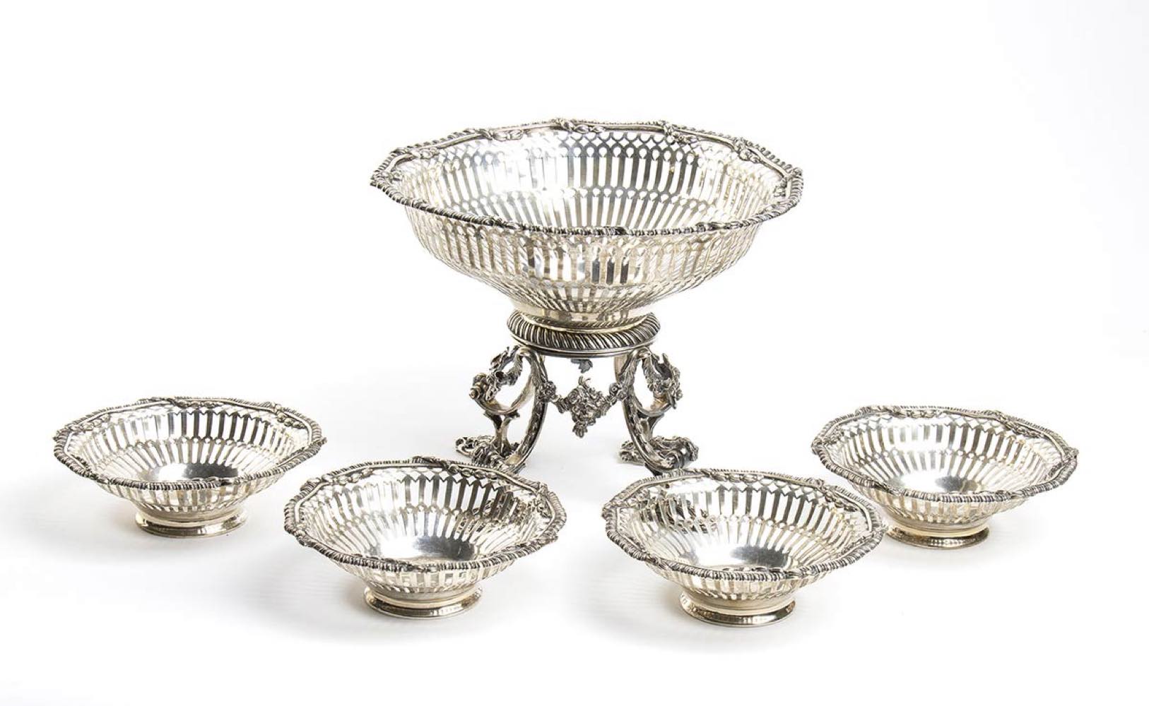 composto da un grande cestino rotondo interamente traforato e decorato a festoni, poggiante su un basamento decorato anch'esso con festoni floreali e da quattro cestini en-suite. Argento 925/1000, serie completa di marchi Londra 1888-89, argentiere Peter Henderson Deere.