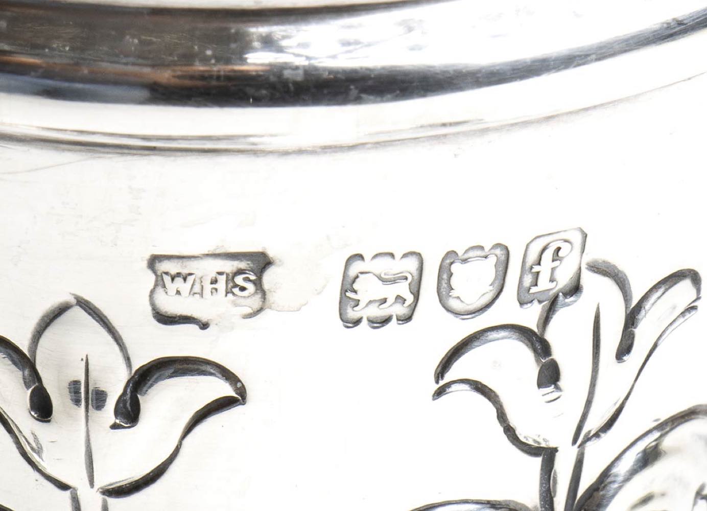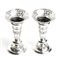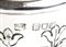 base circolare gradinata a decori floreali, basso nodo liscio e corpo troncoconico con i medesimi decori; bordo superiore traforato. Argento 925/1000, serie compleata di marchi Londra 1910-1911, argentiere William Henry Sparrow.