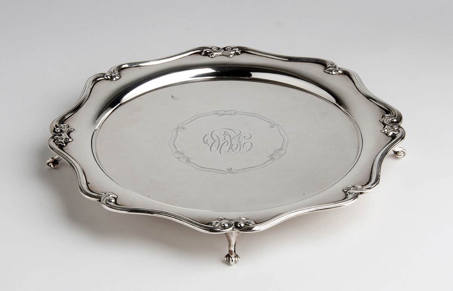 di forma sagomata, decorato con volute fogliate perimetrali, poggiante su quattro piedini ad artiglio. Argento 925/000, serie completa di marchi Sheffield 1905-1906, argentieri Robert & Belk.