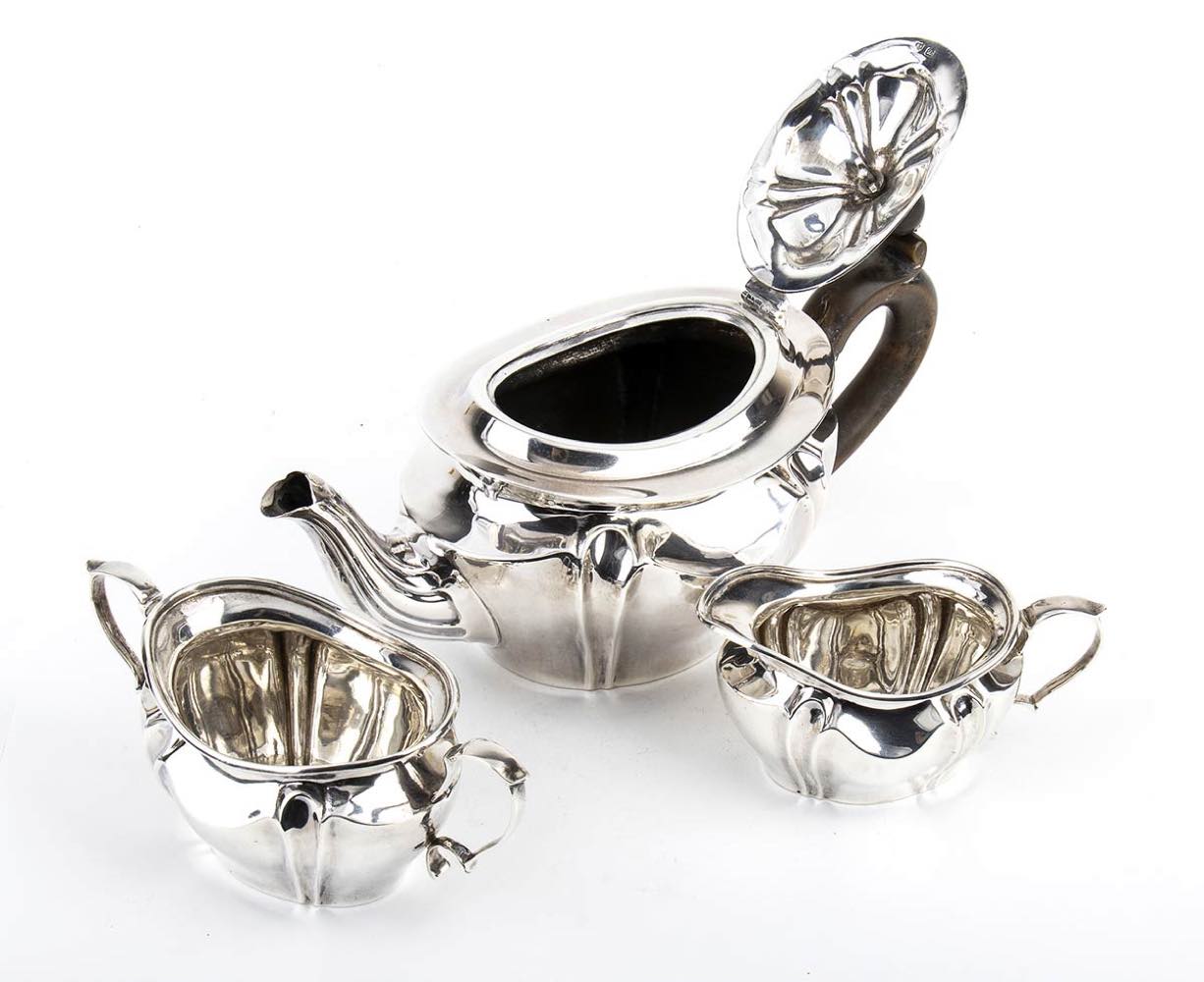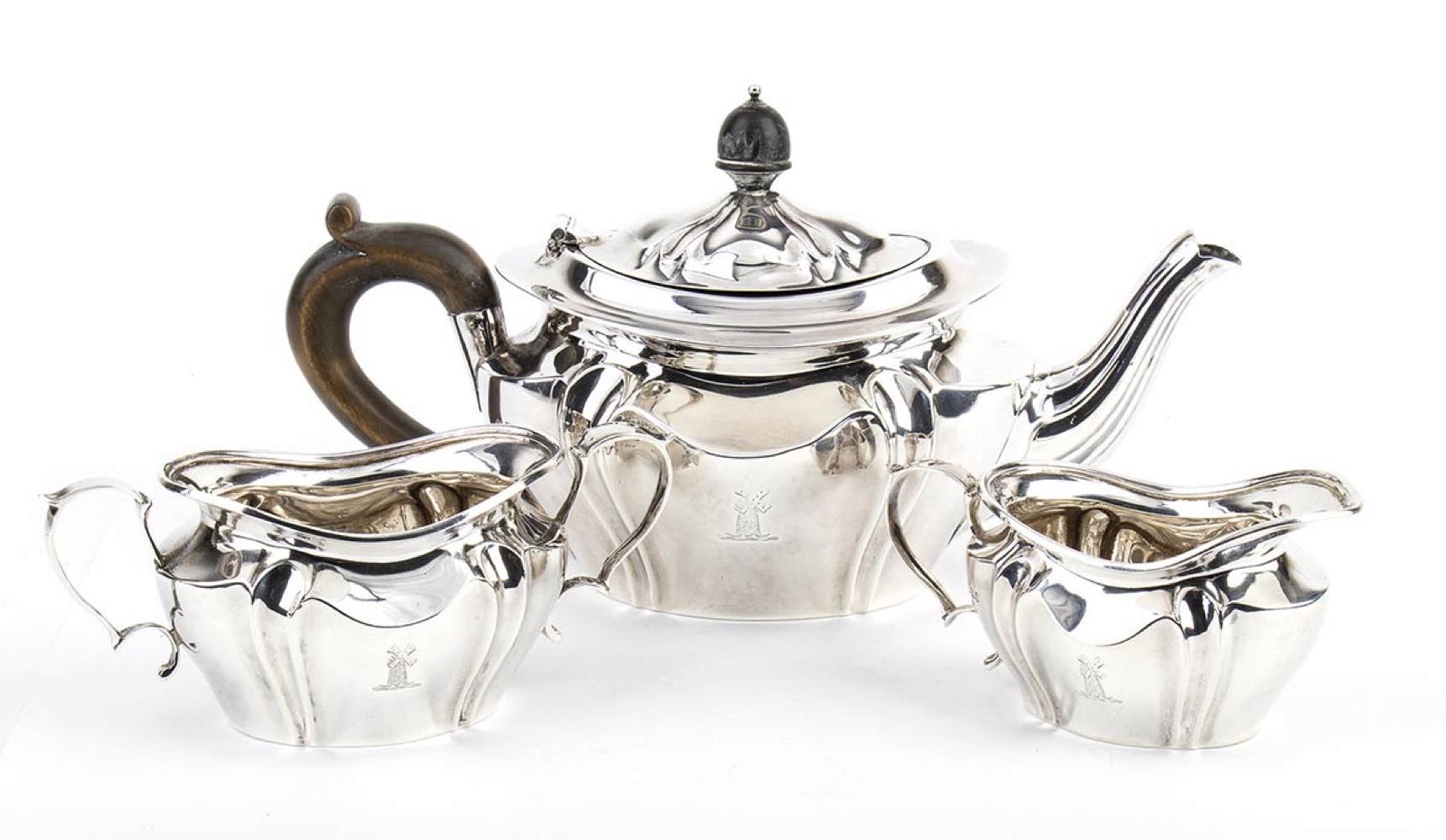 comprendente teiera, cremiera o lattiera e zuccheriera, di forma oblunga con scanalature verticali usate come forma di decorazione. Argento 925/1000, serie completa di marchi Sheffied 1898-1899, argentieri Fordham & Faulkner.