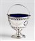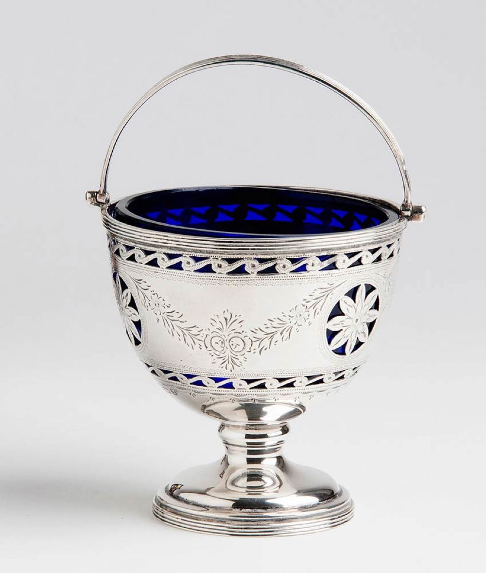 di forma circolare con manico pieghevole e contenitore in vetro blu, decorato con fustellature e incisioni a taglio luce. Argento 925/1000, serie completa di marchi Birmingham 1916-1917, argentieri George Nathan & Ridley Hayes.