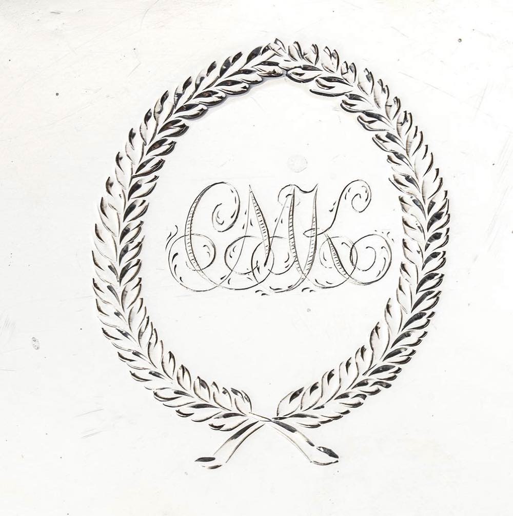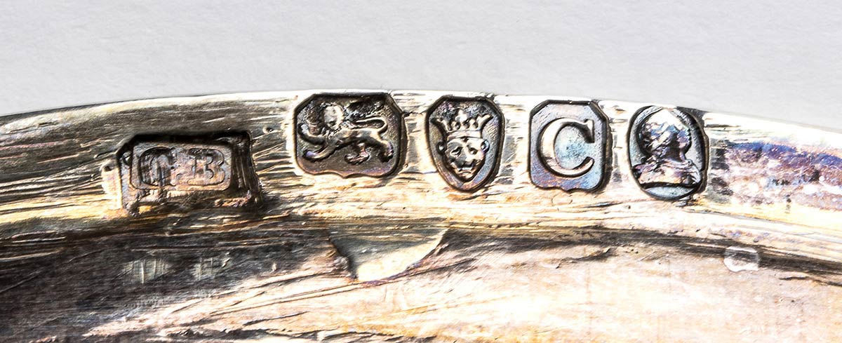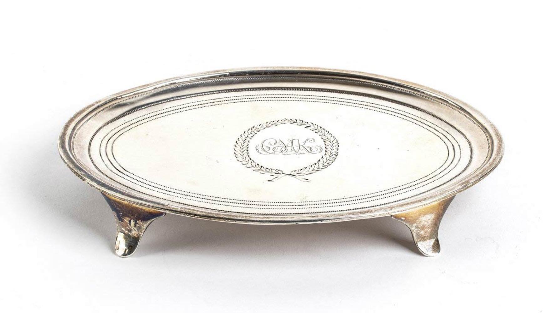 di forma ovale, a tre piedini; al centro un monogramma inciso. Argento 925/1000, serie completa di marchi Londra 1818-1819, argentiere George Beckwith.
