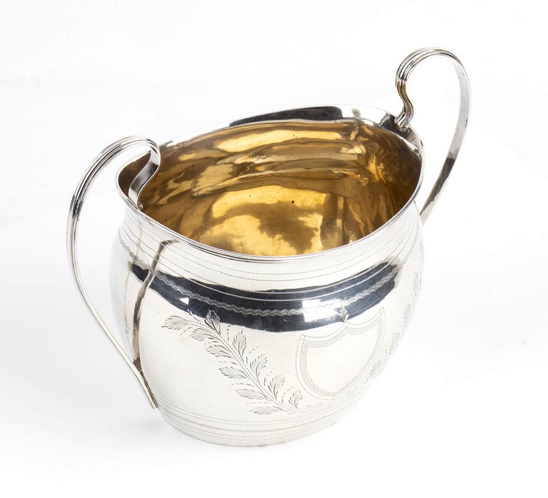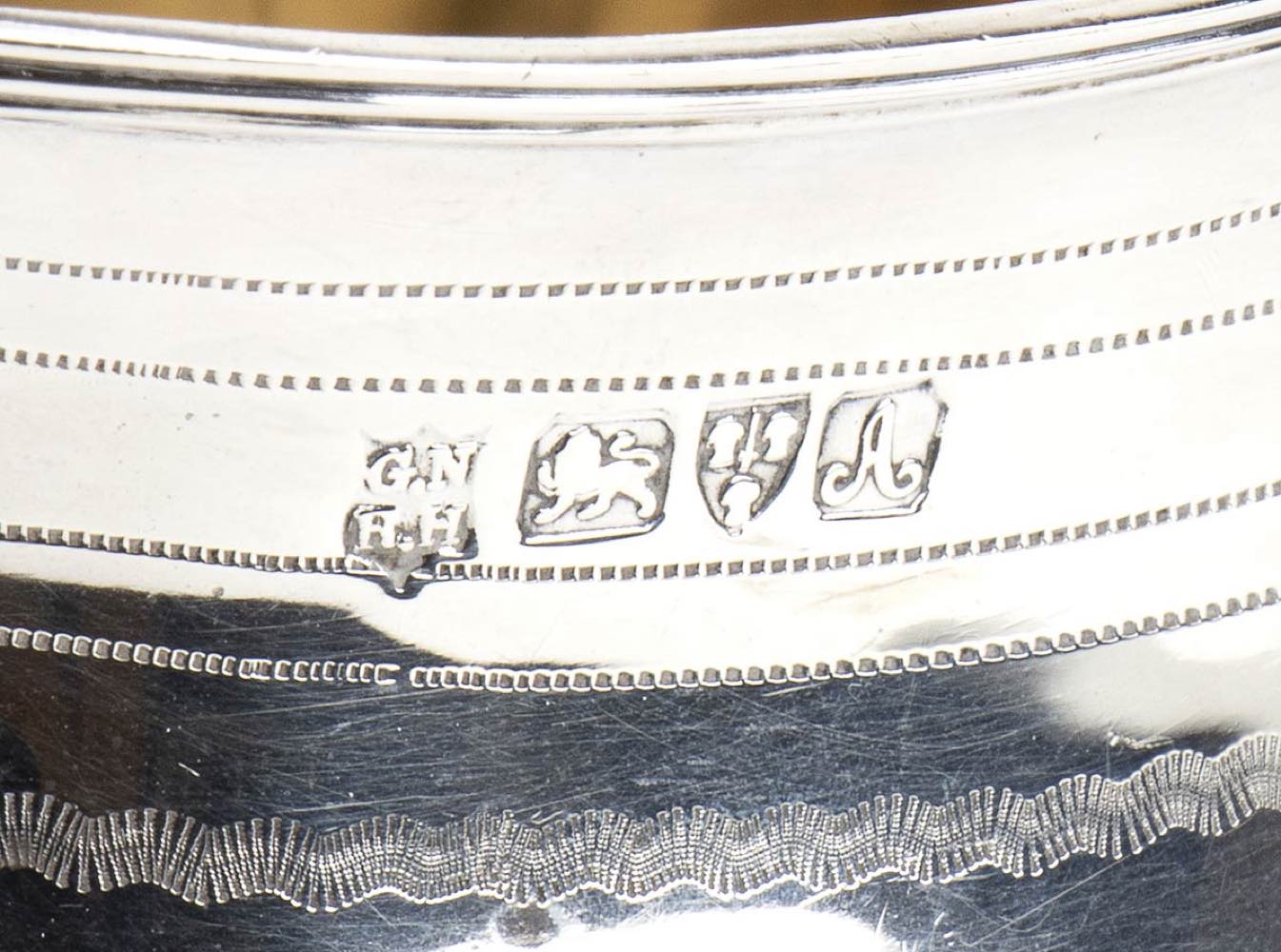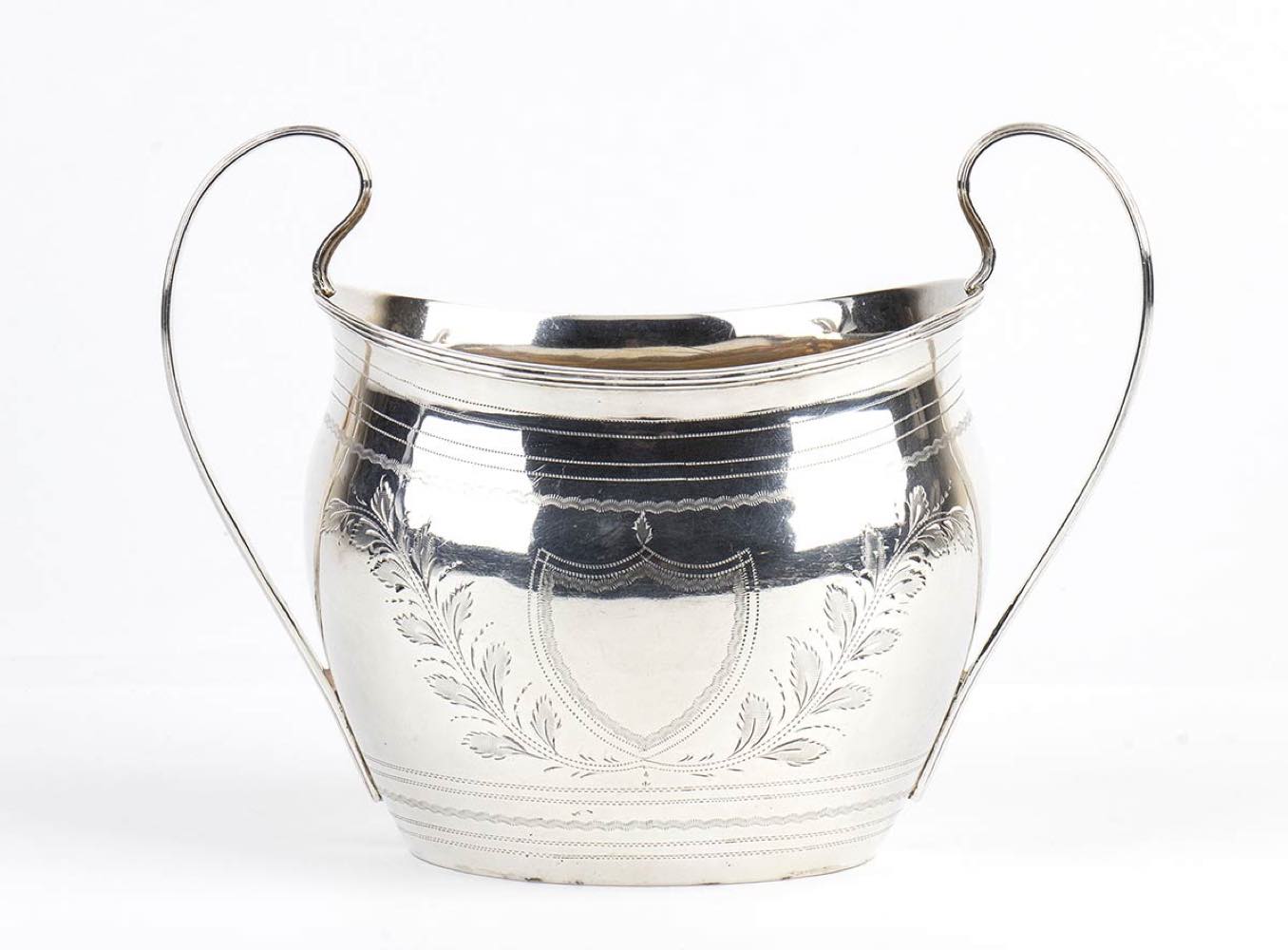 in stile georgiano, di forma ovale con manici laterali e incisioni a taglio luce, poggiante su base piatta. Interno dorato. Argento 925/1000, serie completa di marchi Chester 1901-1902, argentieri George Nathan & Ridley Hayes.