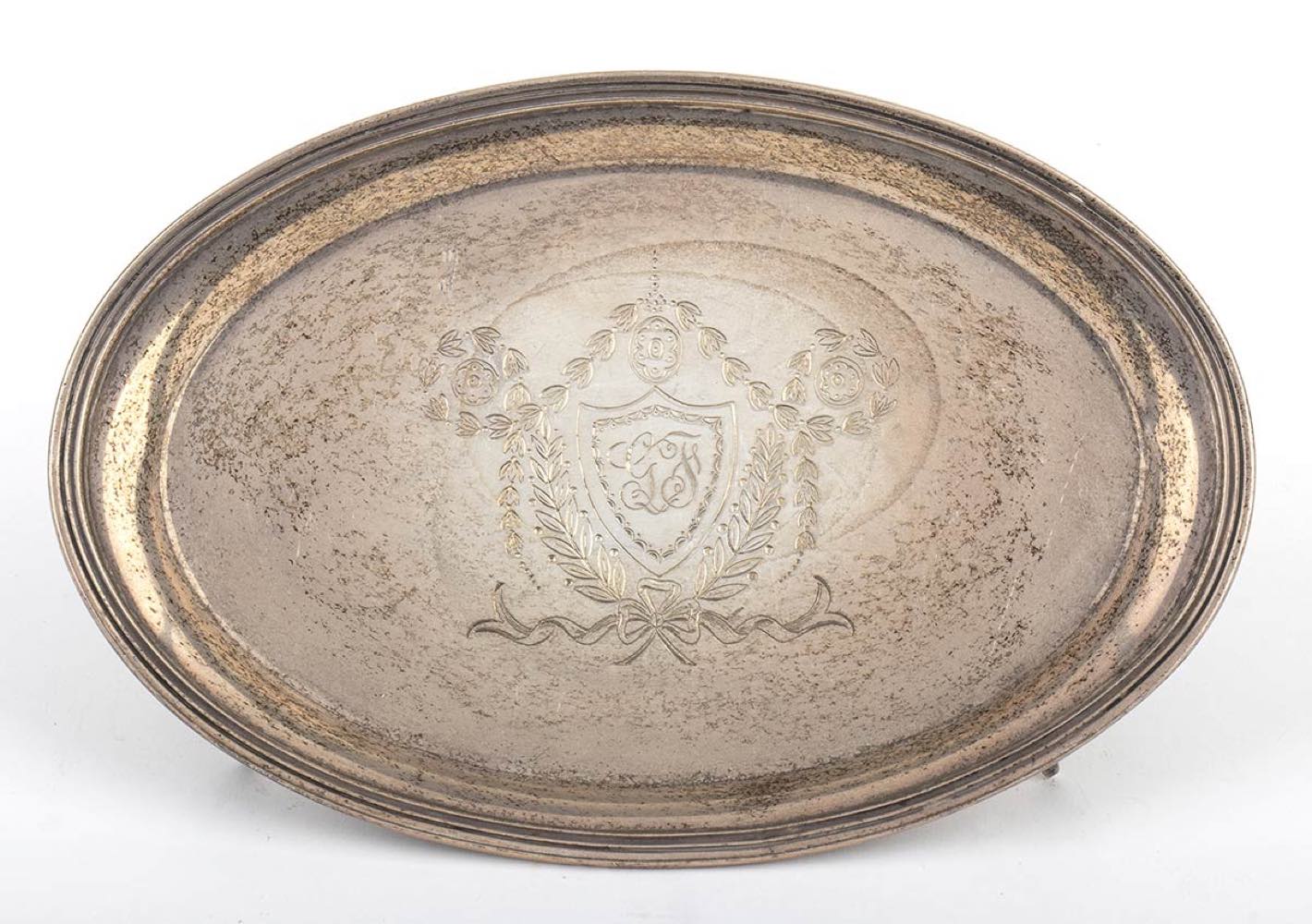 di forma ovale, a quattro piedini; al centro un monogramma inciso F G". Argento 925/1000, serie completa di marchi Londra 1909-1910, argentiere David Munsey, Munsey & Co. ltd.