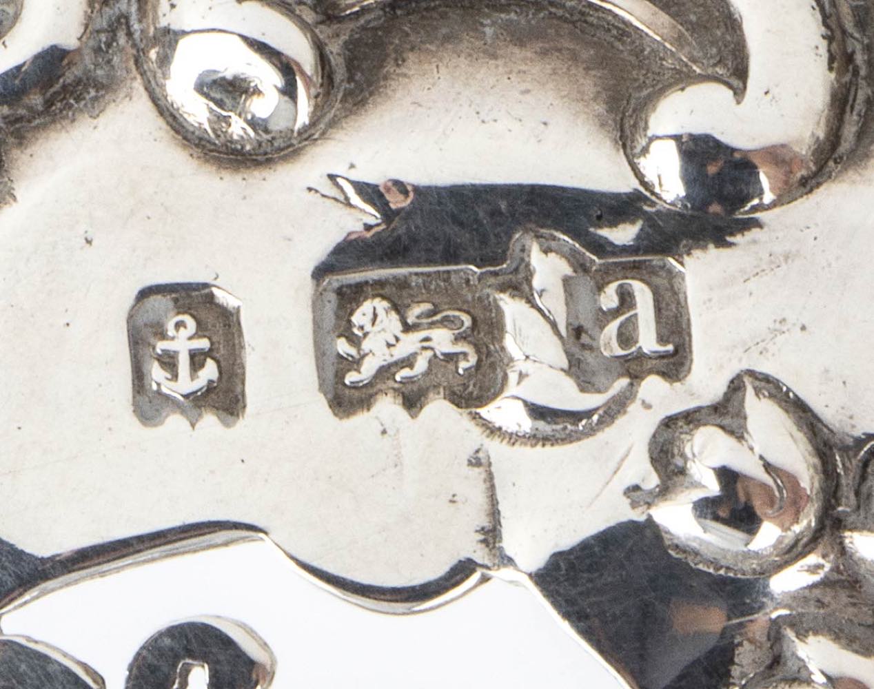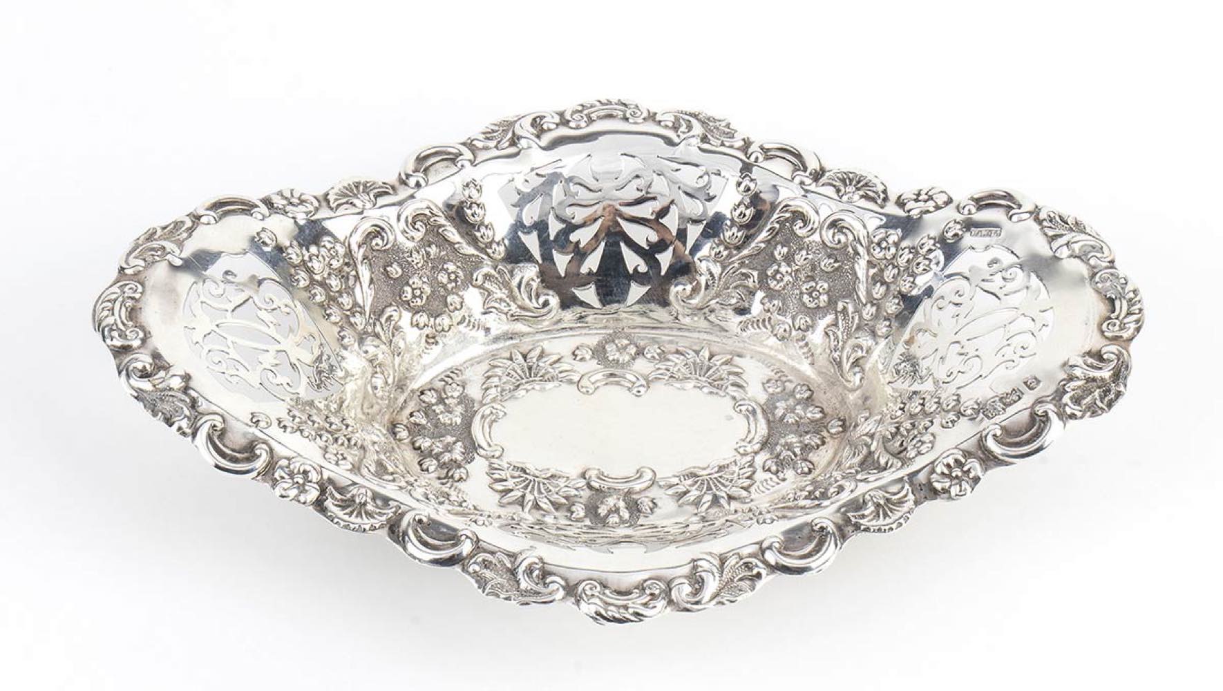 di froma ovale sagomata decorato e traforato a volute vegetali. Argento 925/1000, serie completa di marchi Birmingham 1900-1901, argentieri W.H. Newman Ltd.