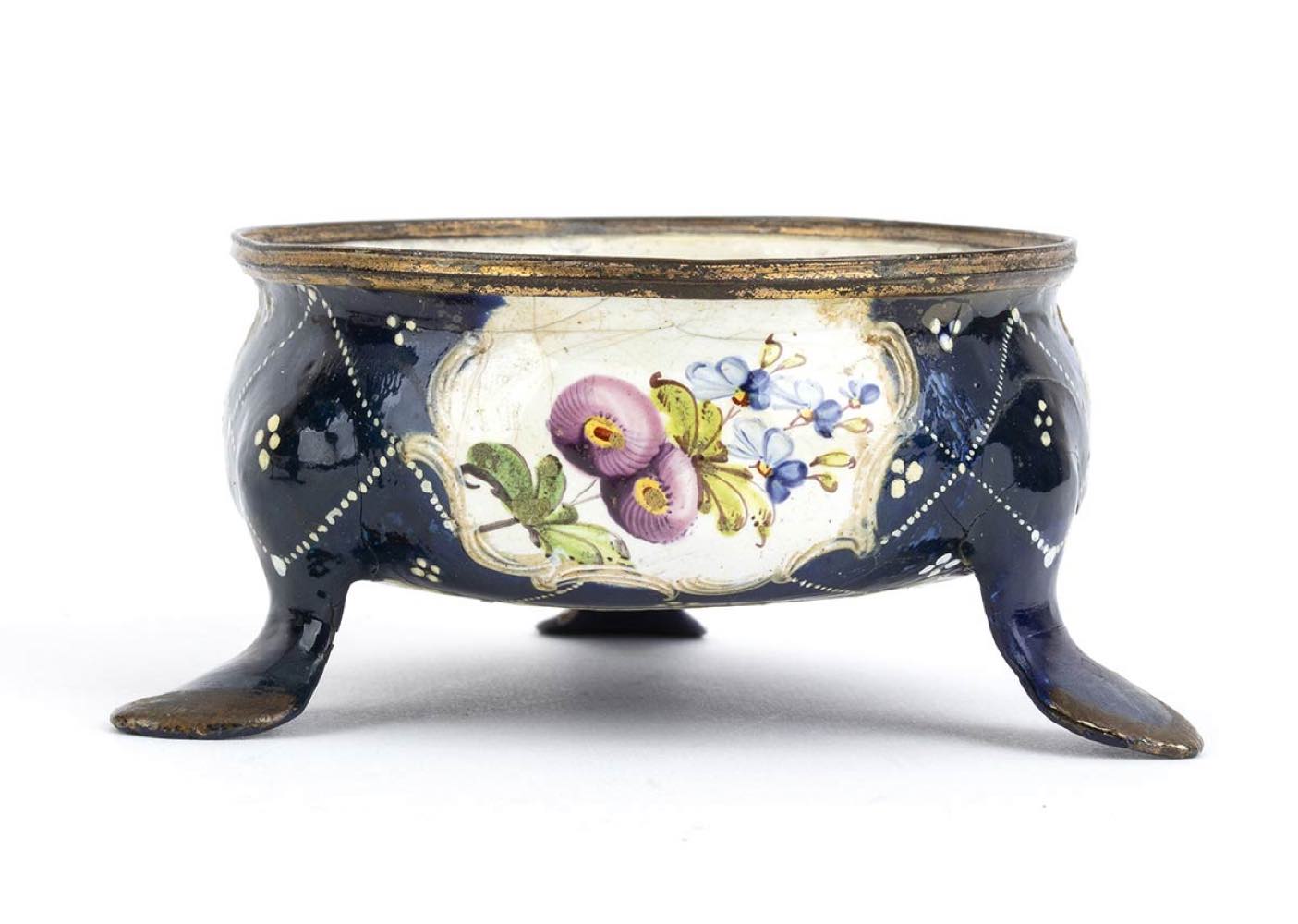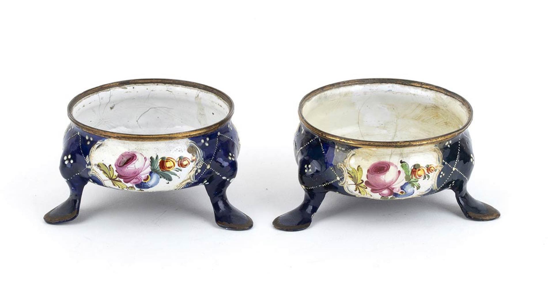 Coppia di saliere inglesi smaltate - fine XVIII secolo, manifattura BATTERSEA