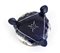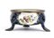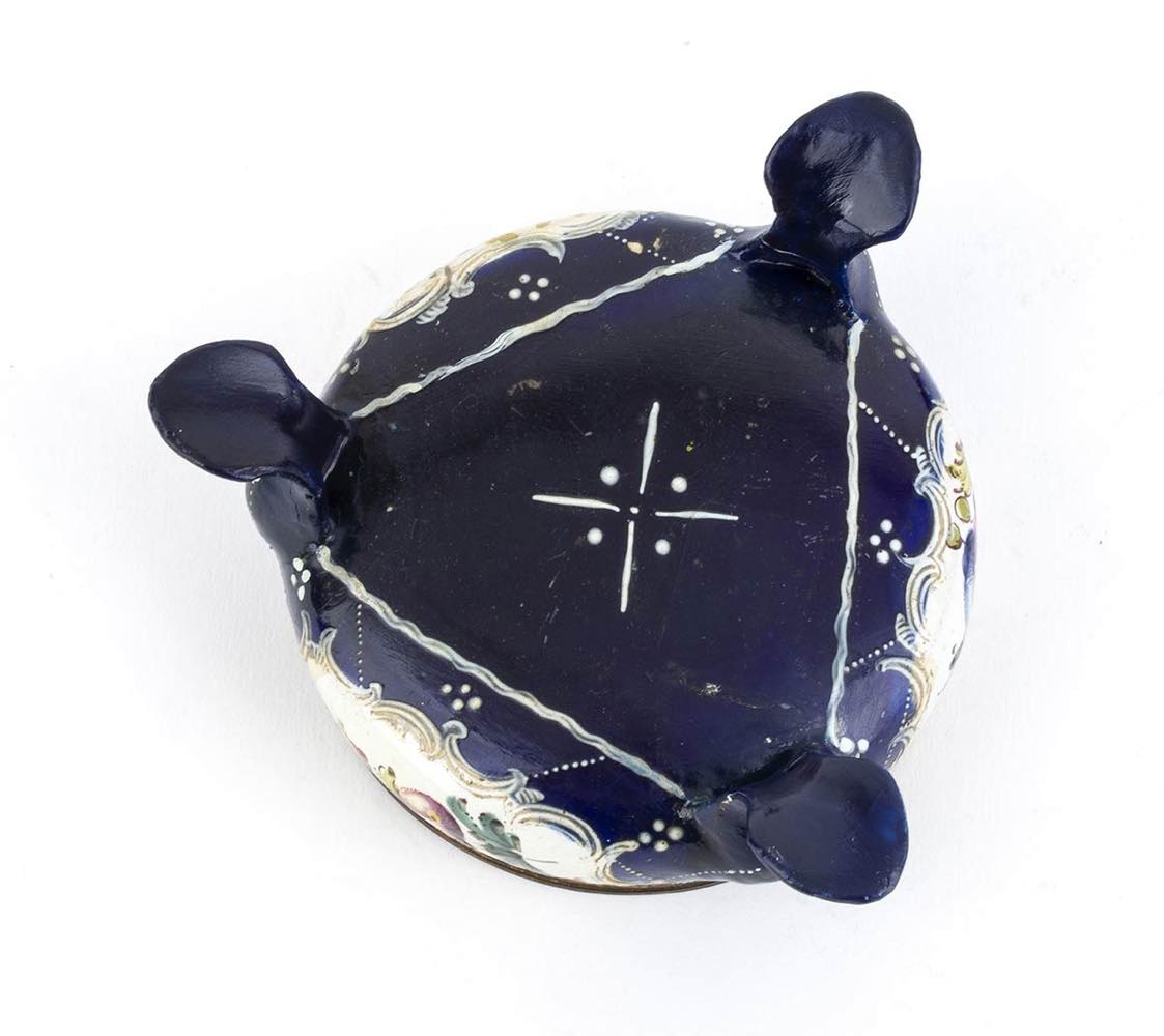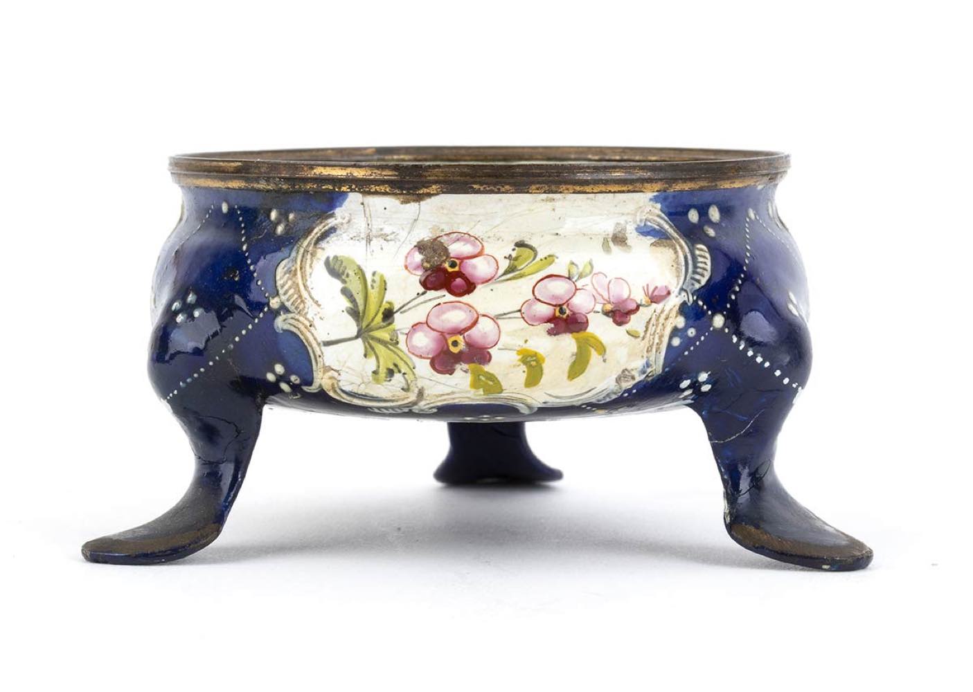 di forma circolare poggianti su tre piedini palmati; metallo smaltato in policromia a fondo blu con riserve a decori floreali.