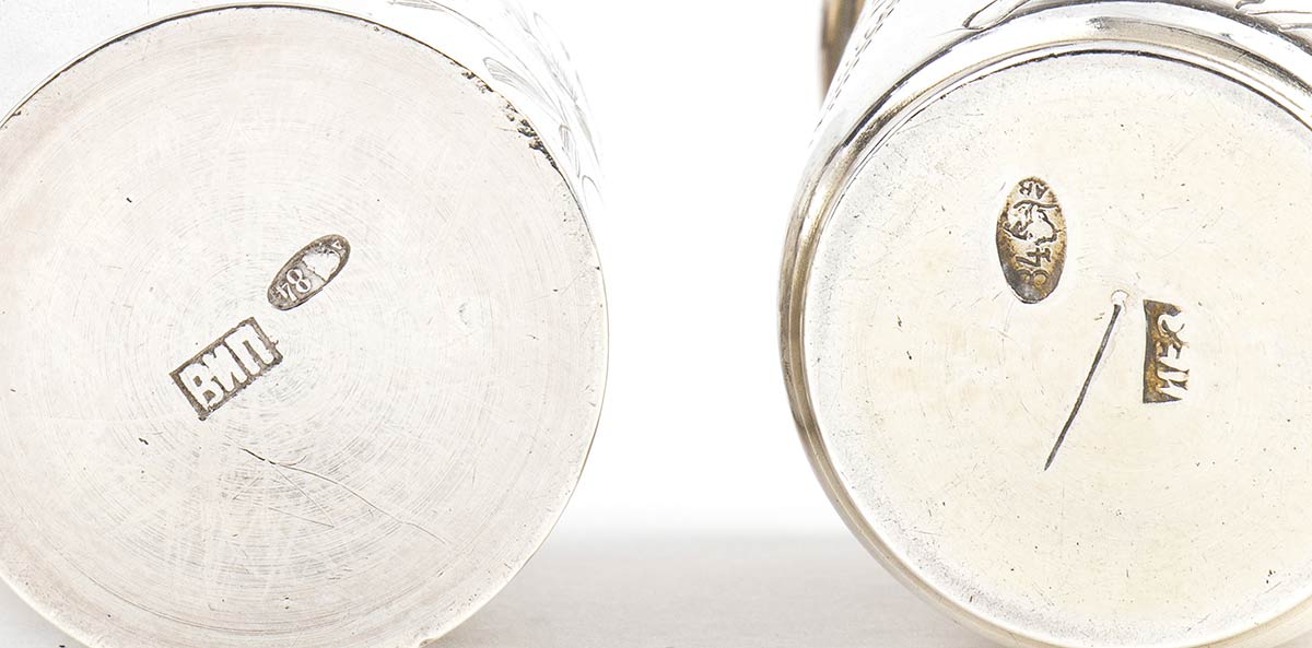 a) di forma cilidrica con incisioni floreali, serie completa di marchi per l'argento al titolo di 84 zolotniks (875/1000) in uso a Mosca dal 1908 al 1926. Altezza 4,8 cm, diametro bordo 3,5 cm, peso 23 gr.