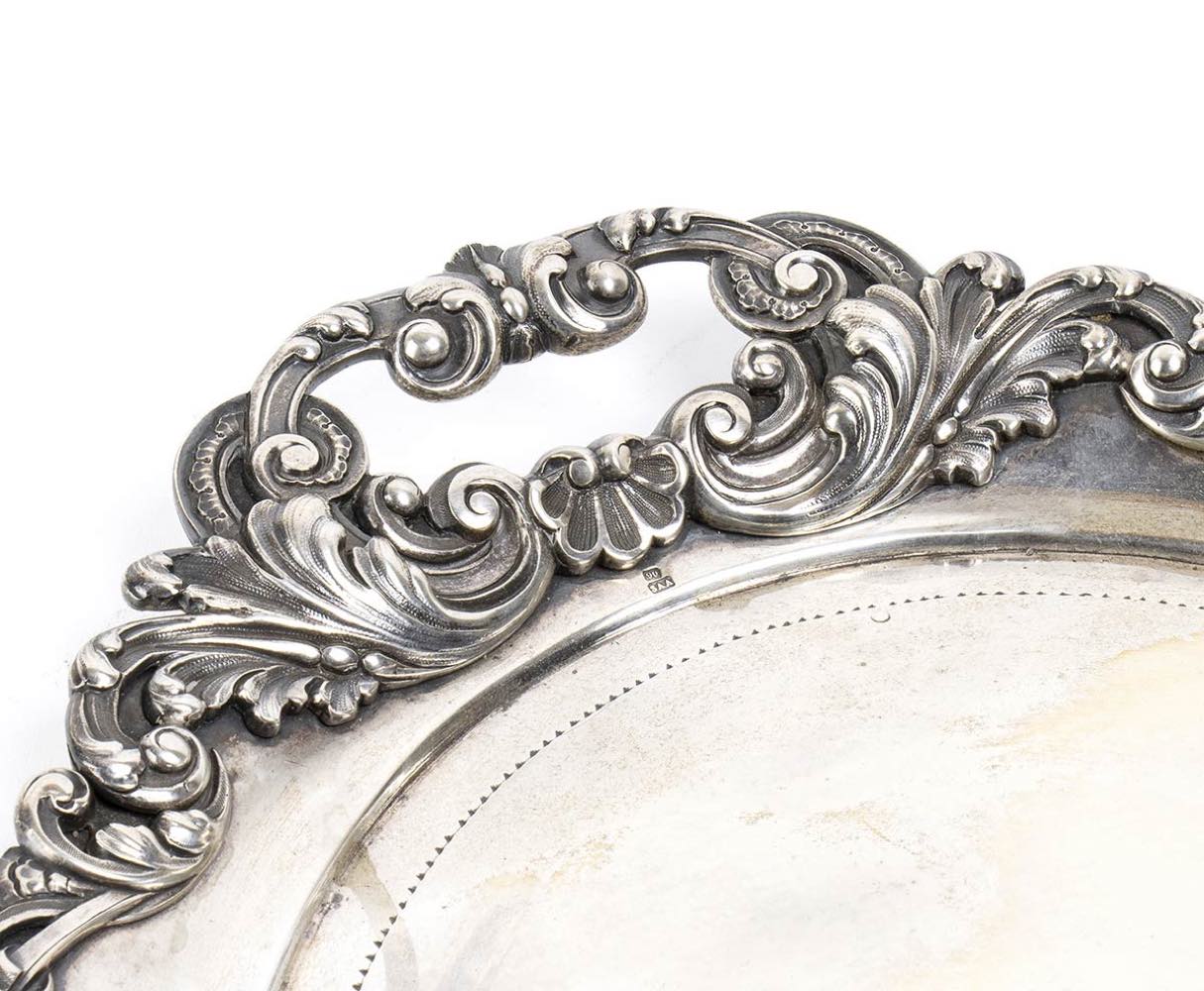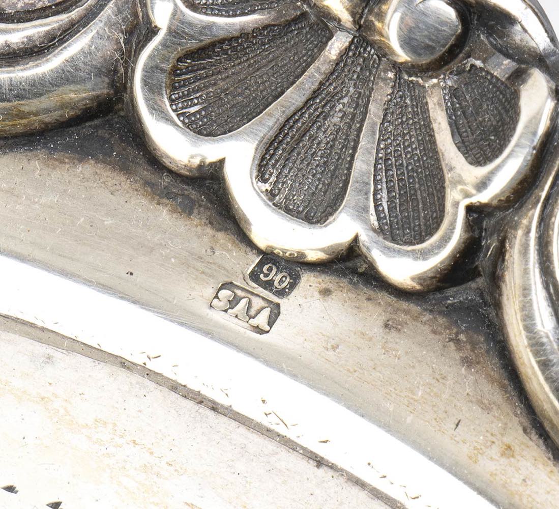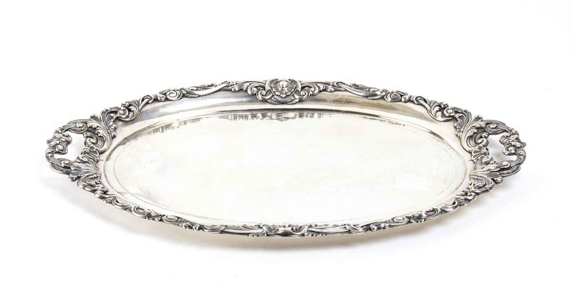 di forma ovale con manici laterali. Bordo applicato a decori vegetali. Marchi non identificati.