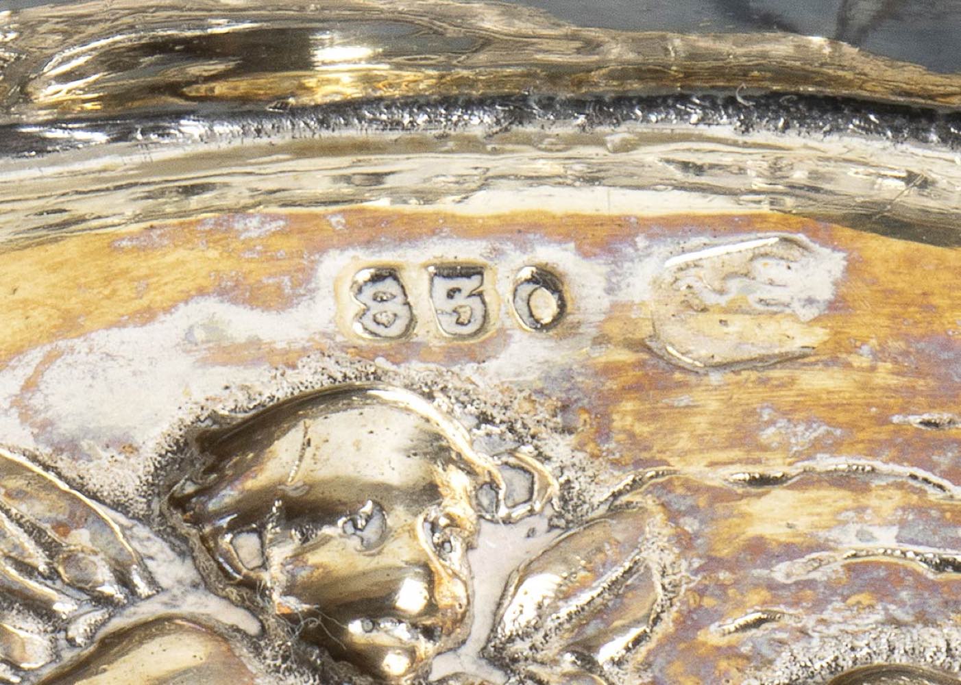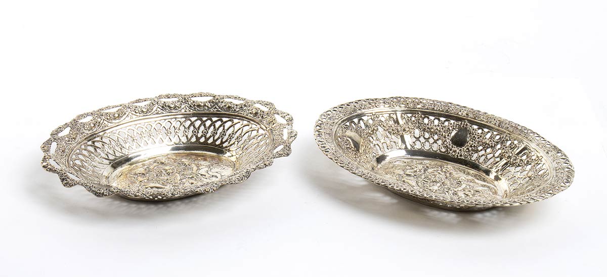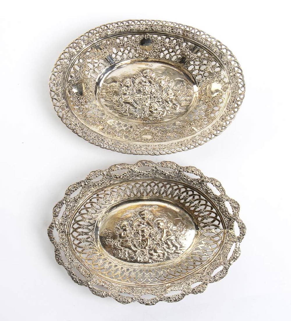 di forma ovale, traforati e decorati con festoni e putti alati. Argento 800/1000, punzonato con marchi in uso in Germania dopo il 1888.