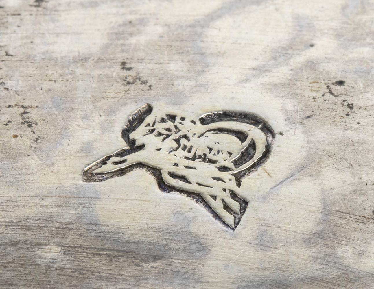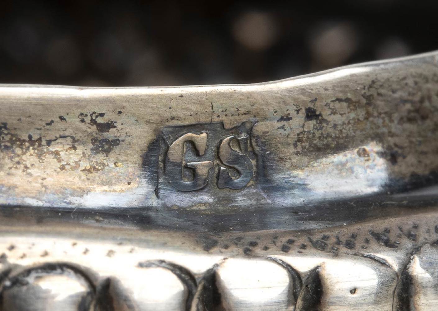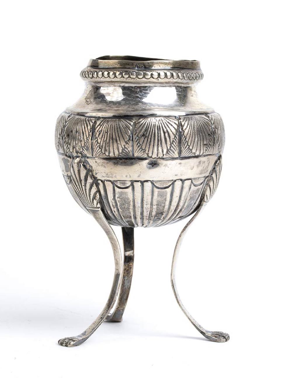 a) incensiere a tripode, poggiante su tre piedi felini. Il corpo a decori floreali. Punzonato con il marchio in uso alla corporazione degli orefici di Napoli per l'argento al titolo di 833/1000 o 10 once, 1832-1872.
