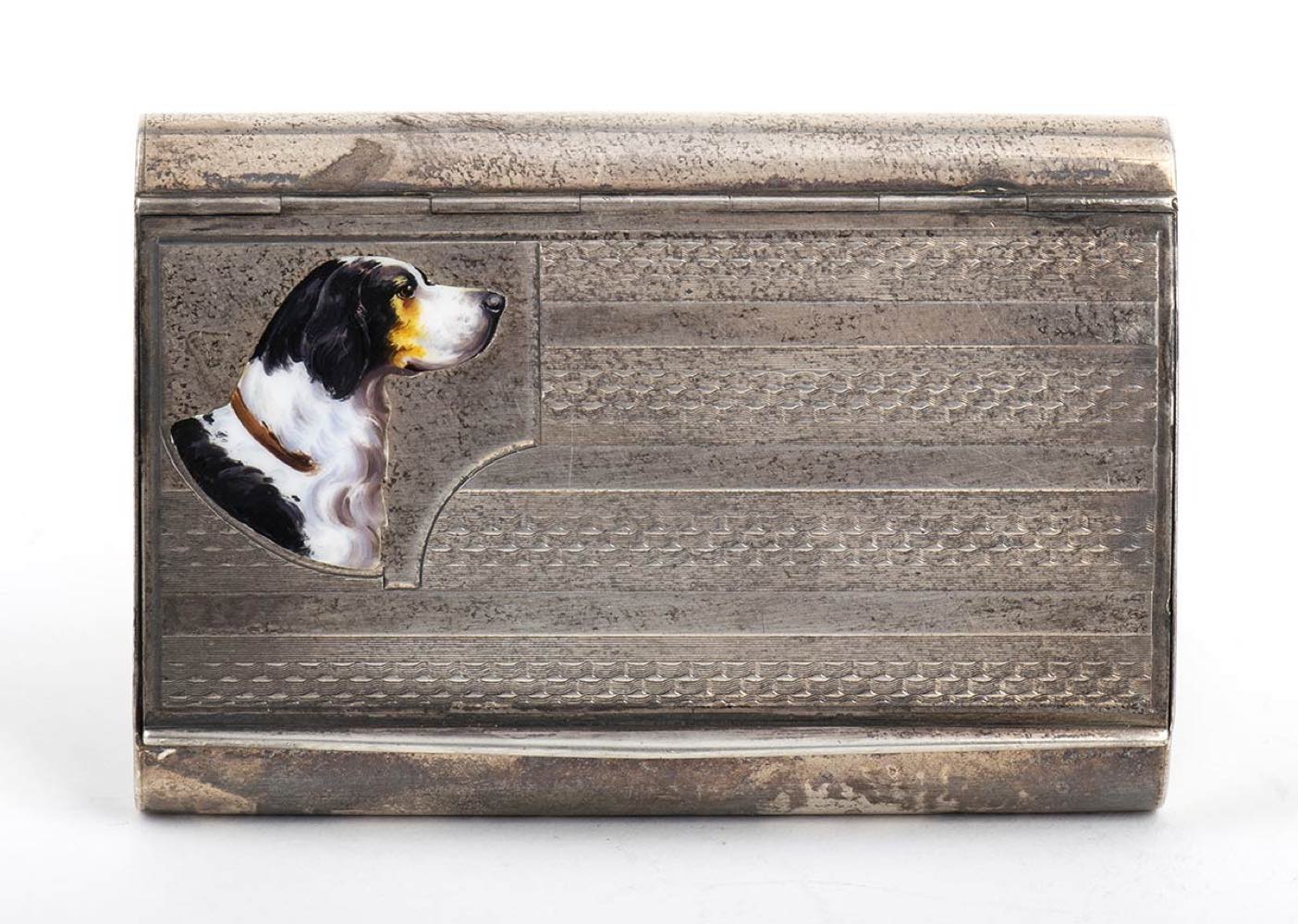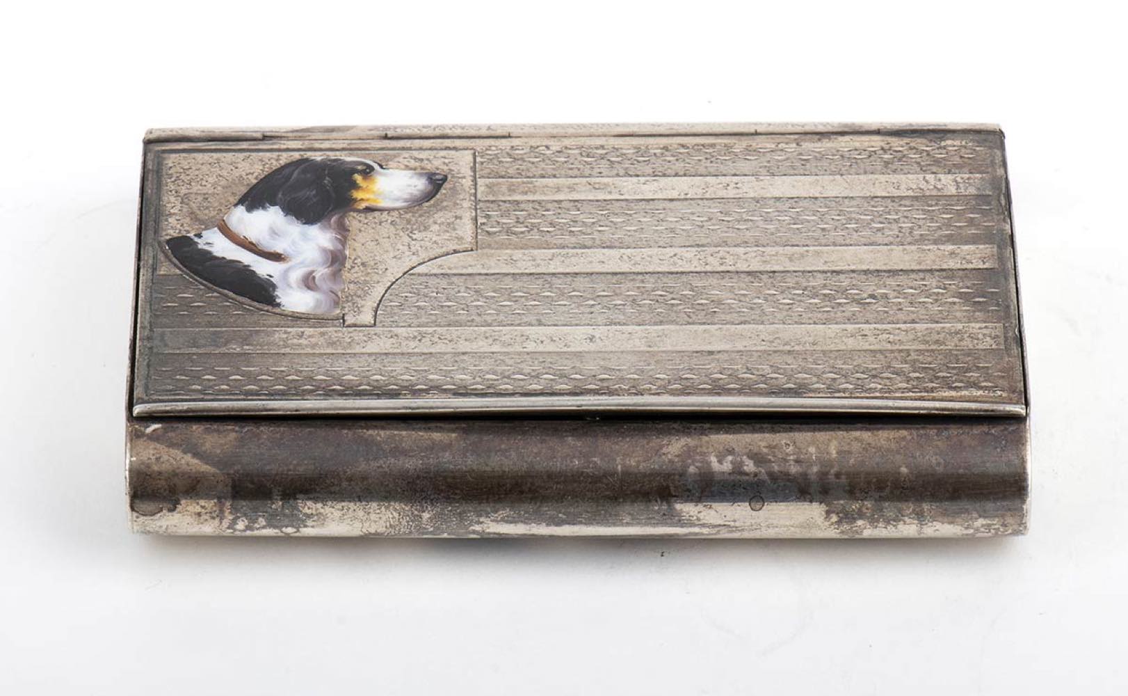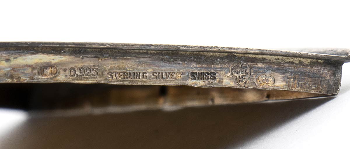di forma rettangolare, il fronte smaltato con una testa di un cane. Argento 925/1000, serie completa di marchi per l'argento in uso a Le Locle dal 1882 al 1934.