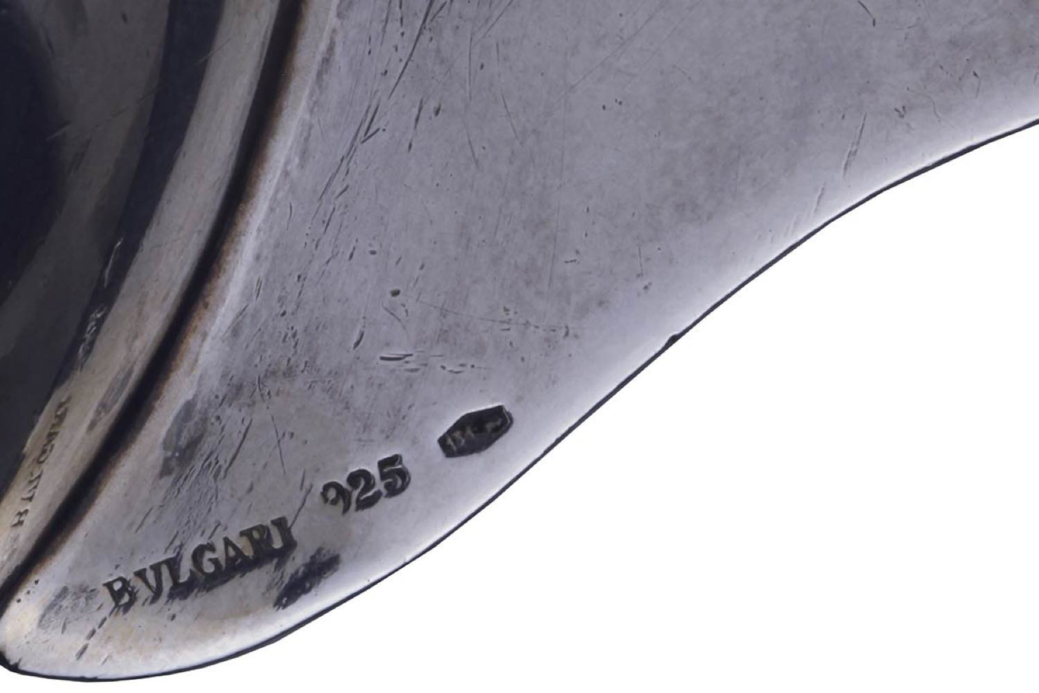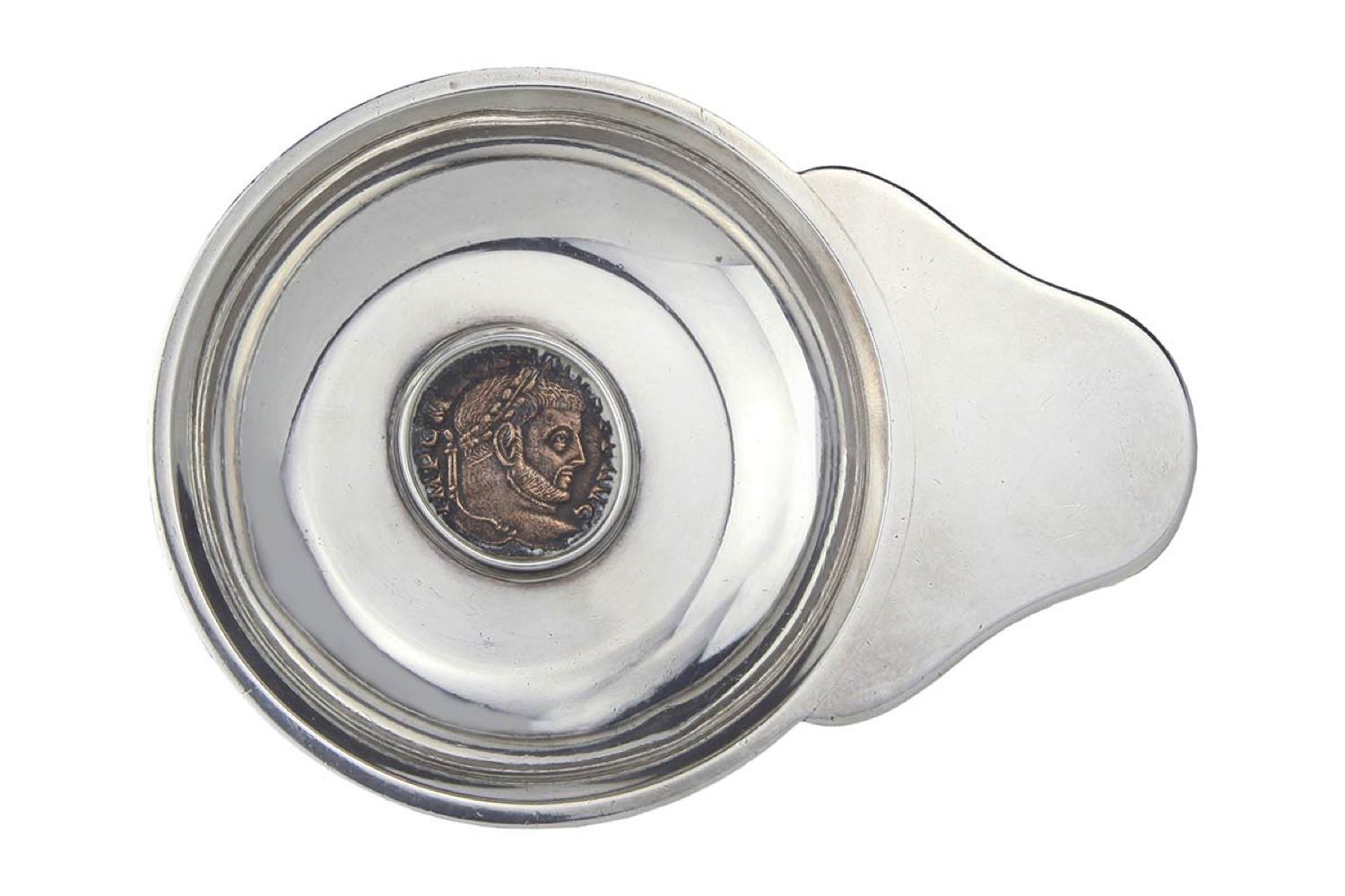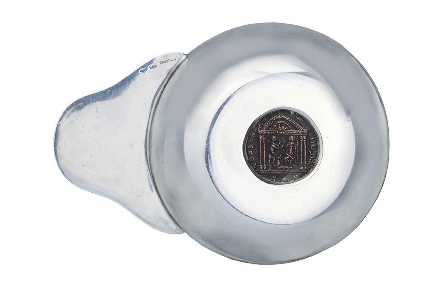 di forma circolare con presa laterale, il fondo incastonato con la seguente moneta: Massenzio (306-312 d.C.) - Follis databile al 307 d.C. Aquileia. Obv/ IMP C MAXENTIVS P F AVG, testa laureata di Massenzio a destra. R/CONSERV VRB SVAE. La dea Roma seduta a sinistra porge un globo a Massenzio che gli sta di fronte; il tutto all'interno di un tempio tetrastilo. Argento 925/1000, punzonato "925 - BVLGARI - ... Roma".