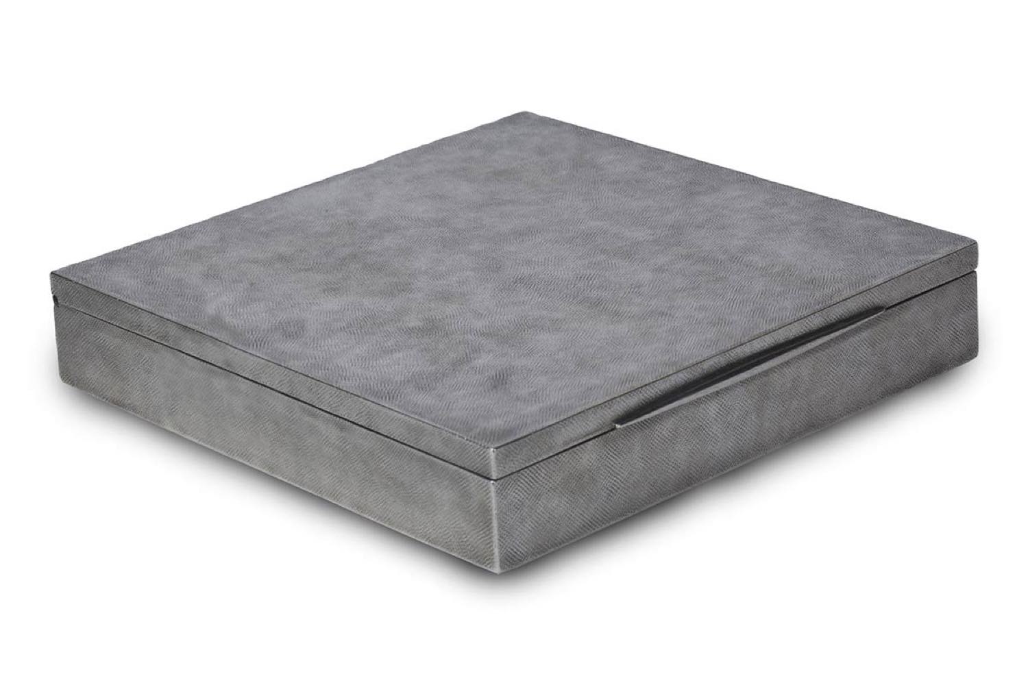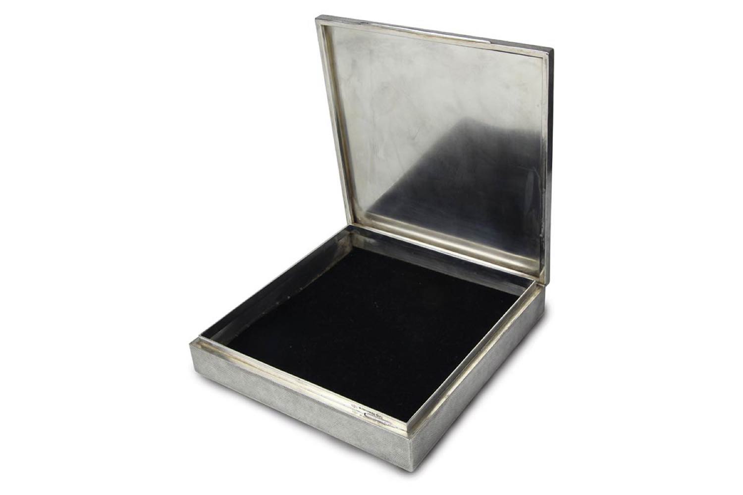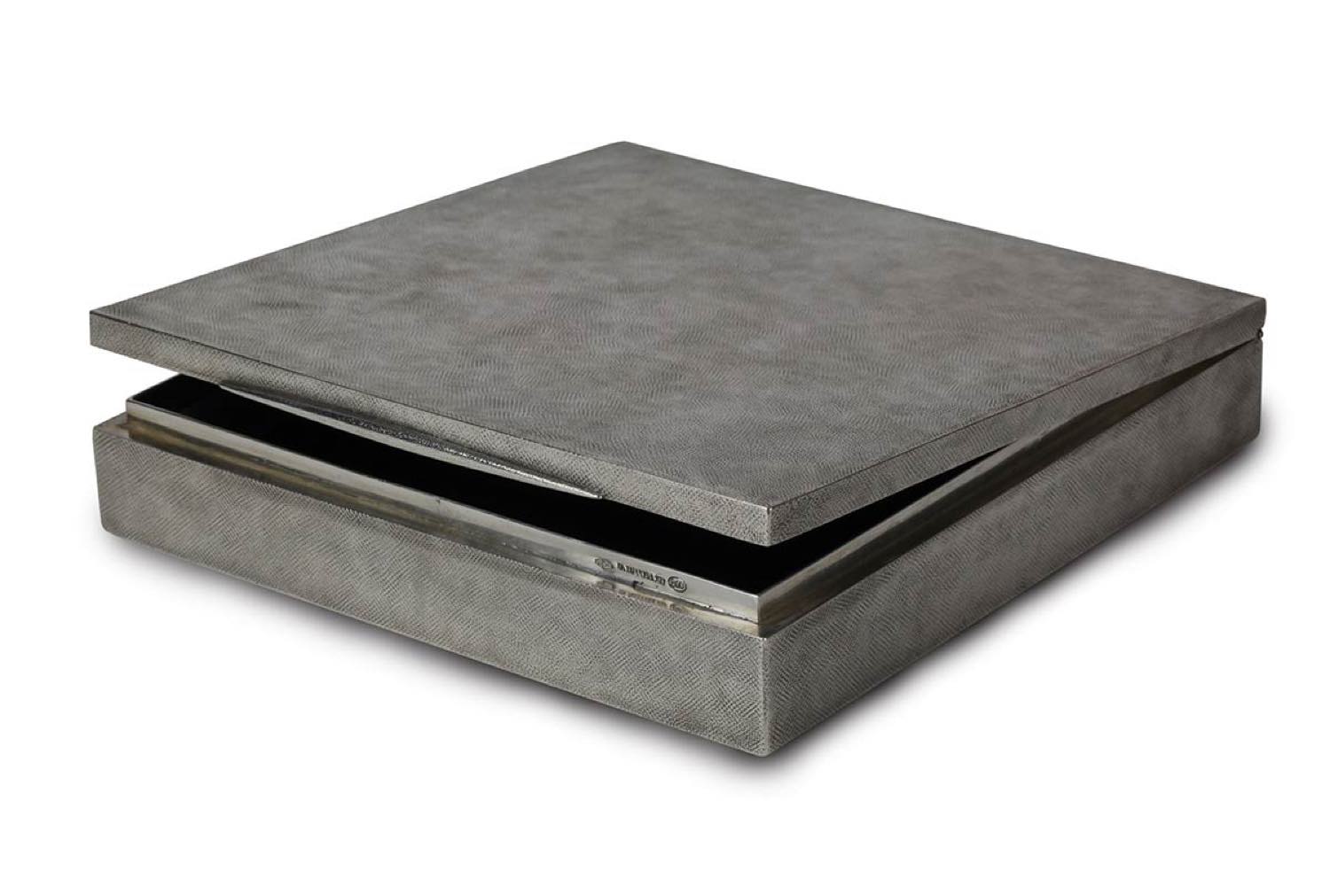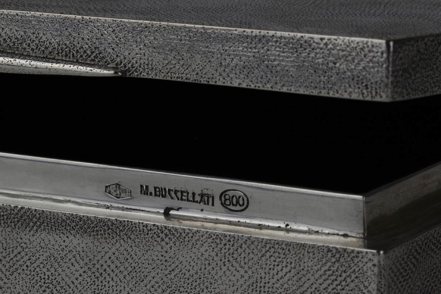 di forma quadrata zigrinata, coperchio incernierato. Argento 800/1000 punzonato "M. BUCCELLATI - 800 - 45 fascio MI".