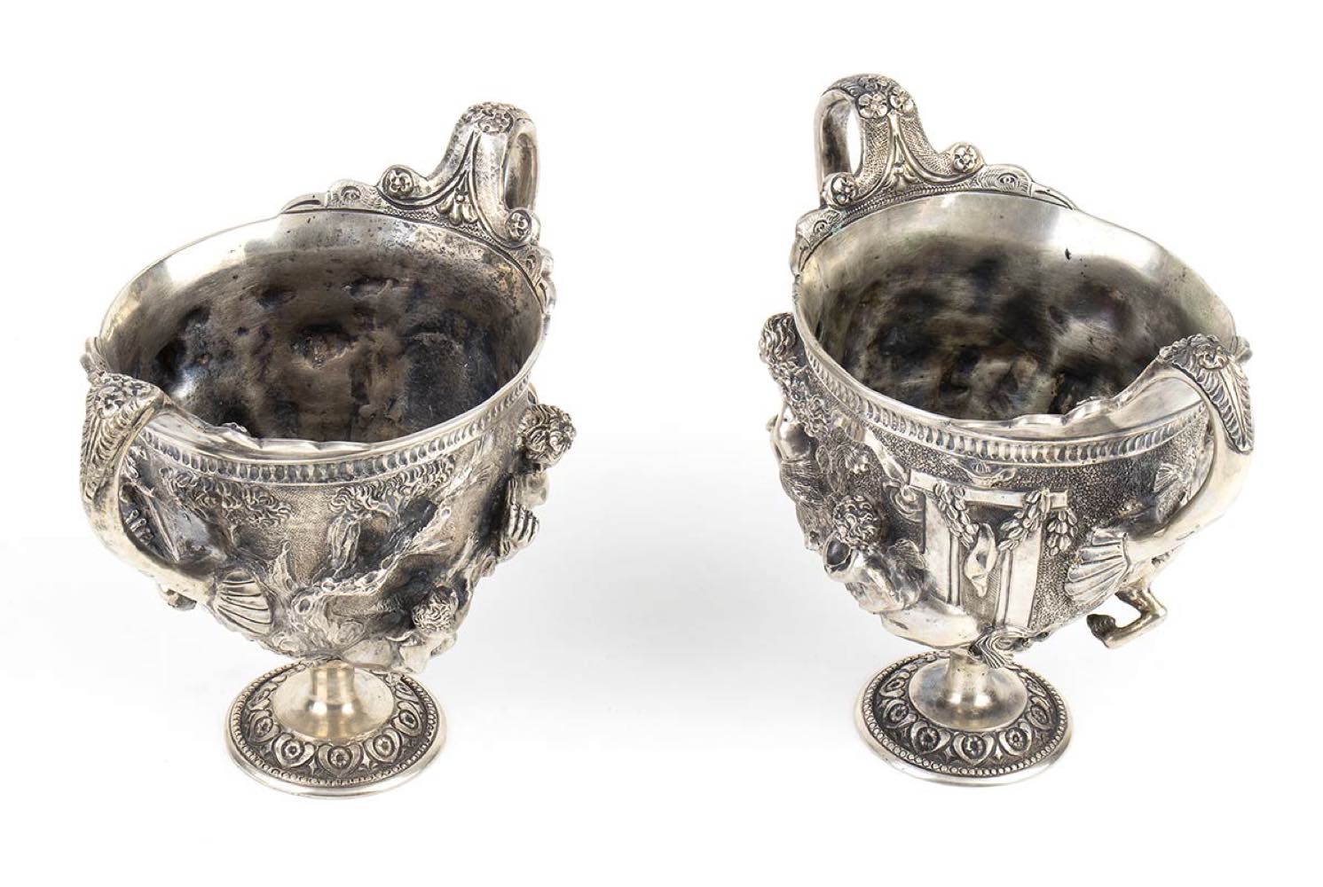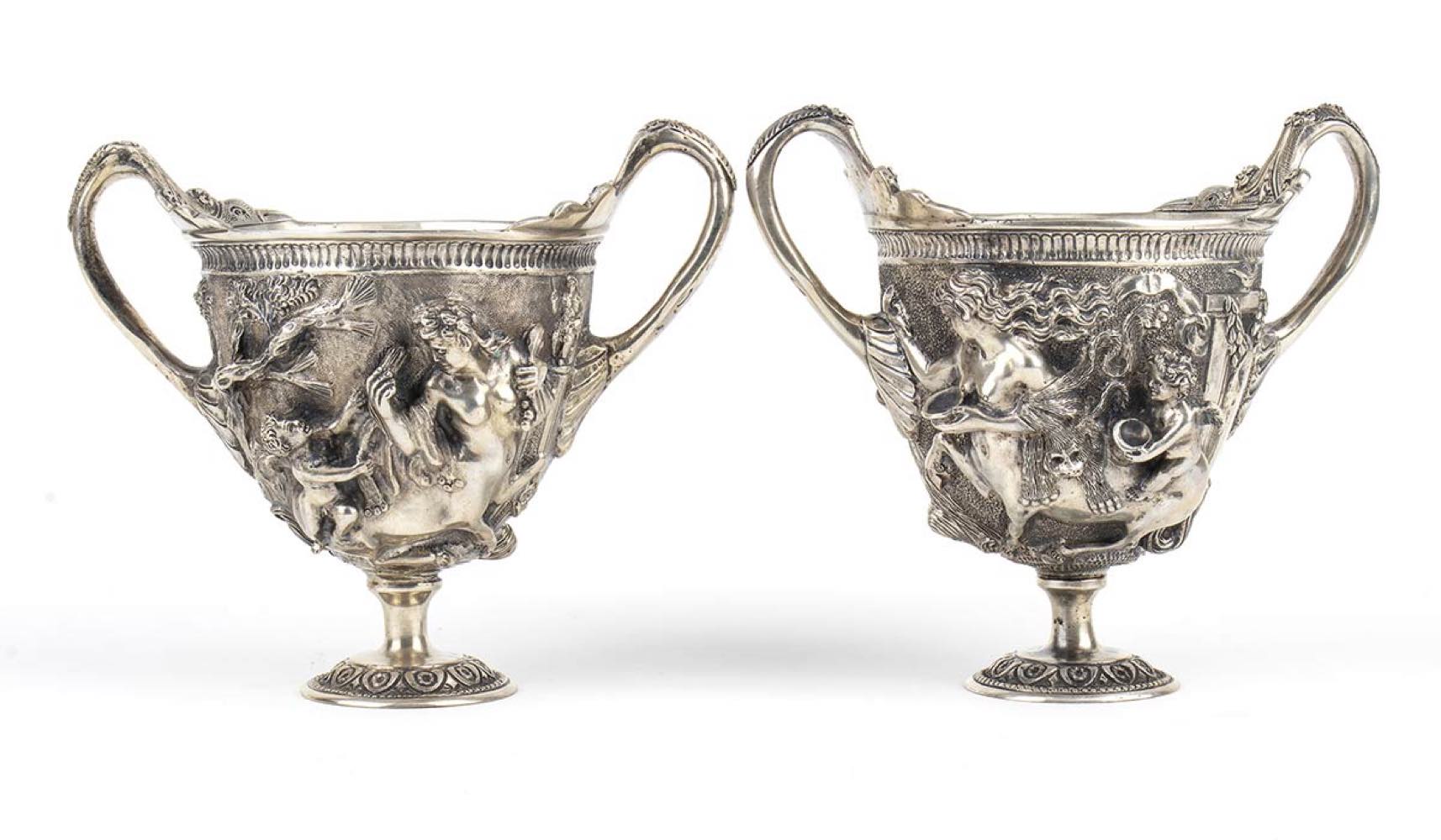 base circolare, biansate, il corpo interamente decorato con scene classiche ad altorilievo. Argento 800/1000, punzonate con i marchi italiani in uso dal 1945 al 1971.