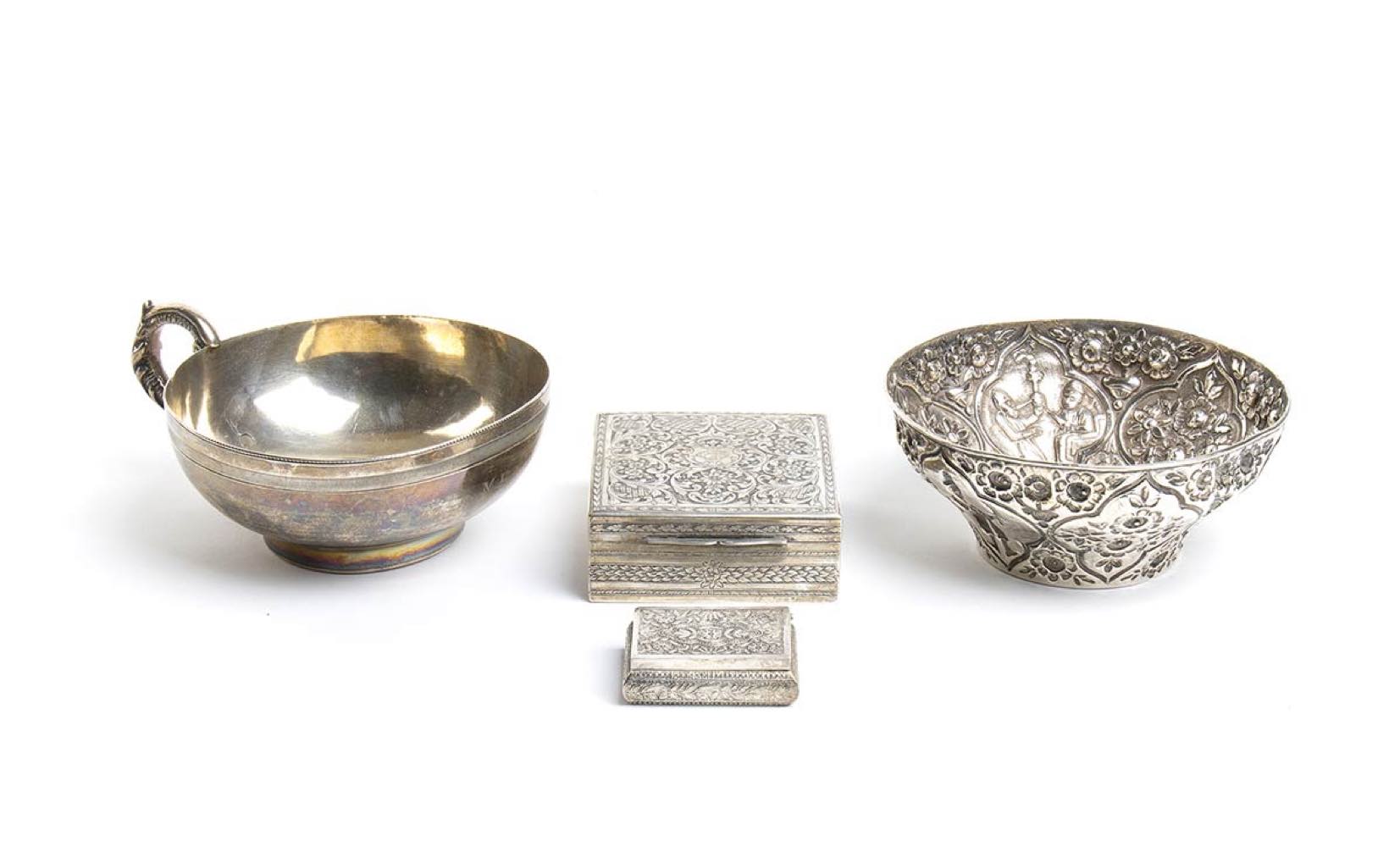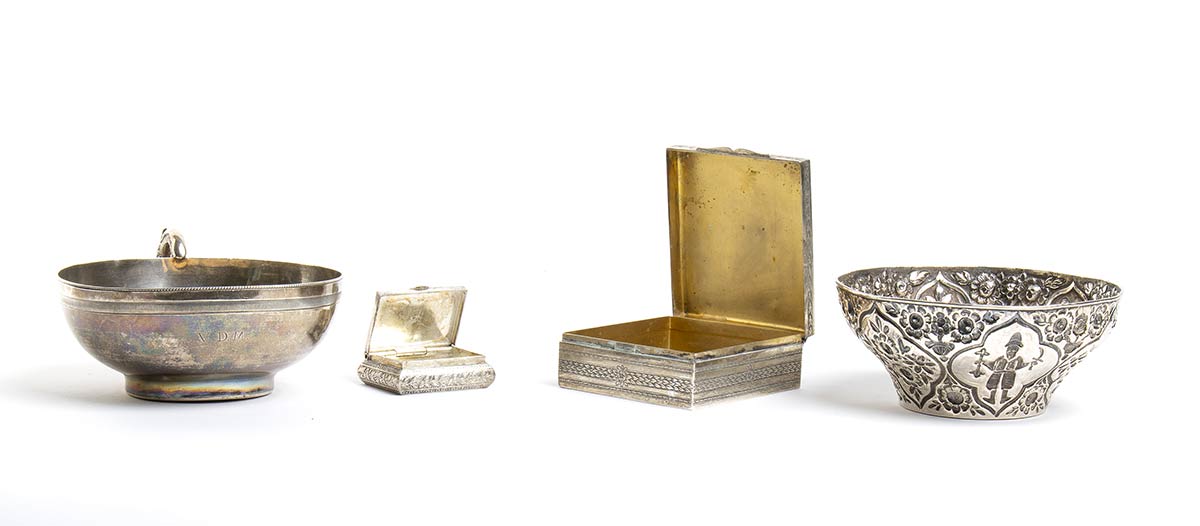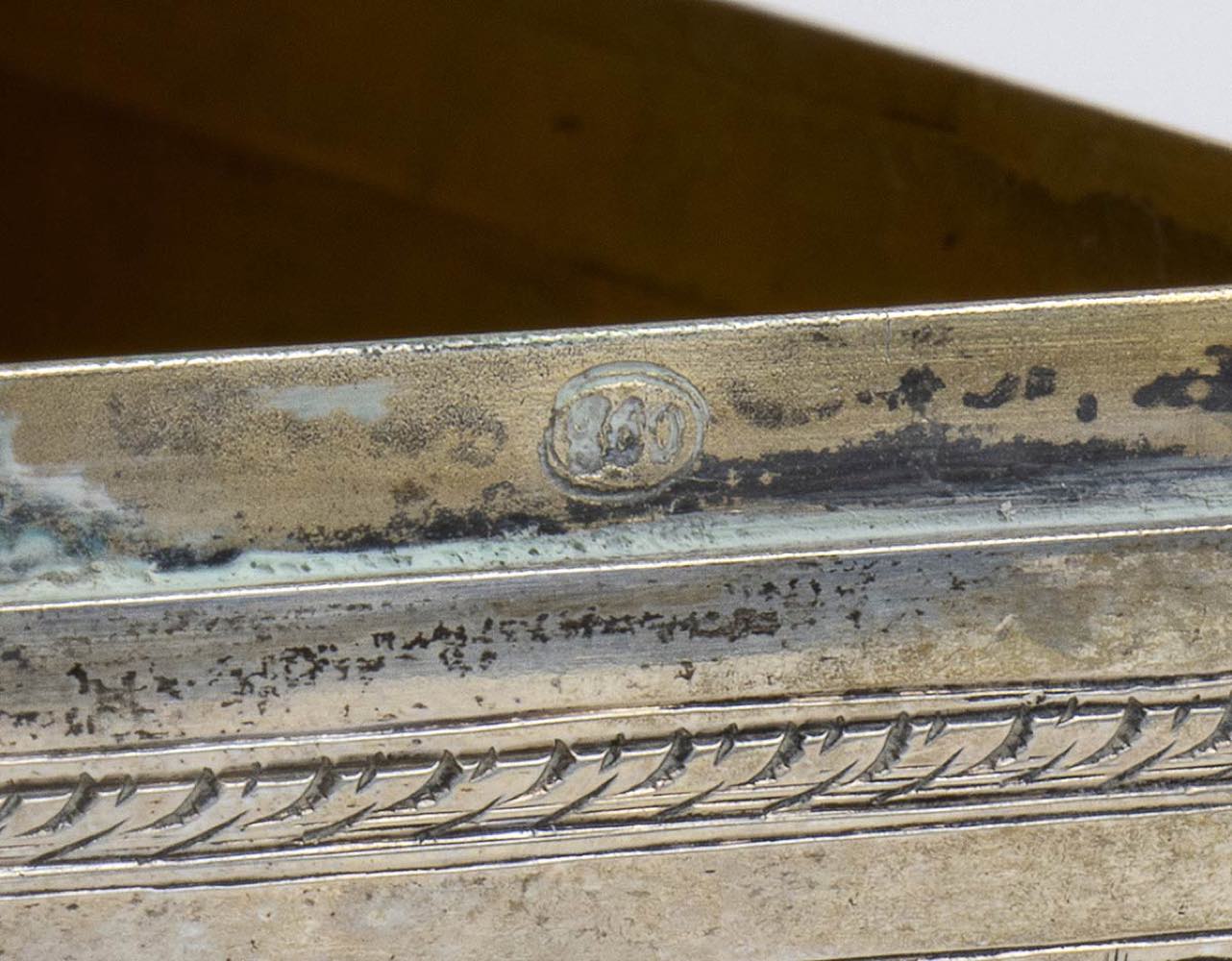 c) scatola rettangolare con coperchio incernierato, interamente incisa a decori vegetali. Punzonata "800".