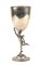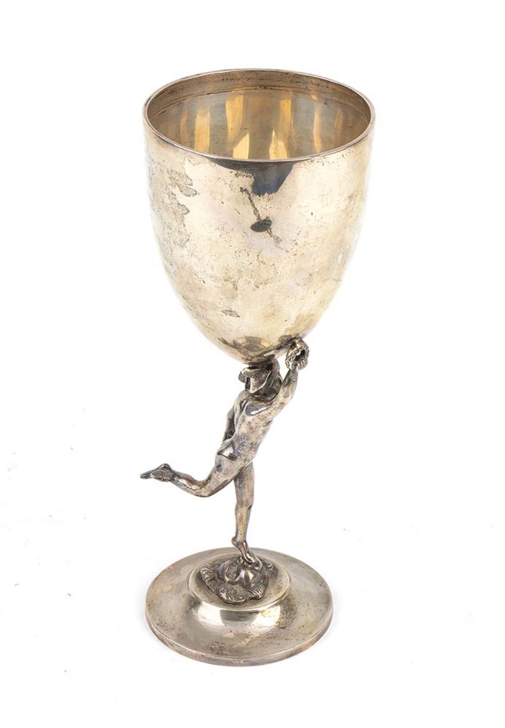 base circolare decorata alla sommità da una testa di putto sulla quale si innesta una figura di Mercurio a tutto tondo; coppa liscia. Argento 925/1000, serie completa di marchi Sheffield 1919-20, argentiere Mappin & Webb Ltd.