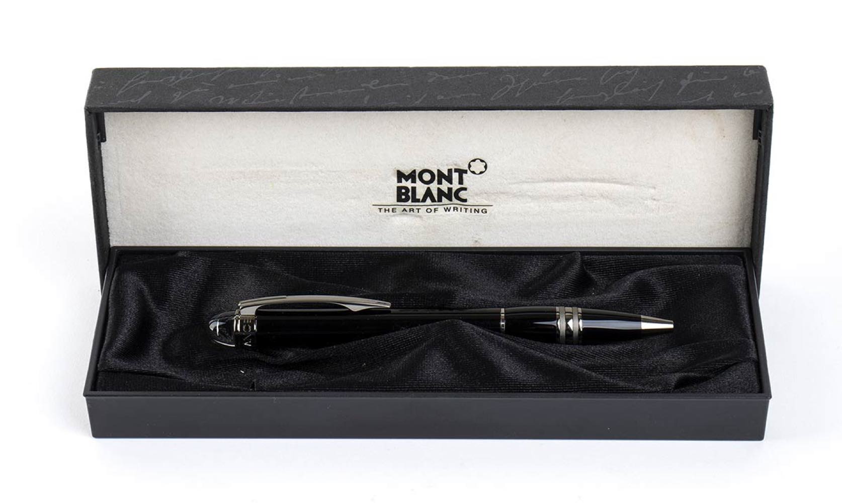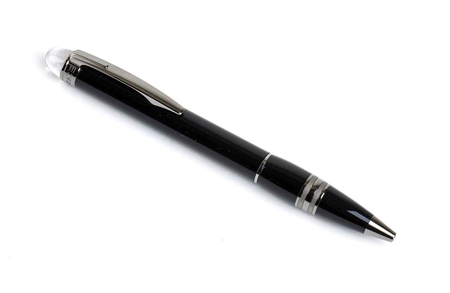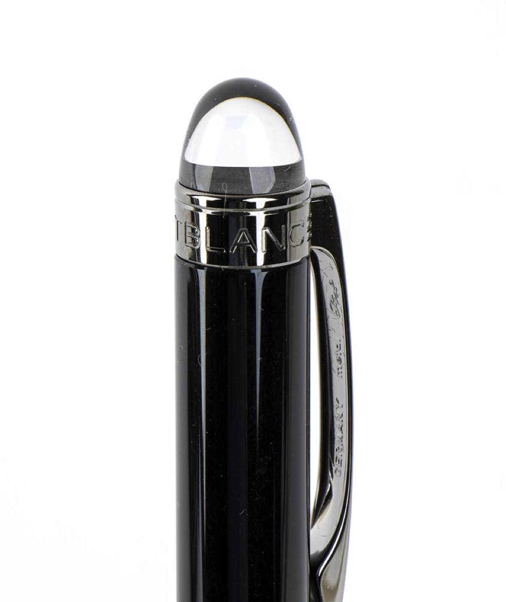 superficie liscia nera con stella Montblanc "fluttuante" nel cap top trasparente, anelli e finiture platinate.