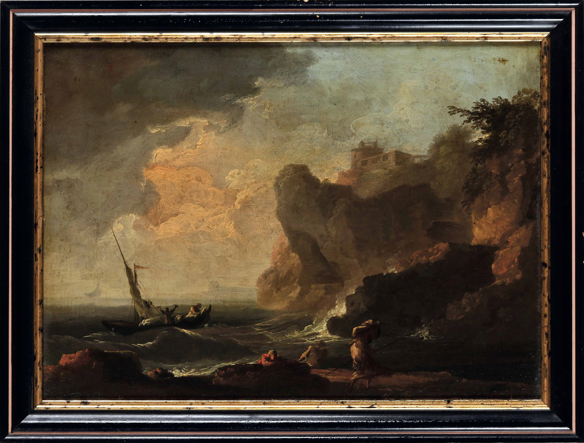 Scuola del XVIII secolo, Vedute costiere con figure e velieri