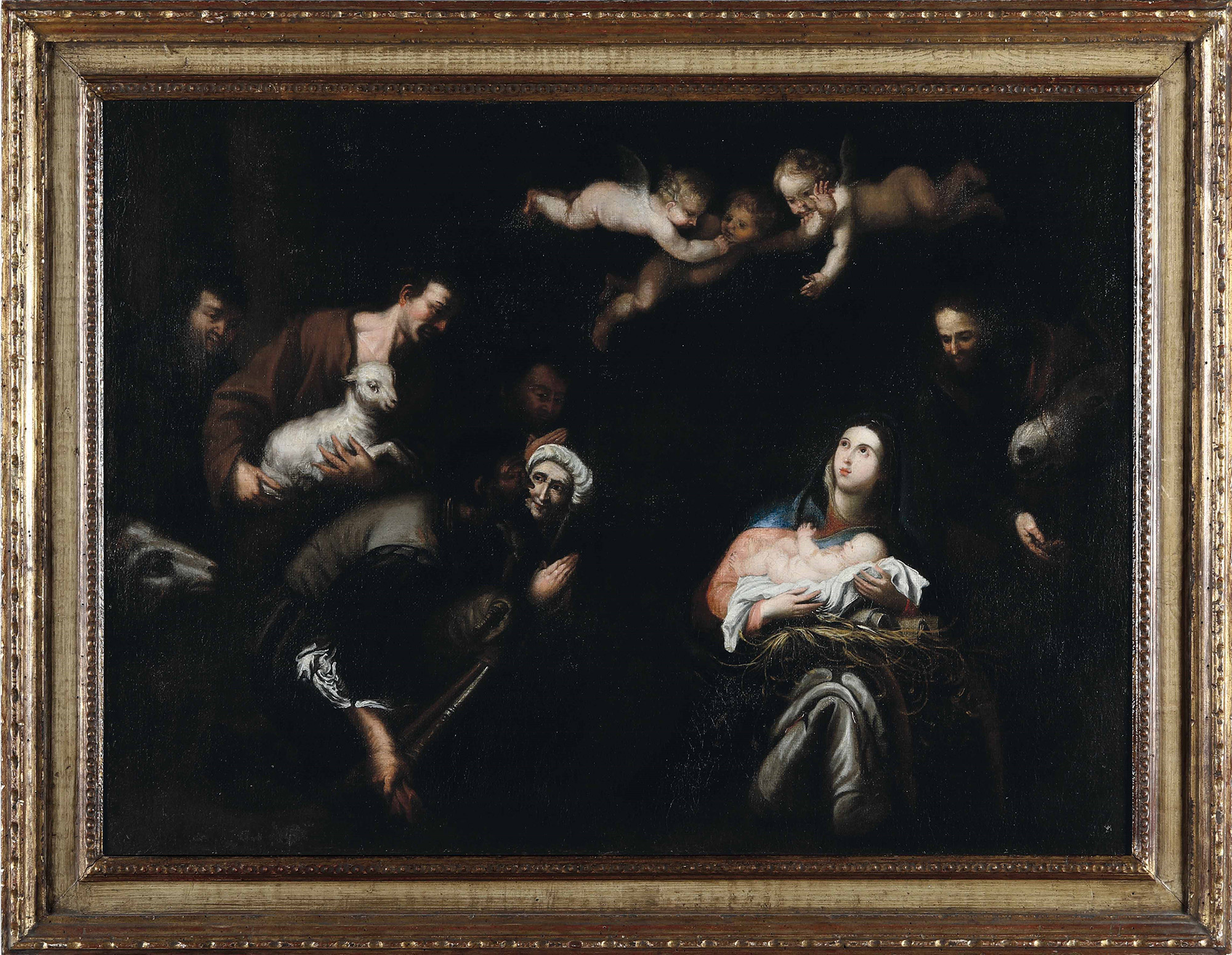 olio su tela, Largh. 85 - Alt. 62 Cm, Expertise Dott.ssa Raffaella Colace, "Questa Adorazione dei pastori è ben rappresentativa del tenebrismo, filone della pittura spagnola seicentesca di matrice caravaggesca. Su un fondo uniforme scuro, le figure si snodano lungo lo spazio orizzontale del quadro, disponendosi su più piani in profondità. Una luce chiara e forte le investe da sinistra, rilevandole più o meno dalla penombra. Apice luministico è, sulla destra, Maria con in grembo il Bambino e con alle spalle Giuseppe, la quale con espressione patetica, volge lo sguardo in alto dove tre putti si librano sospesi nell'aria." , Expertise Dott.ssa Raffaella Colace
